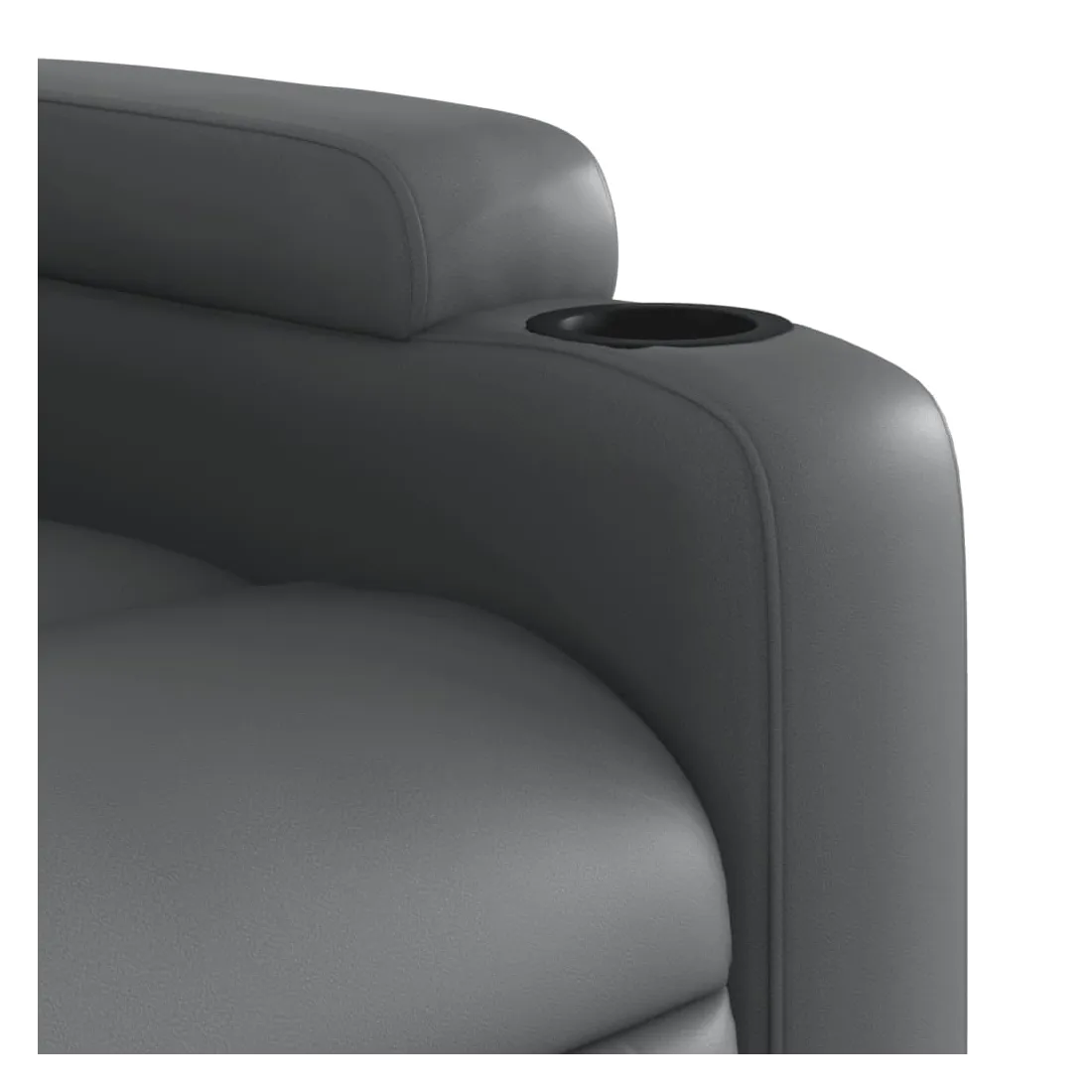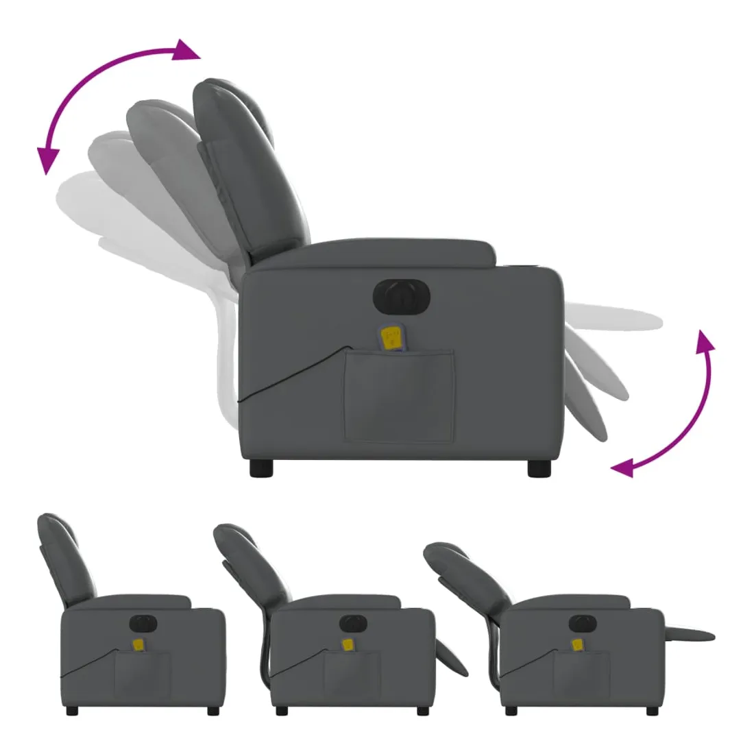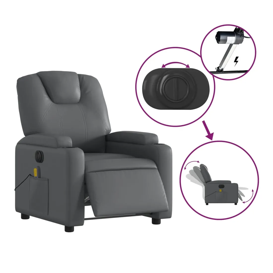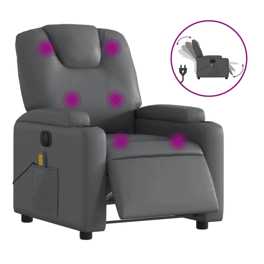 Asseyez-vous et détendez-vous dans ce fauteuil inclinable de massage électrique très confortable ! Fonction d'inclinaison électrique : ce fauteuil inclinable est équipé d'un moteur électrique qui permet de régler automatiquement le repose-pied et le dossier dans n'importe quelle position, selon votre confort, en appuyant simplement sur le bouton situé sur le côté du fauteuil. Cette fonction permet une inclinaison maximale de 135 degrés. En outre, le dossier peut revenir automatiquement à sa position d'origine par une simple pression sur le bouton.Fonction de vibration : les 6 points de massage vous permettent de faire l'expérience d'un massage mieux ciblé. De plus, la télécommande incluse vous permet de choisir différents programmes de massage. La fonction de massage est alimentée par le connecteur USB qui nécessite une source d'alimentation USB certifiée de 5 V (non fournie).Expérience de siège confortable : le siège, le dossier et les larges accoudoirs rembourrés épais recouverts de similicuir procurent une sensation confortable, vous faisant vous sentir enlacé lorsque vous êtes assis. Le similicuir est un matériau très résistant. Il est résistant aux taches, ce qui le rend facile à nettoyer avec un chiffon humide. La surface lisse donne également un aspect luxueux et la beauté du cuir véritable.Porte-gobelets et poche latérale pratiques : ce fauteuil dispose de deux porte-gobelets pratiques pour vos boissons et d'une poche latérale pour votre télécommande ou pour garder vos objets essentiels à portée de main.Cadre solide et stable : le cadre en bois et en métal offre une structure solide et une grande stabilité. Ce fauteuil inclinable est confortable et durable.