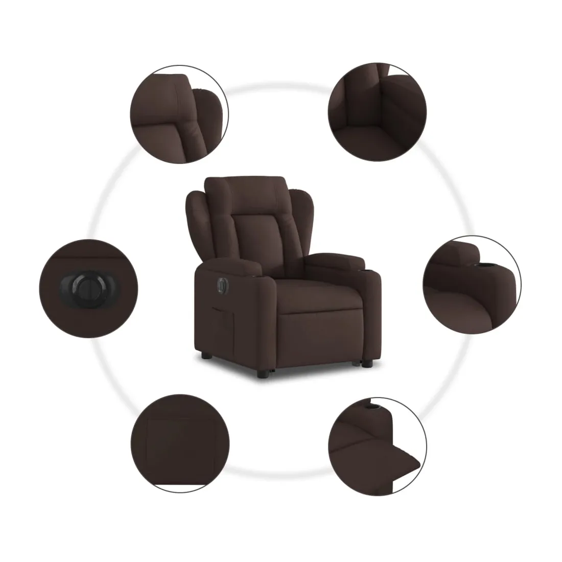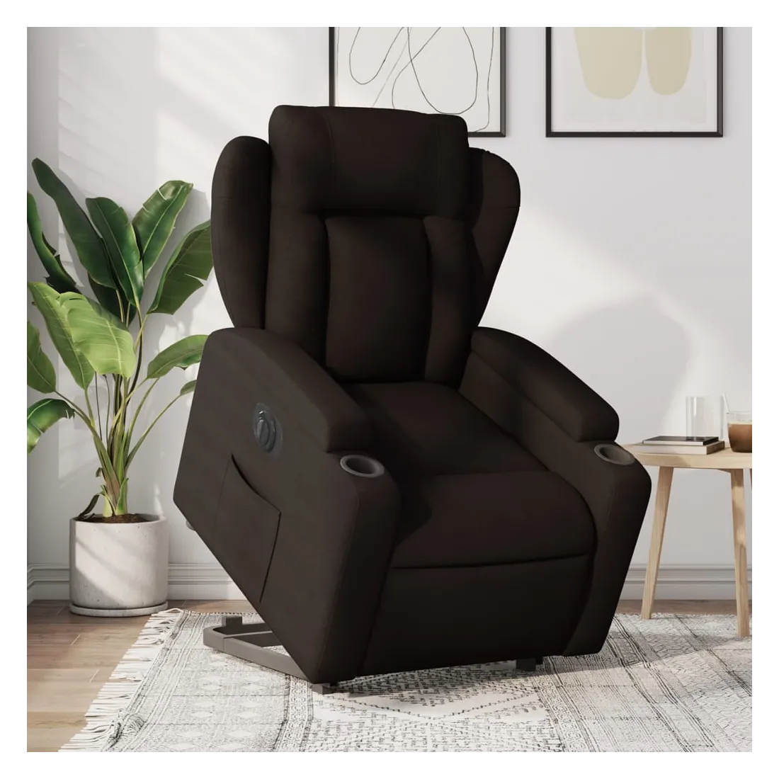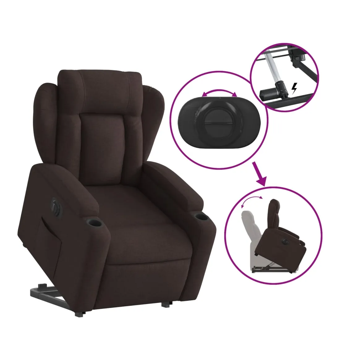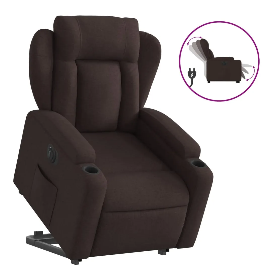 Asseyez-vous et détendez-vous dans ce fauteuil inclinable électrique très confortable ! Fonction de levage électrique : ce fauteuil inclinable pour personnes âgées est équipé d'un moteur électrique pour la fonction de levage. Grâce à la fonction qui pousse toute la chaise vers le haut, vous pouvez facilement vous tenir debout sans stresser votre dos et vos genoux en appuyant simplement sur le bouton.Fonction d'inclinaison électrique : ce fauteuil inclinable est également équipé d'un moteur électrique qui permet de régler automatiquement le repose-pied et le dossier dans n'importe quelle position, selon votre confort, en appuyant simplement sur le bouton situé sur le côté du fauteuil. Cette fonction permet une inclinaison maximale de 135 degrés. En outre, le dossier peut revenir automatiquement à sa position d'origine par une simple pression sur le bouton.Expérience d'assise confortable : le siège, le dossier et les larges accoudoirs bien rembourrés recouverts de tissu procurent une sensation confortable et chaleureuse, vous permettant de vous sentir enveloppé lorsque vous êtes assis. Le tissu présente un aspect simple et épuré et est respirant et durable.Porte-gobelets et poche latérale pratiques : ce fauteuil dispose de deux porte-gobelets pratiques pour vos boissons et d'une poche latérale pour garder vos objets essentiels à portée de main.Cadre solide et stable : le cadre en bois et en métal offre une structure solide et une grande stabilité. Ce fauteuil inclinable est confortable et durable.