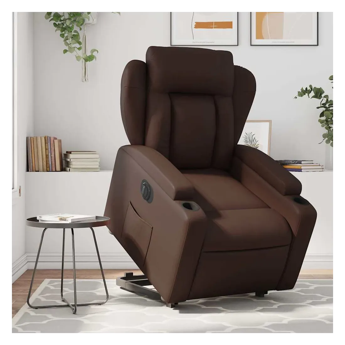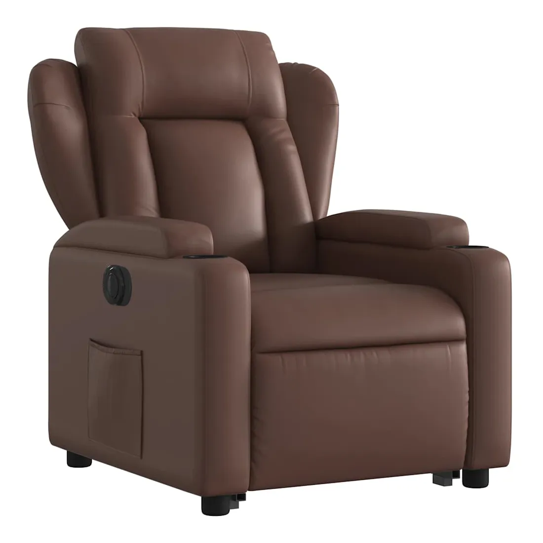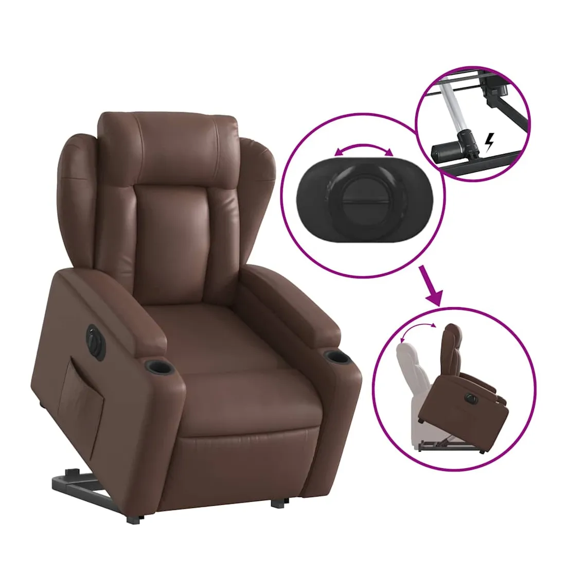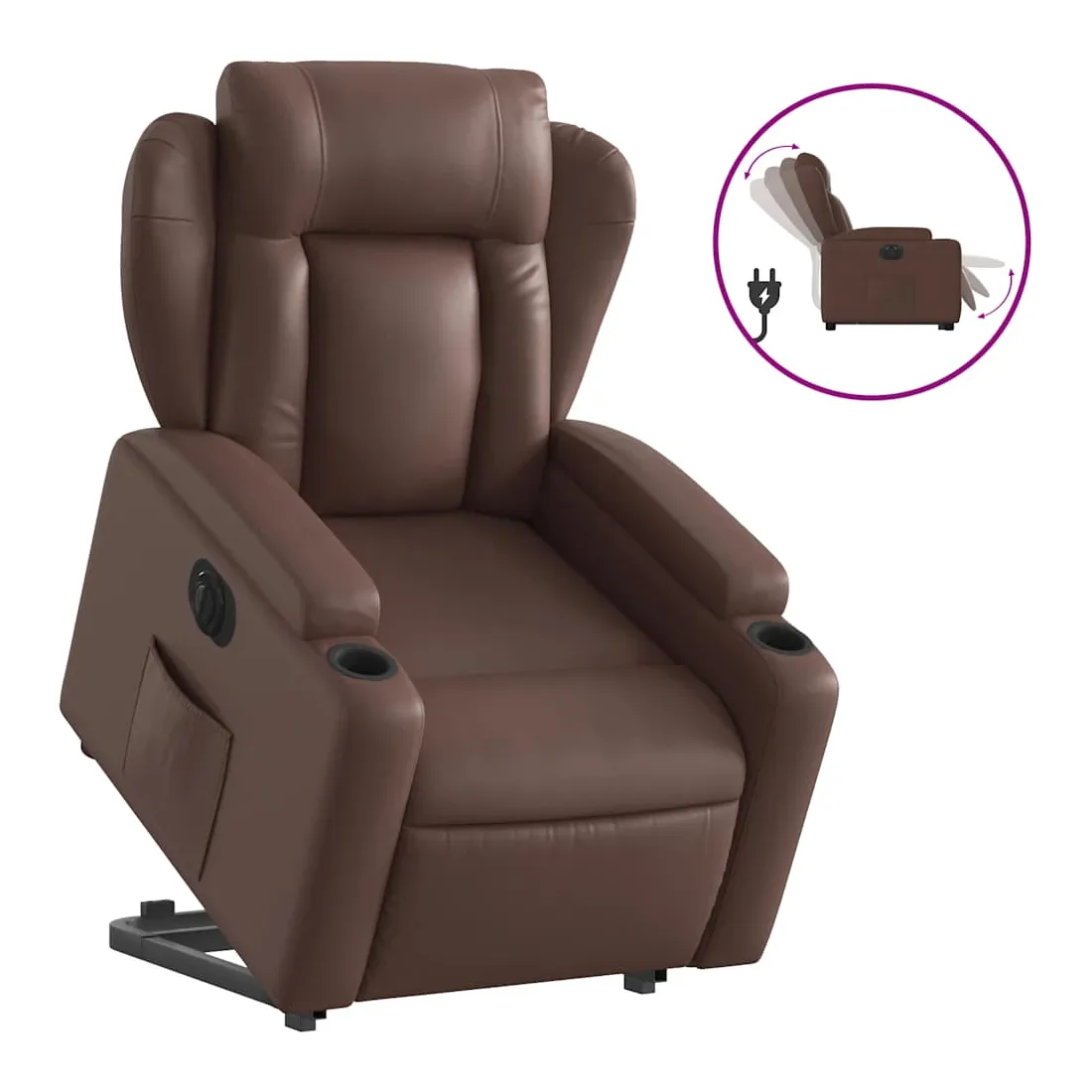 Asseyez-vous et détendez-vous dans ce fauteuil inclinable électrique très confortable ! Fonction de levage électrique : ce fauteuil inclinable pour personnes âgées est équipé d'un moteur électrique pour la fonction de levage. Grâce à la fonction qui pousse toute la chaise vers le haut, vous pouvez facilement vous tenir debout sans stresser votre dos et vos genoux en appuyant simplement sur le bouton.Fonction d'inclinaison électrique : ce fauteuil inclinable est également équipé d'un moteur électrique qui permet de régler automatiquement le repose-pied et le dossier dans n'importe quelle position, selon votre confort, en appuyant simplement sur le bouton situé sur le côté du fauteuil. Cette fonction permet une inclinaison maximale de 135 degrés. En outre, le dossier peut revenir automatiquement à sa position d'origine par une simple pression sur le bouton.Expérience de siège confortable : le siège, le dossier et les larges accoudoirs rembourrés épais recouverts de similicuir procurent une sensation confortable, vous faisant vous sentir enlacé lorsque vous êtes assis. Le similicuir est un matériau très résistant. Il est résistant aux taches, ce qui le rend facile à nettoyer avec un chiffon humide. La surface lisse donne également un aspect luxueux et la beauté du cuir véritable.Porte-gobelets et poche latérale pratiques : ce fauteuil dispose de deux porte-gobelets pratiques pour vos boissons et d'une poche latérale pour garder vos objets essentiels à portée de main.Cadre solide et stable : le cadre en bois et en métal offre une structure solide et une grande stabilité. Ce fauteuil inclinable est confortable et durable.