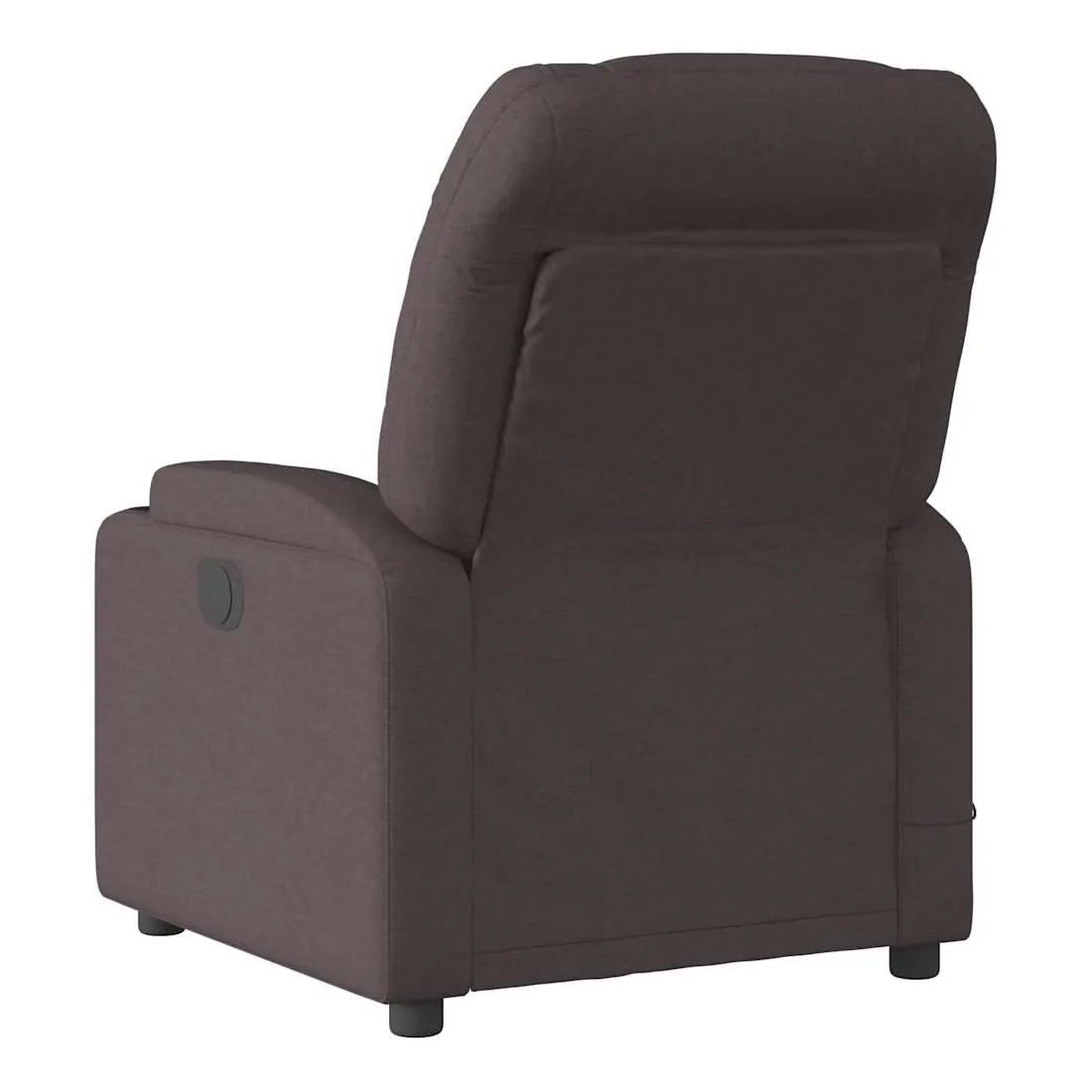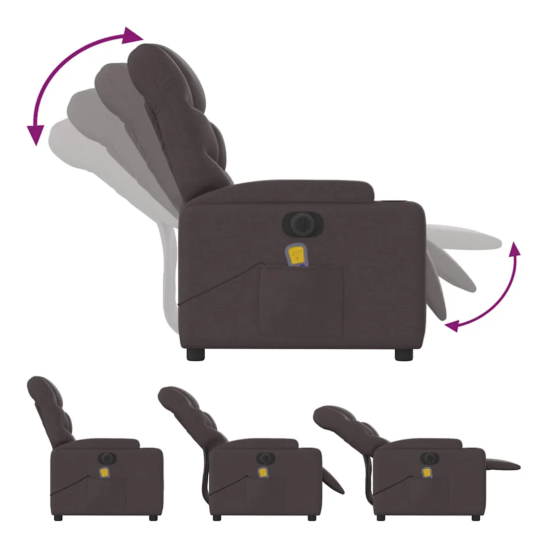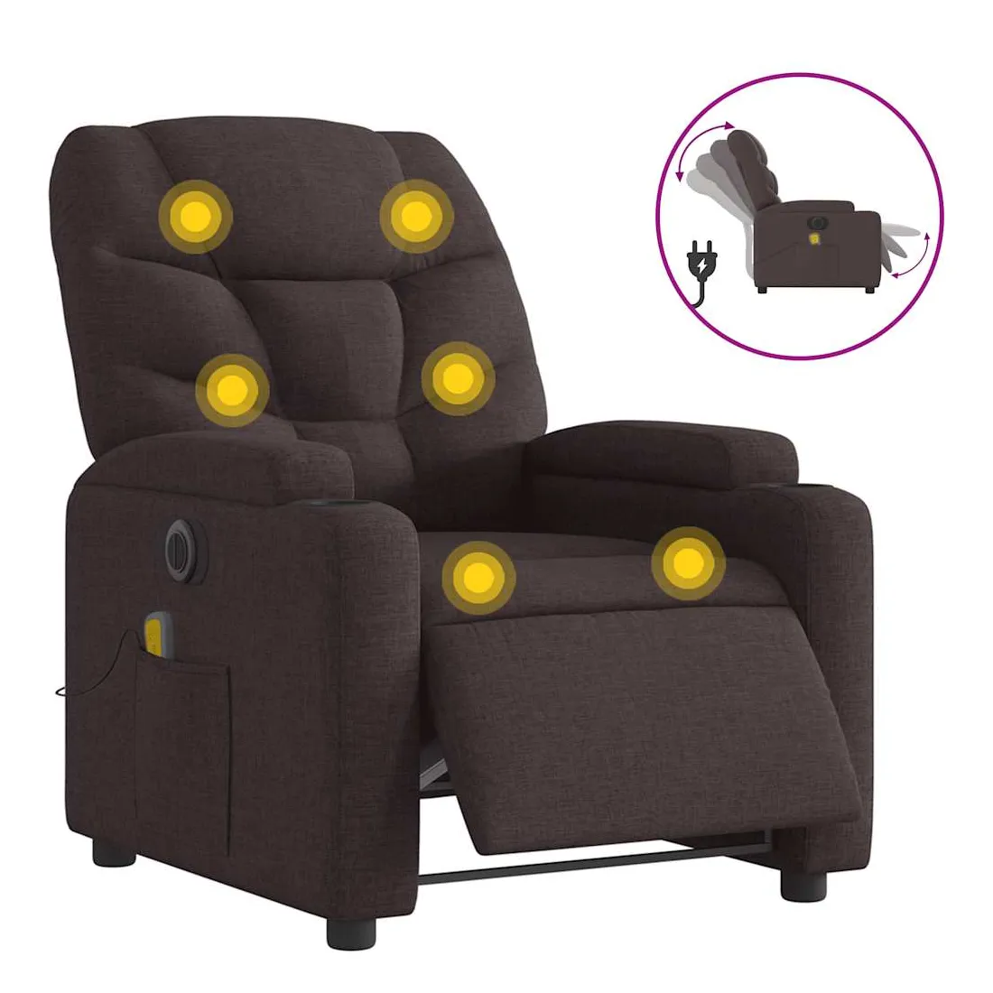 Asseyez-vous et détendez-vous dans ce fauteuil inclinable de massage électrique très confortable ! Fonction d'inclinaison électrique : ce fauteuil inclinable est équipé d'un moteur électrique qui permet de régler automatiquement le repose-pied et le dossier dans n'importe quelle position, selon votre confort, en appuyant simplement sur le bouton situé sur le côté du fauteuil. Cette fonction permet une inclinaison maximale de 135 degrés. En outre, le dossier peut revenir automatiquement à sa position d'origine par une simple pression sur le bouton.Fonction de vibration : les 6 points de massage vous permettent de faire l'expérience d'un massage mieux ciblé. De plus, la télécommande incluse vous permet de choisir différents programmes de massage. La fonction de massage est alimentée par le connecteur USB qui nécessite une source d'alimentation USB certifiée de 5 V (non fournie).Expérience d'assise confortable : le siège, le dossier et les larges accoudoirs bien rembourrés recouverts de tissu procurent une sensation confortable et chaleureuse, vous permettant de vous sentir enveloppé lorsque vous êtes assis. Le tissu présente un aspect simple et épuré et est respirant et durable.Porte-gobelets et poche latérale pratiques : ce fauteuil dispose de deux porte-gobelets pratiques pour vos boissons et d'une poche latérale pour garder vos objets essentiels à portée de main.Cadre solide et stable : le cadre en bois et en métal offre une structure solide et une grande stabilité. Ce fauteuil inclinable est confortable et durable.