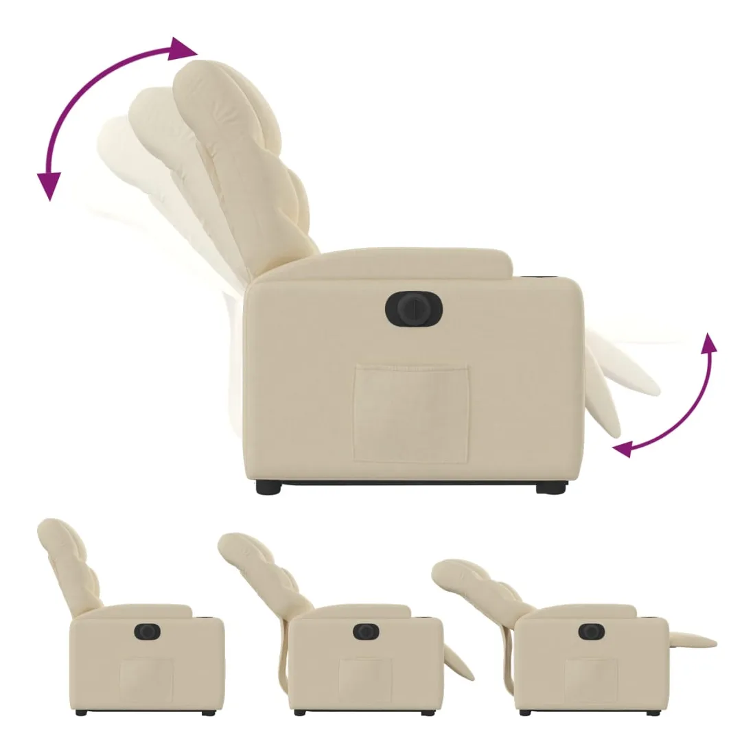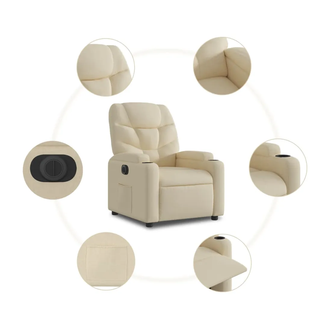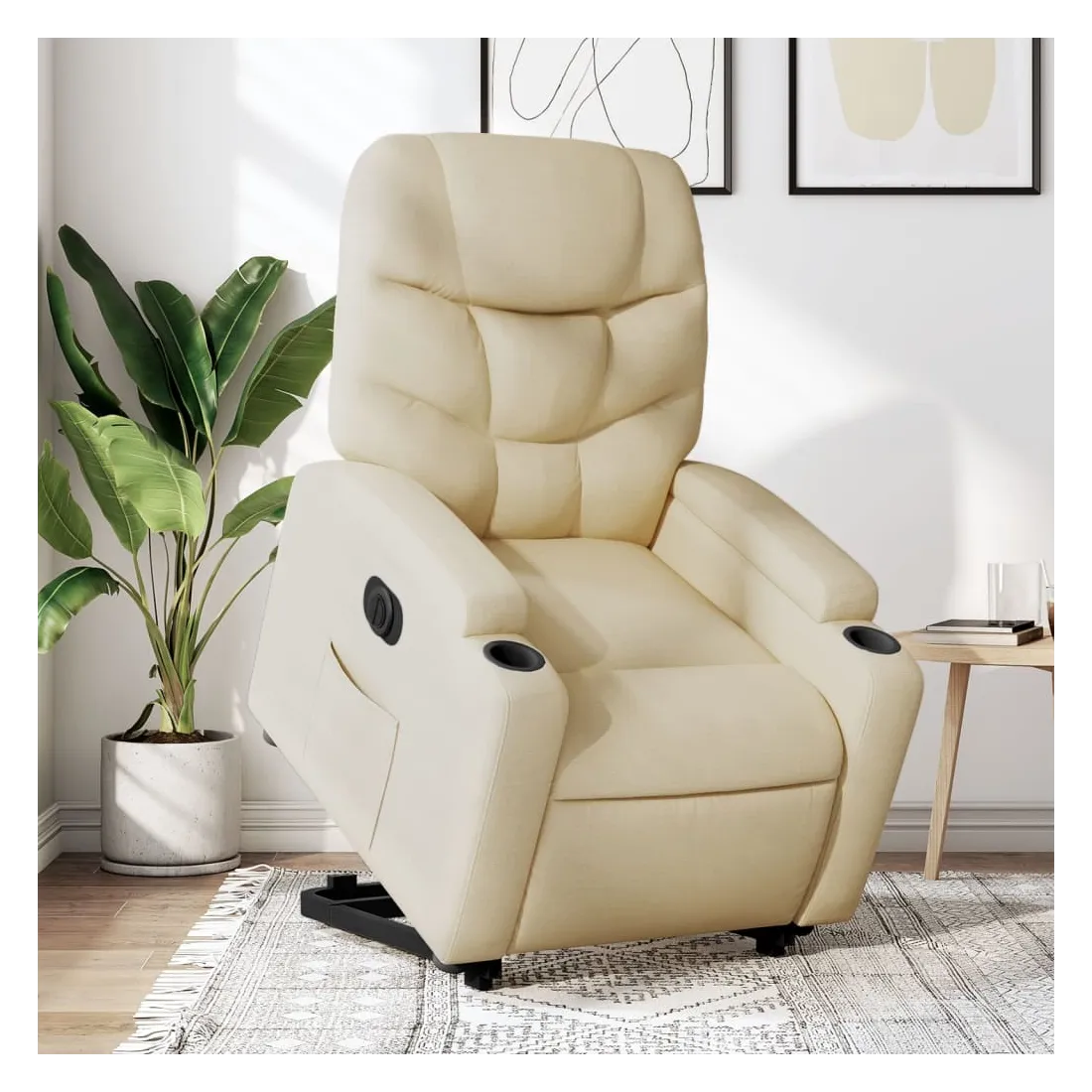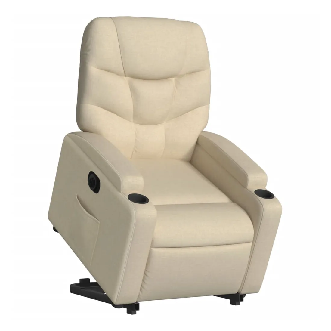 Asseyez-vous et détendez-vous dans ce fauteuil inclinable électrique très confortable ! Fonction de levage électrique : ce fauteuil inclinable pour personnes âgées est équipé d'un moteur électrique pour la fonction de levage. Grâce à la fonction qui pousse toute la chaise vers le haut, vous pouvez facilement vous tenir debout sans stresser votre dos et vos genoux en appuyant simplement sur le bouton.Fonction d'inclinaison électrique : ce fauteuil inclinable est également équipé d'un moteur électrique qui permet de régler automatiquement le repose-pied et le dossier dans n'importe quelle position, selon votre confort, en appuyant simplement sur le bouton situé sur le côté du fauteuil. Cette fonction permet une inclinaison maximale de 135 degrés. En outre, le dossier peut revenir automatiquement à sa position d'origine par une simple pression sur le bouton.Expérience d'assise confortable : le siège, le dossier et les larges accoudoirs bien rembourrés recouverts de tissu procurent une sensation confortable et chaleureuse, vous permettant de vous sentir enveloppé lorsque vous êtes assis. Le tissu présente un aspect simple et épuré et est respirant et durable.Porte-gobelets et poche latérale pratiques : ce fauteuil dispose de deux porte-gobelets pratiques pour vos boissons et d'une poche latérale pour garder vos objets essentiels à portée de main.Cadre solide et stable : le cadre en bois et en métal offre une structure solide et une grande stabilité. Ce fauteuil inclinable est confortable et durable.