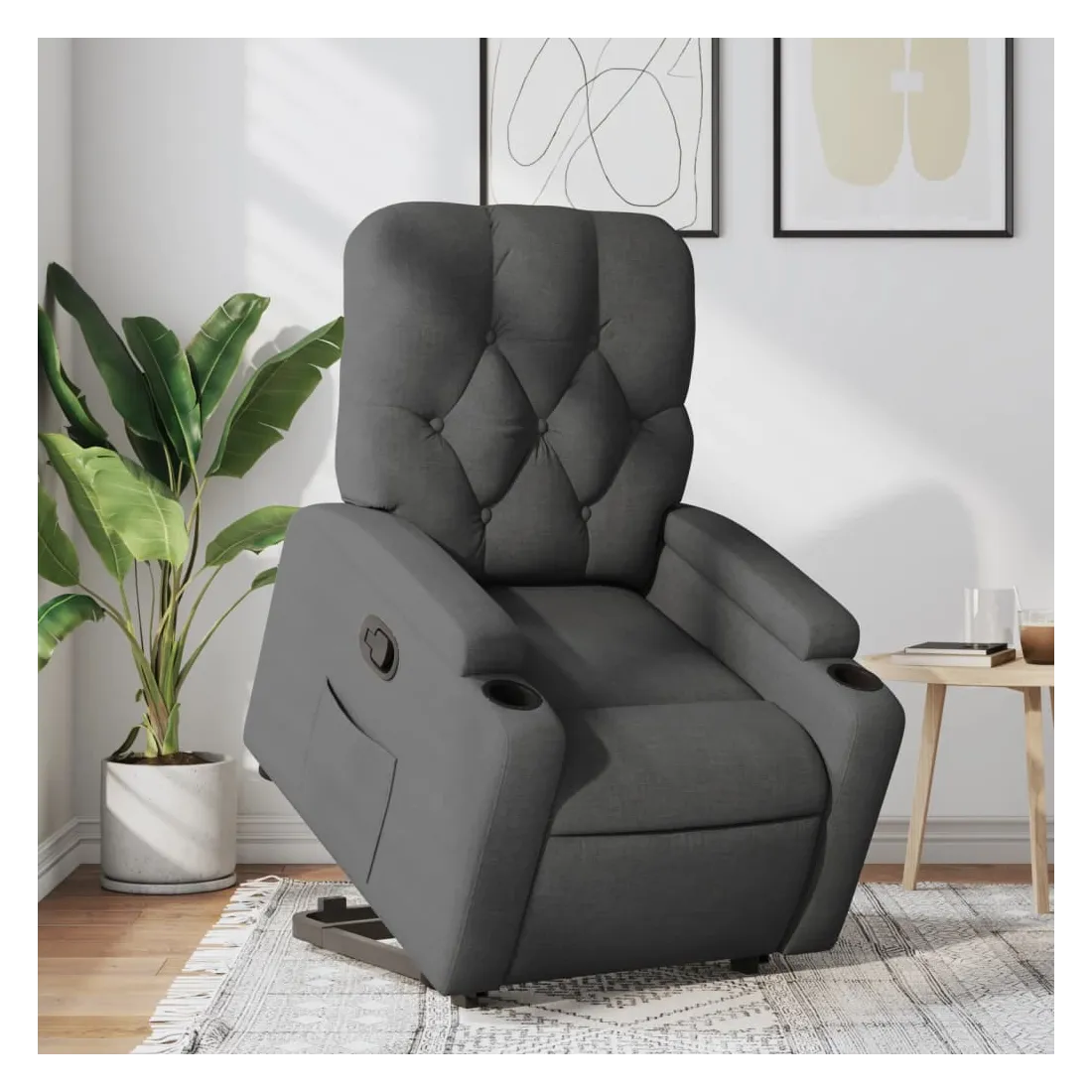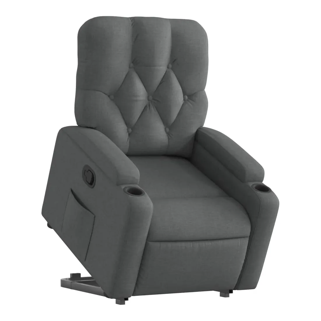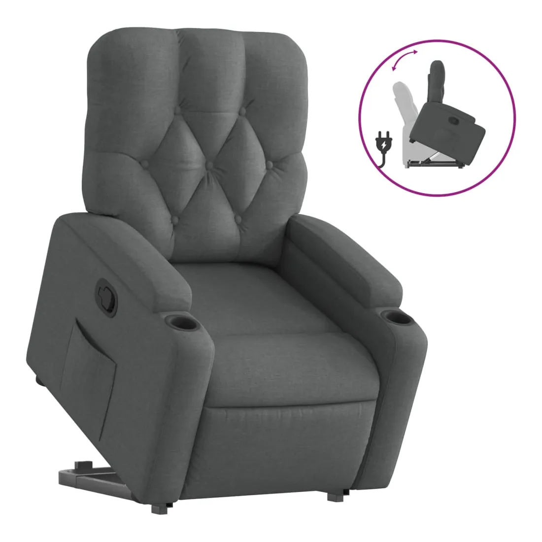 Asseyez-vous et détendez-vous dans ce fauteuil inclinable très confortable ! Fonction de levage électrique : ce fauteuil inclinable pour personnes âgées est équipé d'un moteur électrique pour la fonction de levage. Grâce à la fonction qui pousse toute la chaise vers le haut, vous pouvez facilement vous tenir debout sans stresser votre dos et vos genoux en appuyant simplement sur le bouton.Fonction d'inclinaison manuelle : ce fauteuil inclinable est doté d'une poignée du côté droit. Vous pouvez régler manuellement le repose-pieds et le dossier dans n'importe quelle position selon votre confort en tirant simplement sur la poignée. Cette fonction permet une inclinaison maximale de 135 degrés. De plus, le dossier peut revenir rapidement à sa position d'origine en tirant simplement sur la poignée.Expérience d'assise confortable : le siège, le dossier et les larges accoudoirs bien rembourrés recouverts de tissu procurent une sensation confortable et chaleureuse, vous permettant de vous sentir enveloppé lorsque vous êtes assis. Le tissu présente un aspect simple et épuré et est respirant et durable.Porte-gobelets et poche latérale pratiques : ce fauteuil dispose de deux porte-gobelets pratiques pour vos boissons et d'une poche latérale pour garder vos objets essentiels à portée de main.Cadre solide et stable : le cadre en bois et en métal offre une structure solide et une grande stabilité. Ce fauteuil inclinable est confortable et durable.