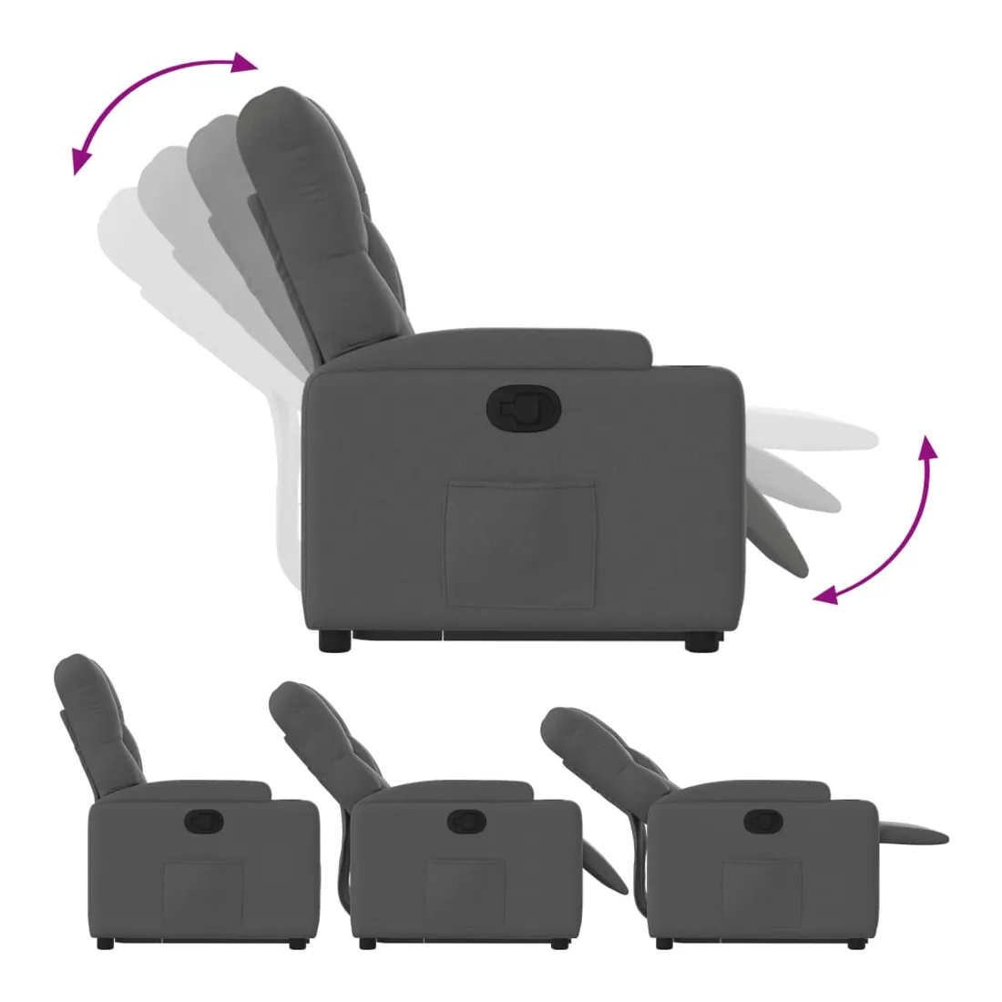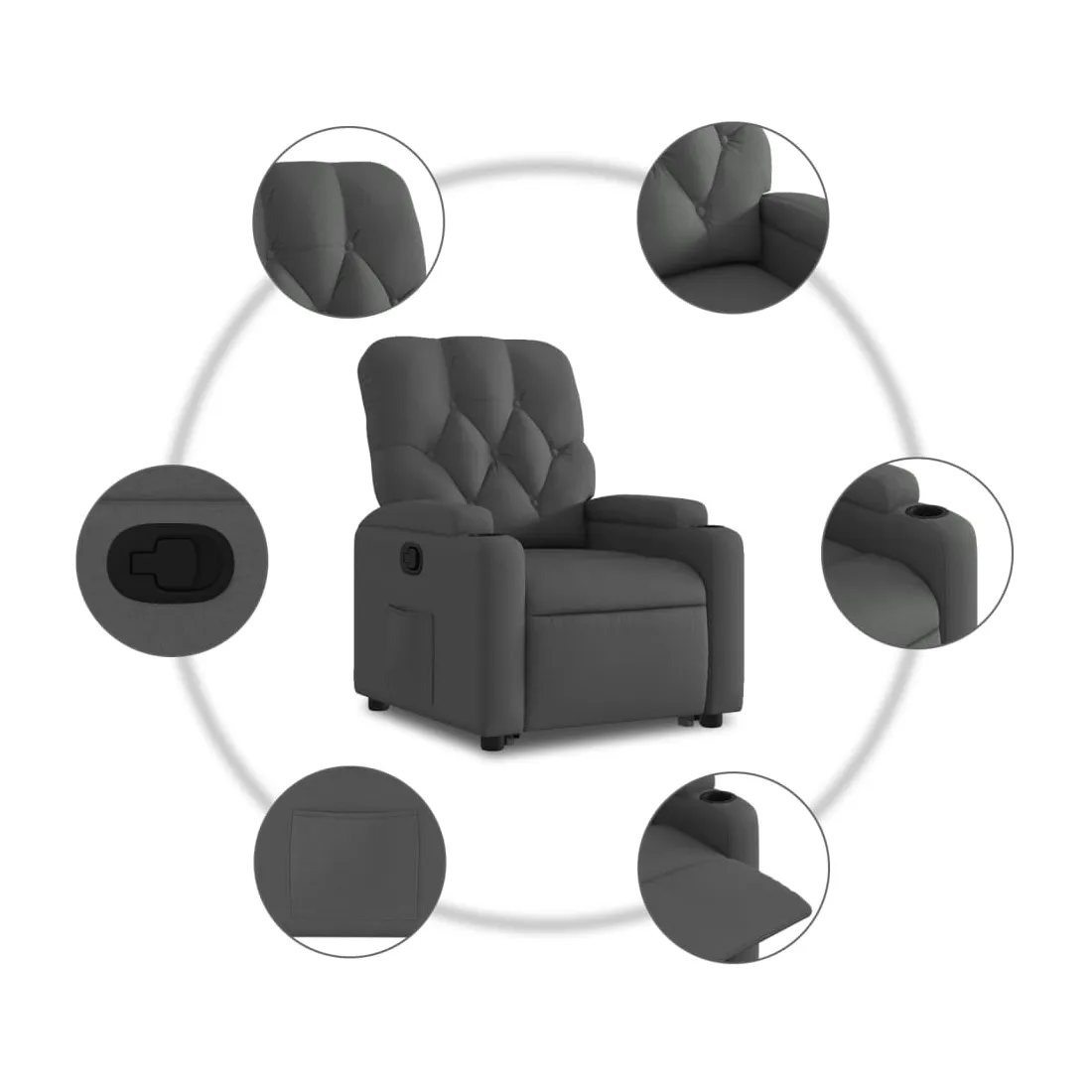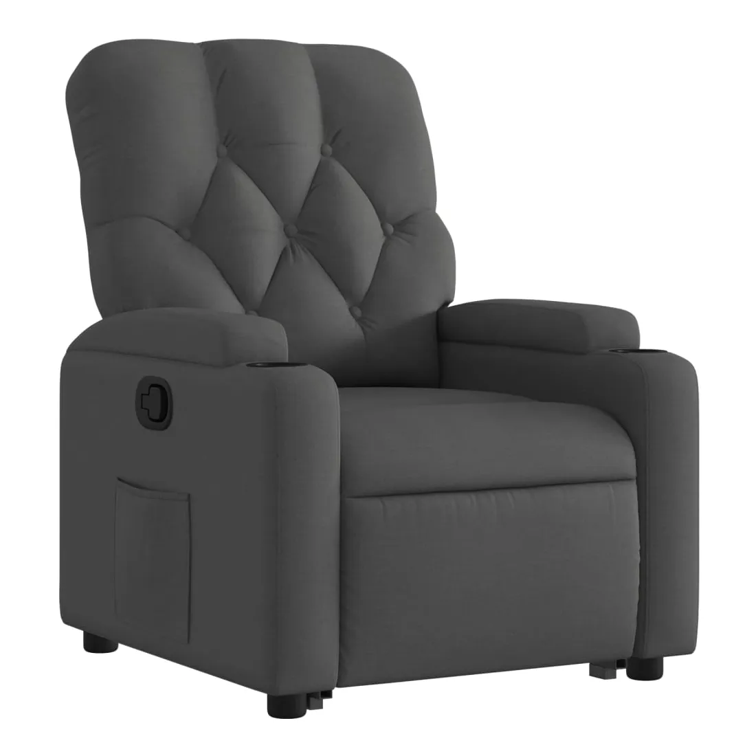 Asseyez-vous et détendez-vous dans ce fauteuil inclinable très confortable ! Fonction de levage électrique : ce fauteuil inclinable pour personnes âgées est équipé d'un moteur électrique pour la fonction de levage. Grâce à la fonction qui pousse toute la chaise vers le haut, vous pouvez facilement vous tenir debout sans stresser votre dos et vos genoux en appuyant simplement sur le bouton.Fonction d'inclinaison manuelle : ce fauteuil inclinable est doté d'une poignée du côté droit. Vous pouvez régler manuellement le repose-pieds et le dossier dans n'importe quelle position selon votre confort en tirant simplement sur la poignée. Cette fonction permet une inclinaison maximale de 135 degrés. De plus, le dossier peut revenir rapidement à sa position d'origine en tirant simplement sur la poignée.Expérience d'assise confortable : le siège, le dossier et les larges accoudoirs bien rembourrés recouverts de tissu procurent une sensation confortable et chaleureuse, vous permettant de vous sentir enveloppé lorsque vous êtes assis. Le tissu présente un aspect simple et épuré et est respirant et durable.Porte-gobelets et poche latérale pratiques : ce fauteuil dispose de deux porte-gobelets pratiques pour vos boissons et d'une poche latérale pour garder vos objets essentiels à portée de main.Cadre solide et stable : le cadre en bois et en métal offre une structure solide et une grande stabilité. Ce fauteuil inclinable est confortable et durable.