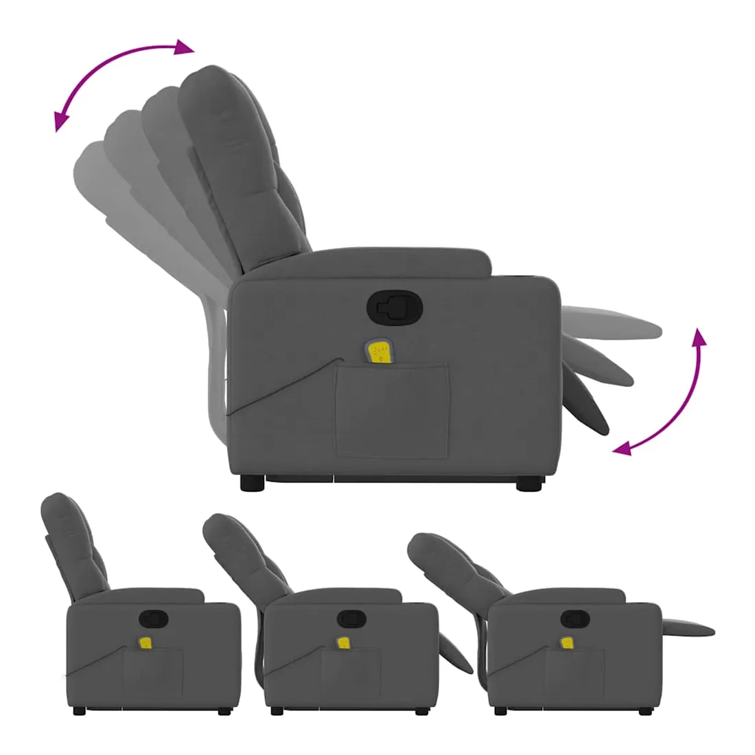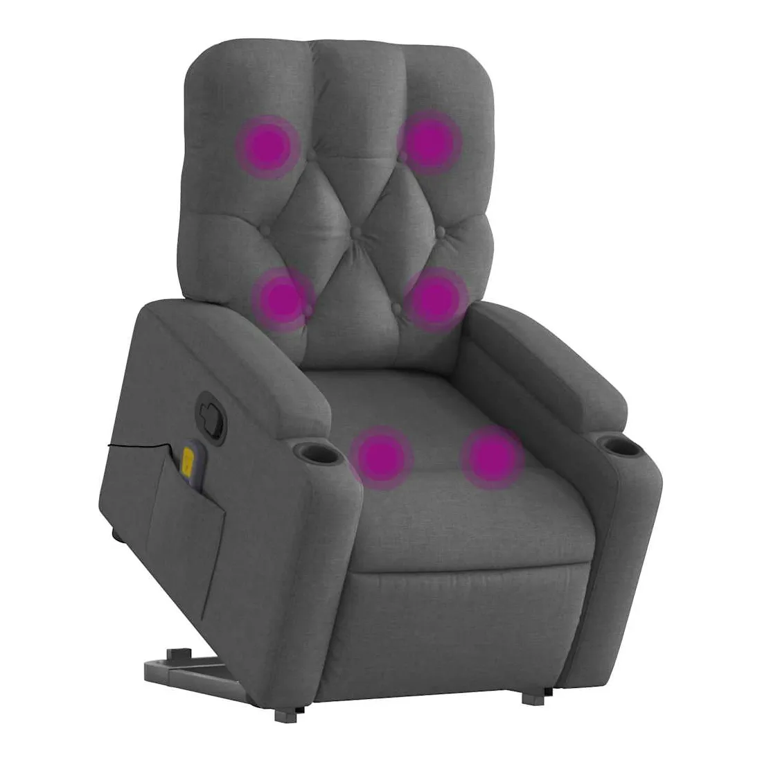 Asseyez-vous et détendez-vous dans ce fauteuil inclinable de massage très confortable ! Fonction de levage électrique : ce fauteuil inclinable pour personnes âgées est équipé d'un moteur électrique pour la fonction de levage. Grâce à la fonction qui pousse toute la chaise vers le haut, vous pouvez facilement vous tenir debout sans stresser votre dos et vos genoux en appuyant simplement sur le bouton.Fonction d'inclinaison manuelle : ce fauteuil inclinable est doté d'une poignée du côté droit. Vous pouvez régler manuellement le repose-pieds et le dossier dans n'importe quelle position selon votre confort en tirant simplement sur la poignée. Cette fonction permet une inclinaison maximale de 135 degrés. De plus, le dossier peut revenir rapidement à sa position d'origine en tirant simplement sur la poignée.Fonction de vibration : les 6 points de massage vous permettent de faire l'expérience d'un massage mieux ciblé. De plus, la télécommande incluse vous permet de choisir différents programmes de massage. La fonction de massage est alimentée par le connecteur USB qui nécessite une source d'alimentation USB certifiée de 5 V (non fournie).Expérience d'assise confortable : le siège, le dossier et les larges accoudoirs bien rembourrés recouverts de tissu procurent une sensation confortable et chaleureuse, vous permettant de vous sentir enveloppé lorsque vous êtes assis. Le tissu présente un aspect simple et épuré et est respirant et durable.Porte-gobelets et poche latérale pratiques : ce fauteuil dispose de deux porte-gobelets pratiques pour vos boissons et d'une poche latérale pour garder vos objets essentiels à portée de main.Cadre solide et stable : le cadre en bois et en métal offre une structure solide et une grande stabilité. Ce fauteuil inclinable est confortable et durable.