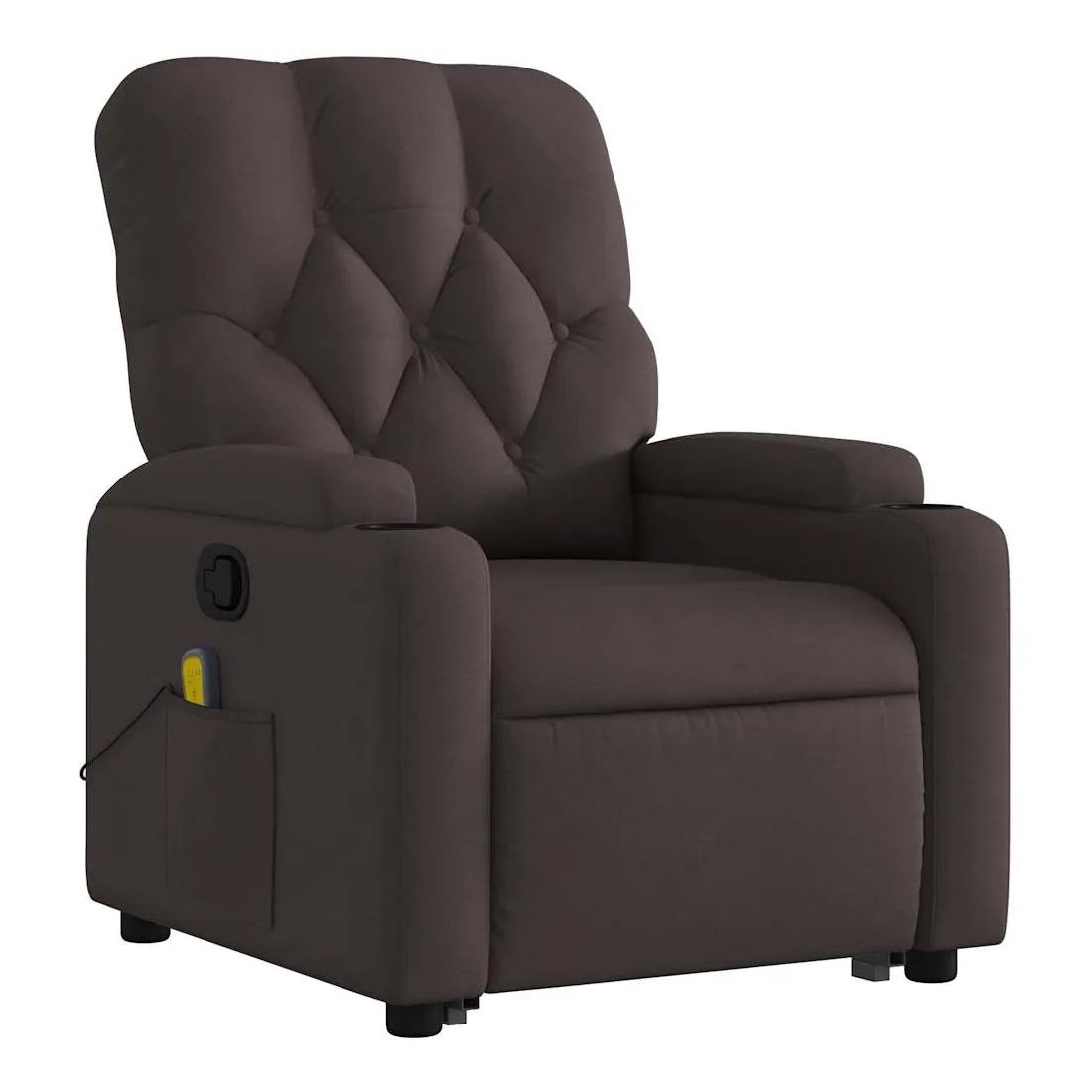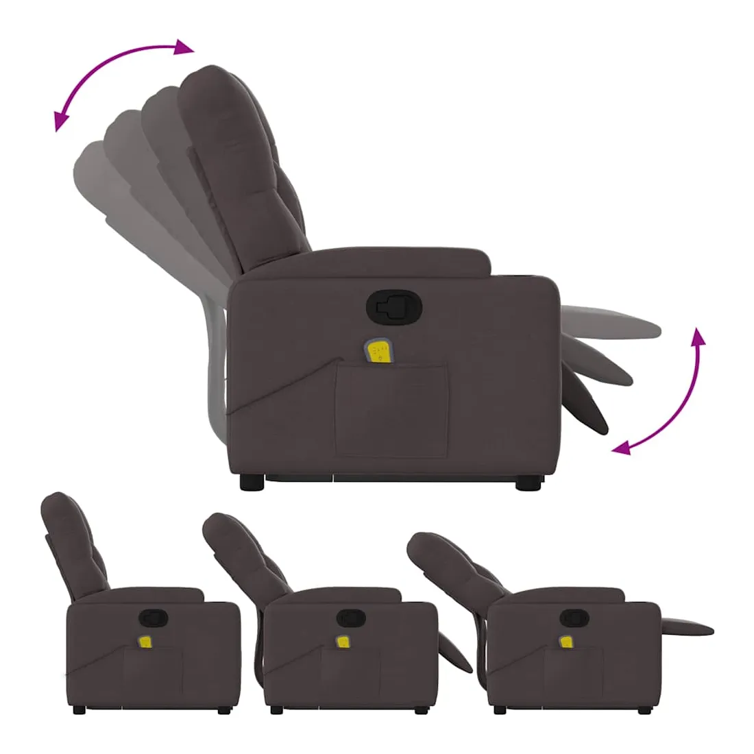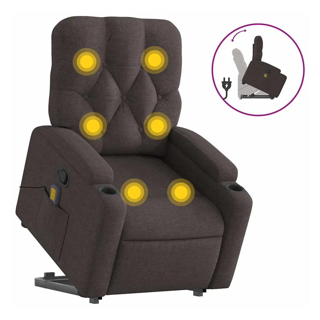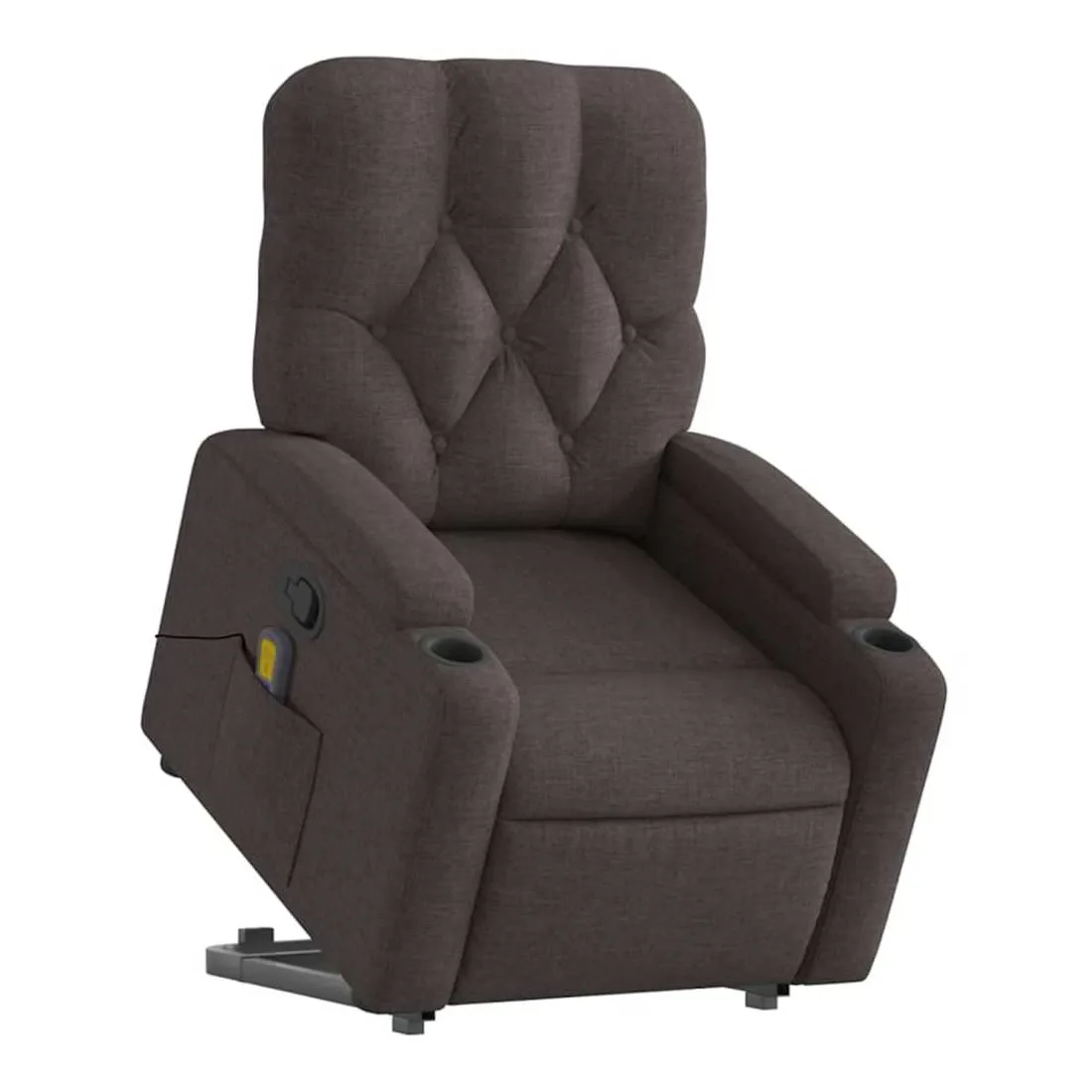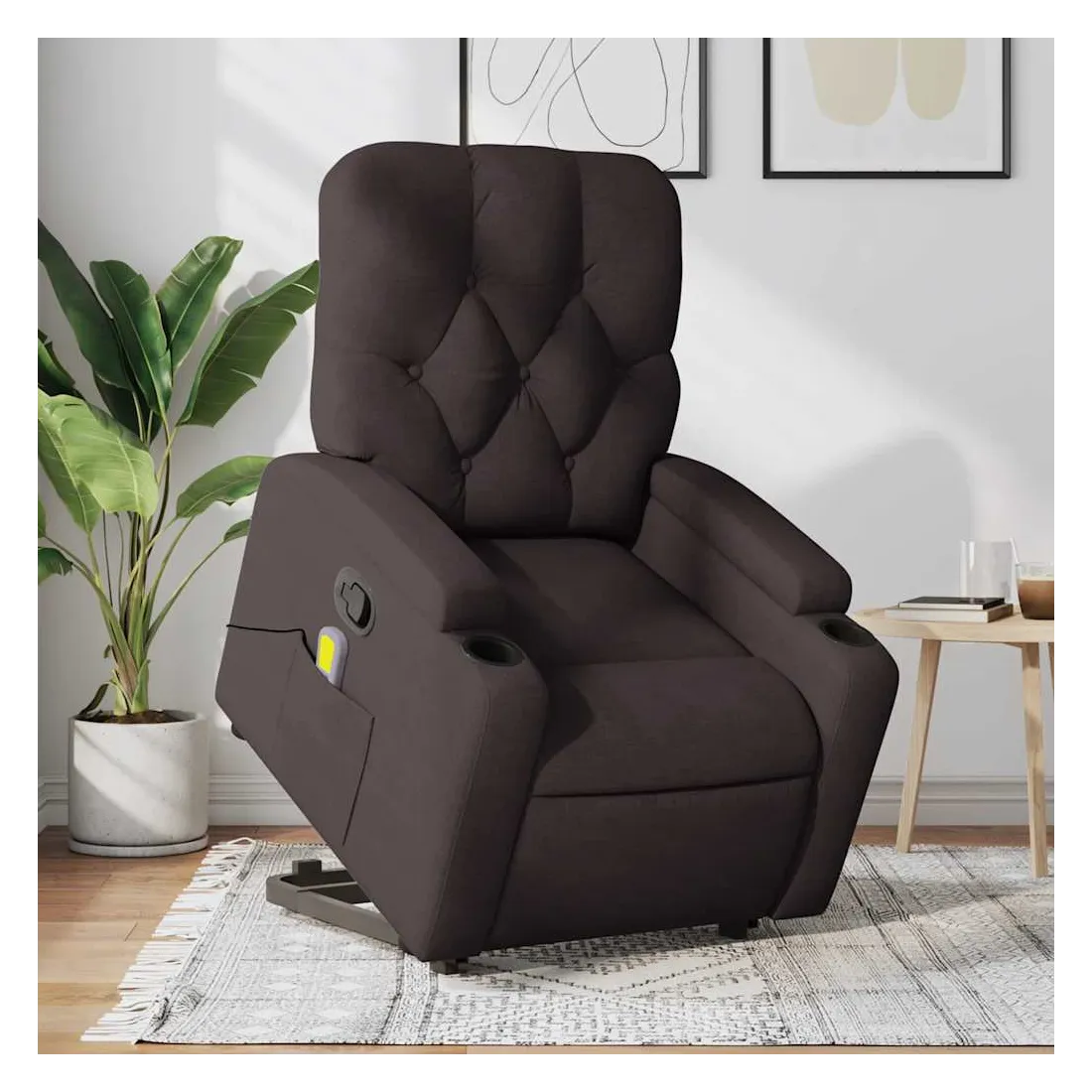 Asseyez-vous et détendez-vous dans ce fauteuil inclinable de massage très confortable ! Fonction de levage électrique : ce fauteuil inclinable pour personnes âgées est équipé d'un moteur électrique pour la fonction de levage. Grâce à la fonction qui pousse toute la chaise vers le haut, vous pouvez facilement vous tenir debout sans stresser votre dos et vos genoux en appuyant simplement sur le bouton.Fonction d'inclinaison manuelle : ce fauteuil inclinable est doté d'une poignée du côté droit. Vous pouvez régler manuellement le repose-pieds et le dossier dans n'importe quelle position selon votre confort en tirant simplement sur la poignée. Cette fonction permet une inclinaison maximale de 135 degrés. De plus, le dossier peut revenir rapidement à sa position d'origine en tirant simplement sur la poignée.Fonction de vibration : les 6 points de massage vous permettent de faire l'expérience d'un massage mieux ciblé. De plus, la télécommande incluse vous permet de choisir différents programmes de massage. La fonction de massage est alimentée par le connecteur USB qui nécessite une source d'alimentation USB certifiée de 5 V (non fournie).Expérience d'assise confortable : le siège, le dossier et les larges accoudoirs bien rembourrés recouverts de tissu procurent une sensation confortable et chaleureuse, vous permettant de vous sentir enveloppé lorsque vous êtes assis. Le tissu présente un aspect simple et épuré et est respirant et durable.Porte-gobelets et poche latérale pratiques : ce fauteuil dispose de deux porte-gobelets pratiques pour vos boissons et d'une poche latérale pour garder vos objets essentiels à portée de main.Cadre solide et stable : le cadre en bois et en métal offre une structure solide et une grande stabilité. Ce fauteuil inclinable est confortable et durable.