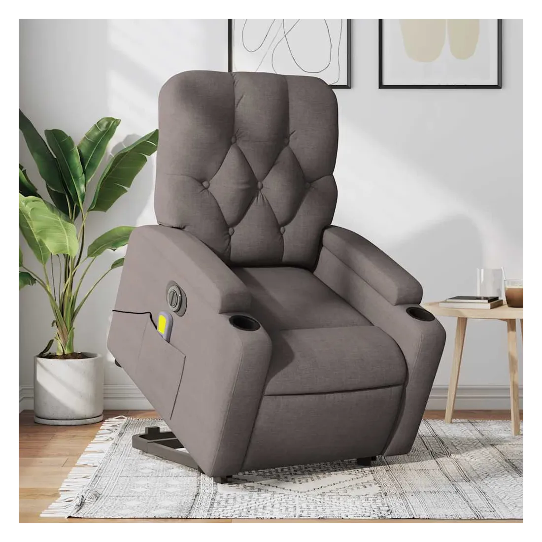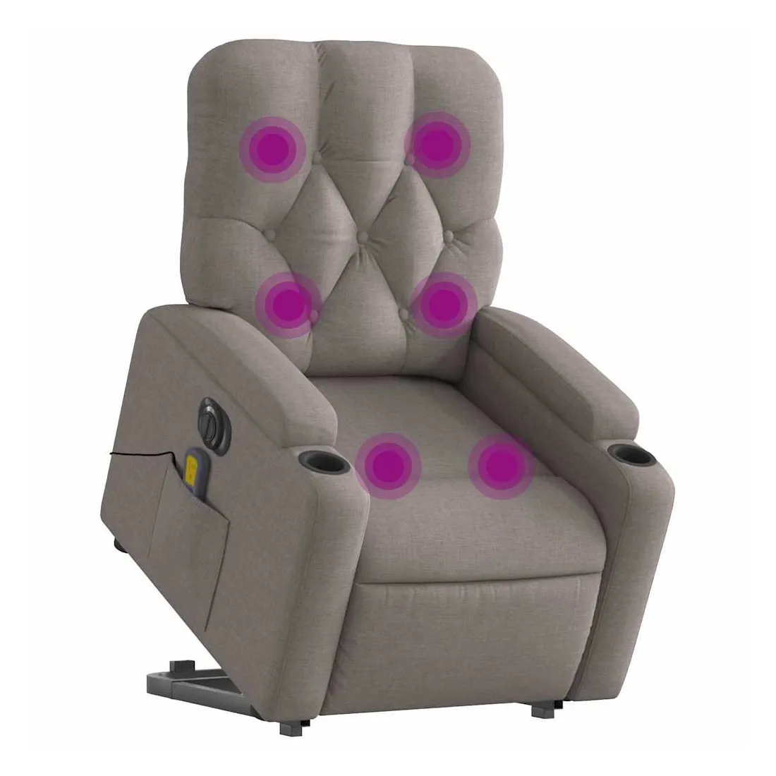 Asseyez-vous et détendez-vous dans ce fauteuil inclinable de massage électrique très confortable ! Fonction de levage électrique : ce fauteuil inclinable pour personnes âgées est équipé d'un moteur électrique pour la fonction de levage. Grâce à la fonction qui pousse toute la chaise vers le haut, vous pouvez facilement vous tenir debout sans stresser votre dos et vos genoux en appuyant simplement sur le bouton.Fonction d'inclinaison électrique : ce fauteuil inclinable est également équipé d'un moteur électrique qui permet de régler automatiquement le repose-pied et le dossier dans n'importe quelle position, selon votre confort, en appuyant simplement sur le bouton situé sur le côté du fauteuil. Cette fonction permet une inclinaison maximale de 135 degrés. En outre, le dossier peut revenir automatiquement à sa position d'origine par une simple pression sur le bouton.Fonction de vibration : les 6 points de massage vous permettent de faire l'expérience d'un massage mieux ciblé. De plus, la télécommande incluse vous permet de choisir différents programmes de massage. La fonction de massage est alimentée par le connecteur USB qui nécessite une source d'alimentation USB certifiée de 5 V (non fournie).Expérience d'assise confortable : le siège, le dossier et les larges accoudoirs bien rembourrés recouverts de tissu procurent une sensation confortable et chaleureuse, vous permettant de vous sentir enveloppé lorsque vous êtes assis. Le tissu présente un aspect simple et épuré et est respirant et durable.Porte-gobelets et poche latérale pratiques : ce fauteuil dispose de deux porte-gobelets pratiques pour vos boissons et d'une poche latérale pour garder vos objets essentiels à portée de main.Cadre solide et stable : le cadre en bois et en métal offre une structure solide et une grande stabilité. Ce fauteuil inclinable est confortable et durable.