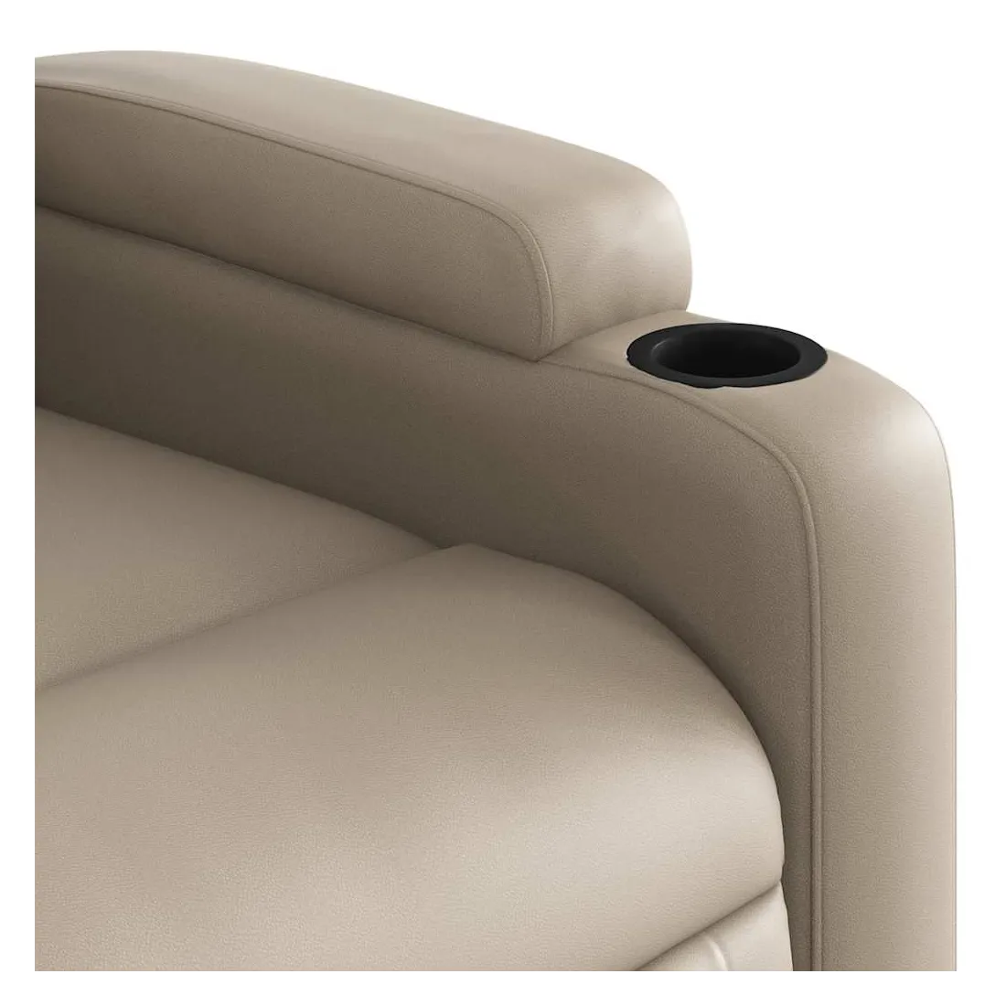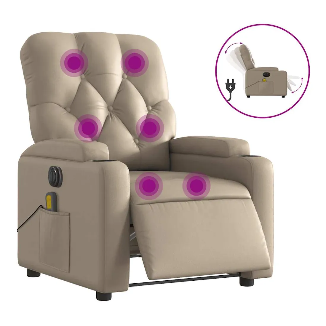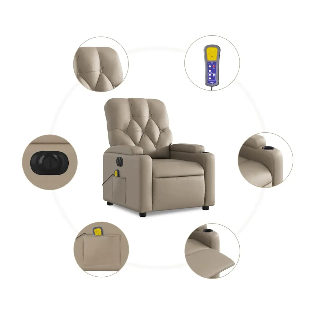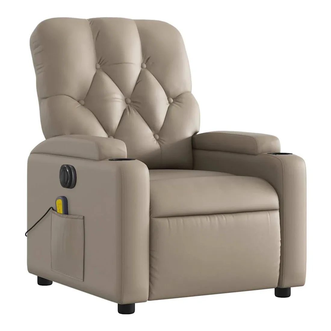 Asseyez-vous et détendez-vous dans ce fauteuil inclinable de massage électrique très confortable ! Fonction d'inclinaison électrique : ce fauteuil inclinable est équipé d'un moteur électrique qui permet de régler automatiquement le repose-pied et le dossier dans n'importe quelle position, selon votre confort, en appuyant simplement sur le bouton situé sur le côté du fauteuil. Cette fonction permet une inclinaison maximale de 135 degrés. En outre, le dossier peut revenir automatiquement à sa position d'origine par une simple pression sur le bouton.Fonction de vibration : les 6 points de massage vous permettent de faire l'expérience d'un massage mieux ciblé. De plus, la télécommande incluse vous permet de choisir différents programmes de massage. La fonction de massage est alimentée par le connecteur USB qui nécessite une source d'alimentation USB certifiée de 5 V (non fournie).Expérience de siège confortable : le siège, le dossier et les larges accoudoirs rembourrés épais recouverts de similicuir procurent une sensation confortable, vous faisant vous sentir enlacé lorsque vous êtes assis. Le similicuir est un matériau très résistant. Il est résistant aux taches, ce qui le rend facile à nettoyer avec un chiffon humide. La surface lisse donne également un aspect luxueux et la beauté du cuir véritable.Poche latérale pratique : ce fauteuil est doté d'une poche latérale pour ranger votre télécommande ou garder vos objets essentiels à portée de main.Cadre solide et stable : le cadre en bois et en métal offre une structure solide et une grande stabilité. Ce fauteuil inclinable est confortable et durable.