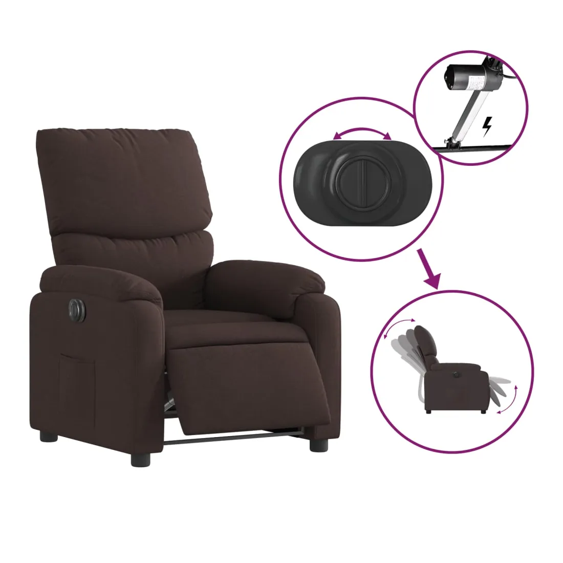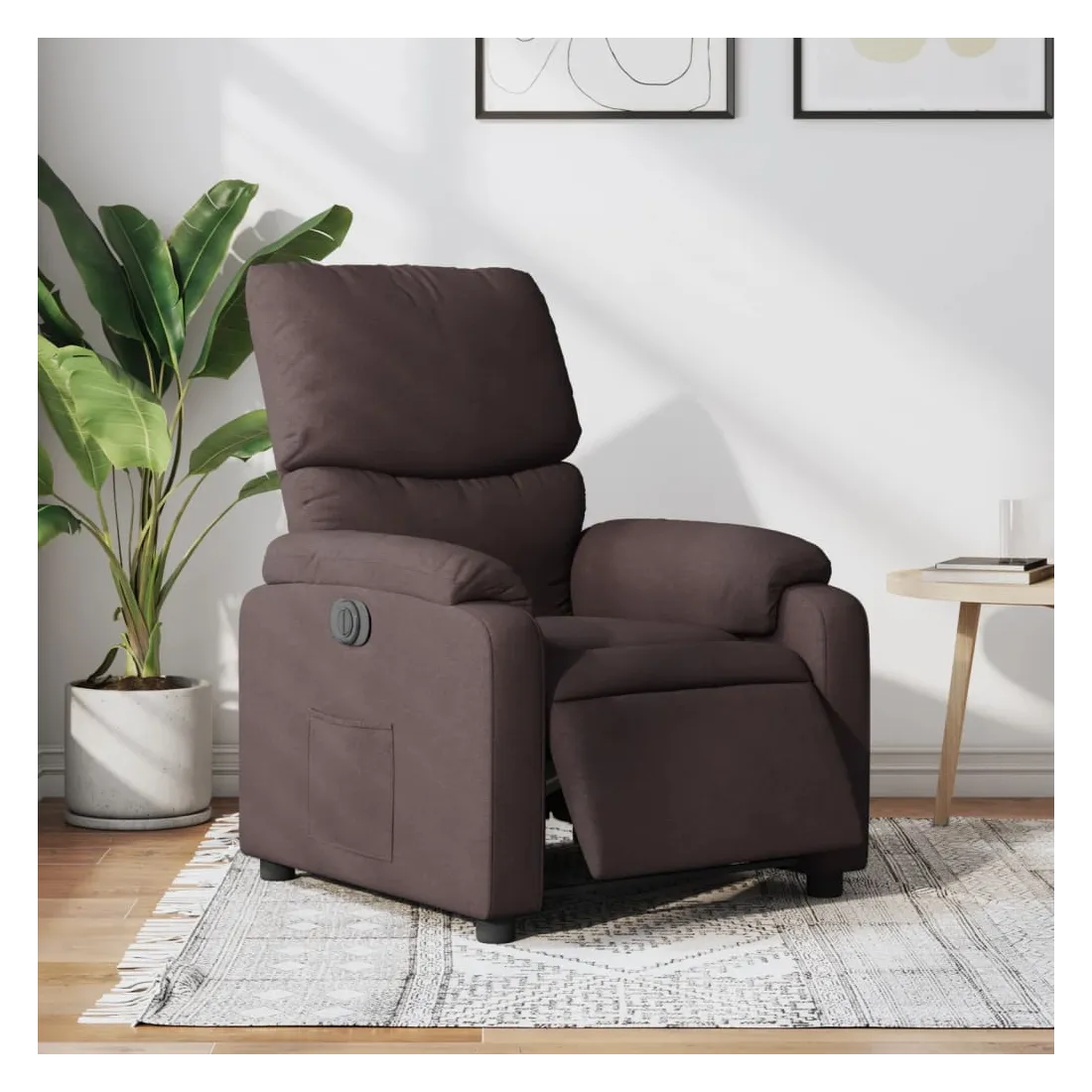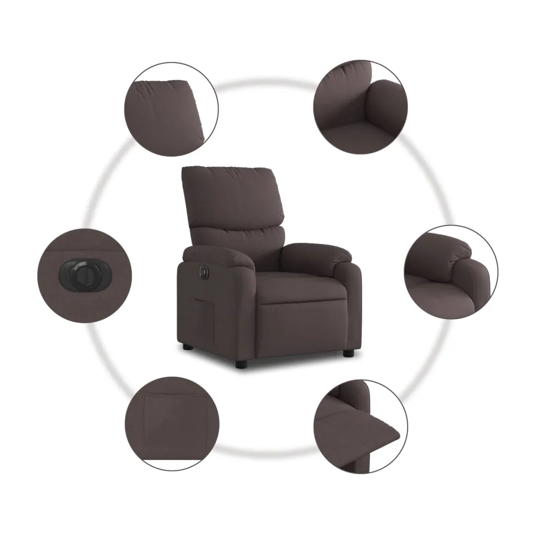 Asseyez-vous et détendez-vous dans ce fauteuil inclinable électrique très confortable ! Fonction d'inclinaison électrique : ce fauteuil inclinable est équipé d'un moteur électrique qui permet de régler automatiquement le repose-pied et le dossier dans n'importe quelle position, selon votre confort, en appuyant simplement sur le bouton situé sur le côté du fauteuil. Cette fonction permet une inclinaison maximale de 135 degrés. En outre, le dossier peut revenir automatiquement à sa position d'origine par une simple pression sur le bouton.Expérience d'assise confortable : le siège, le dossier et les larges accoudoirs bien rembourrés recouverts de tissu procurent une sensation confortable et chaleureuse, vous permettant de vous sentir enveloppé lorsque vous êtes assis. Le tissu présente un aspect simple et épuré et est respirant et durable.Poche latérale pratique : ce fauteuil est doté d'une poche latérale pour vous permettre de garder vos objets essentiels à portée de main.Cadre solide et stable : le cadre en bois et en métal offre une structure solide et une grande stabilité. Ce fauteuil inclinable est confortable et durable.