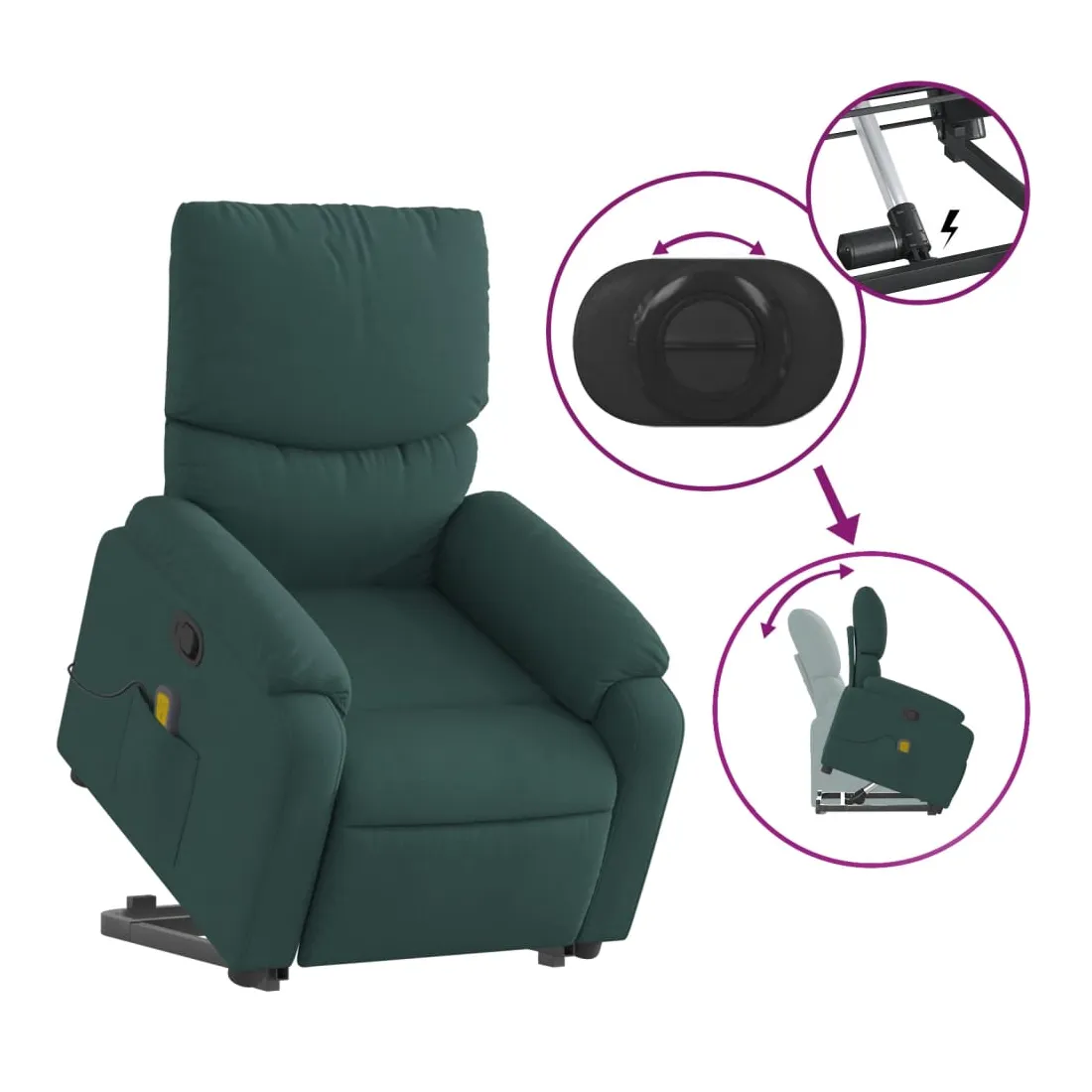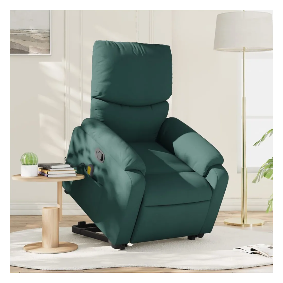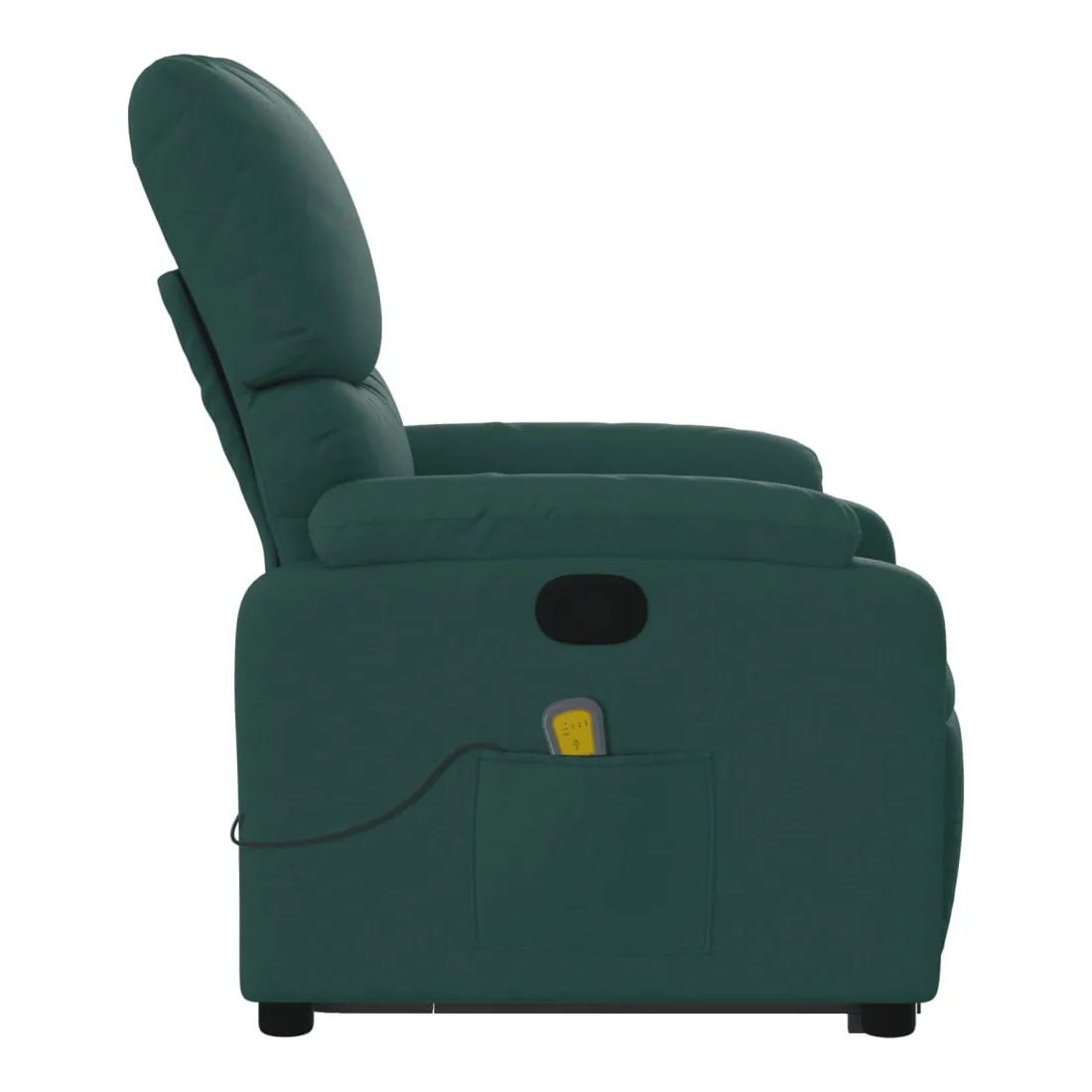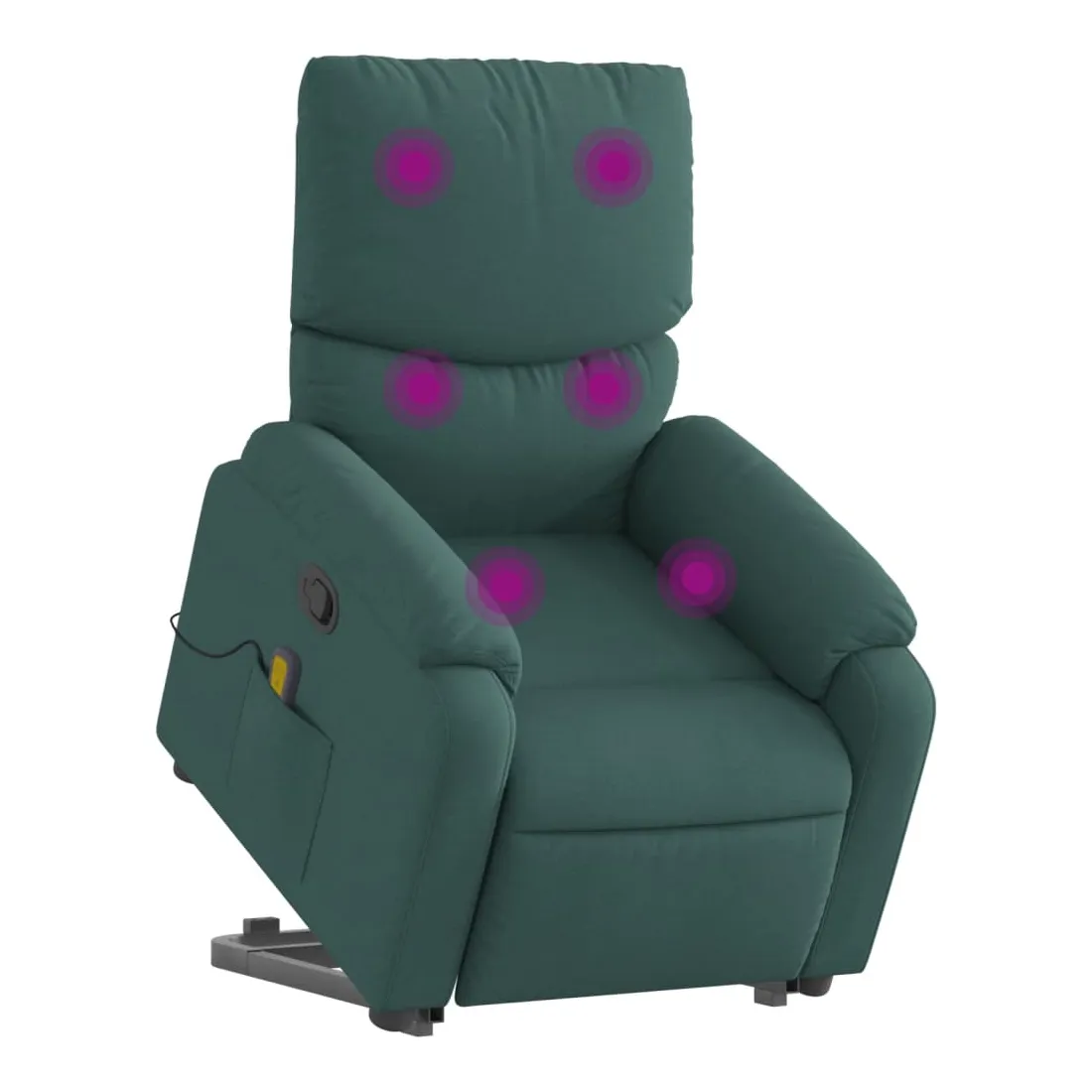 Asseyez-vous et détendez-vous dans ce fauteuil inclinable de massage très confortable ! Fonction de levage électrique : ce fauteuil inclinable pour personnes âgées est équipé d'un moteur électrique pour la fonction de levage. Grâce à la fonction qui pousse toute la chaise vers le haut, vous pouvez facilement vous tenir debout sans stresser votre dos et vos genoux en appuyant simplement sur le bouton.Fonction d'inclinaison manuelle : ce fauteuil inclinable est doté d'une poignée du côté droit. Vous pouvez régler manuellement le repose-pieds et le dossier dans n'importe quelle position selon votre confort en tirant simplement sur la poignée. Cette fonction permet une inclinaison maximale de 135 degrés. De plus, le dossier peut revenir rapidement à sa position d'origine en tirant simplement sur la poignée.Fonction de vibration : les 6 points de massage vous permettent de faire l'expérience d'un massage mieux ciblé. De plus, la télécommande incluse vous permet de choisir différents programmes de massage. La fonction de massage est alimentée par le connecteur USB qui nécessite une source d'alimentation USB certifiée de 5 V (non fournie).Expérience d'assise confortable : le siège, le dossier et les larges accoudoirs bien rembourrés recouverts de tissu procurent une sensation confortable et chaleureuse, vous permettant de vous sentir enveloppé lorsque vous êtes assis. Le tissu présente un aspect simple et épuré et est respirant et durable.Poche latérale pratique : ce fauteuil est doté d'une poche latérale pour ranger votre télécommande ou garder vos objets essentiels à portée de main.Cadre solide et stable : le cadre en bois et en métal offre une structure solide et une grande stabilité. Ce fauteuil inclinable est confortable et durable.