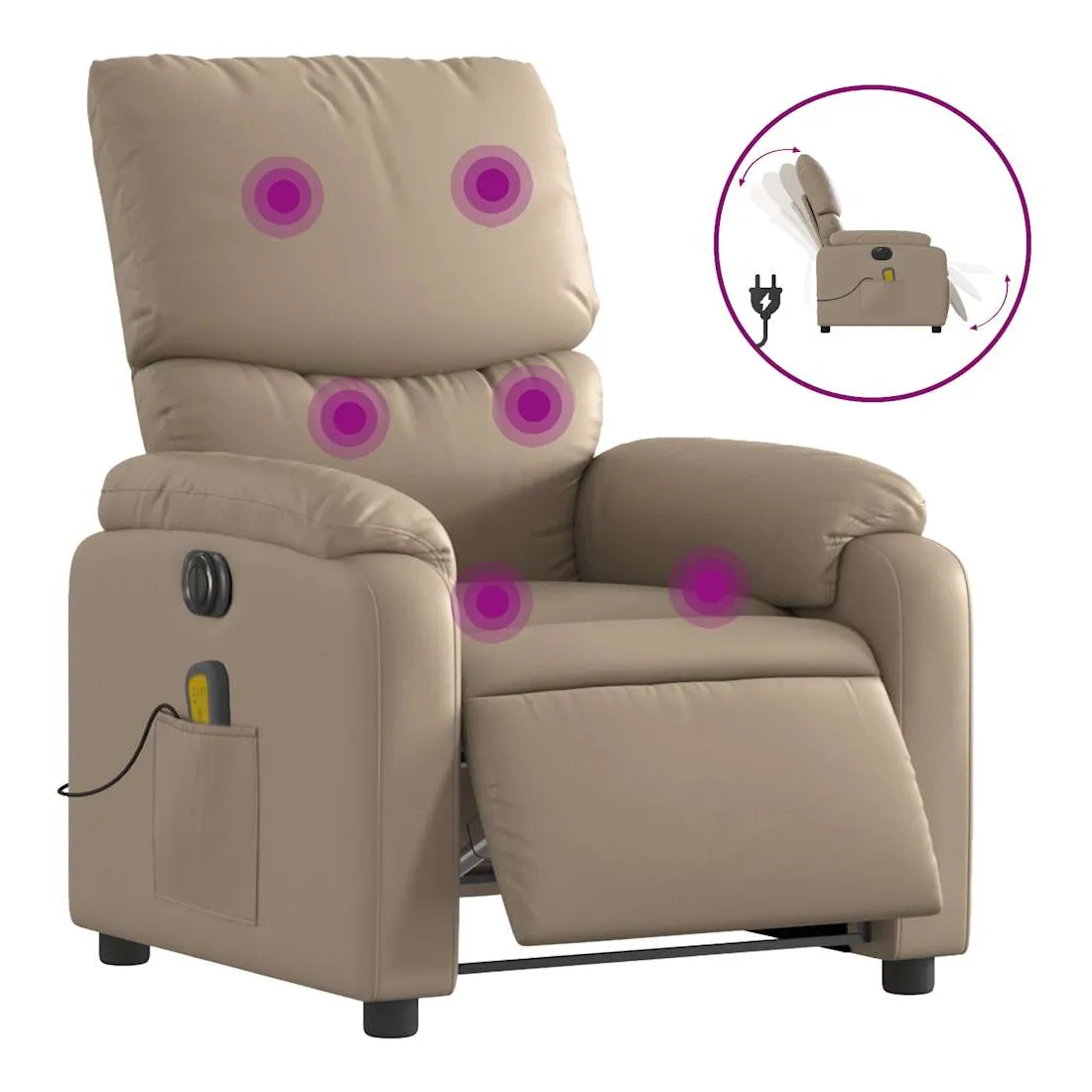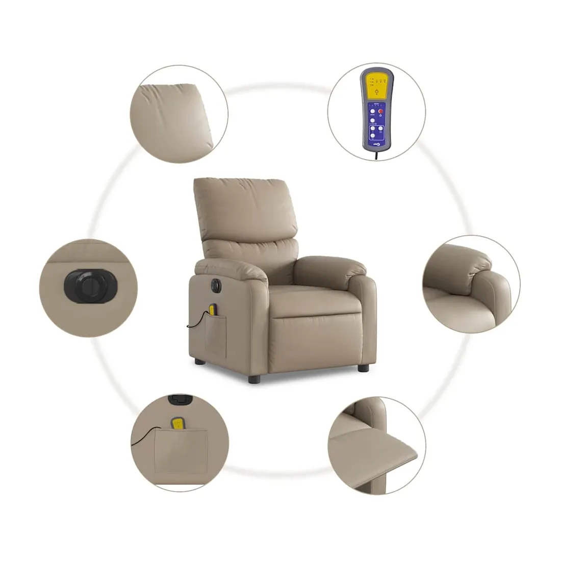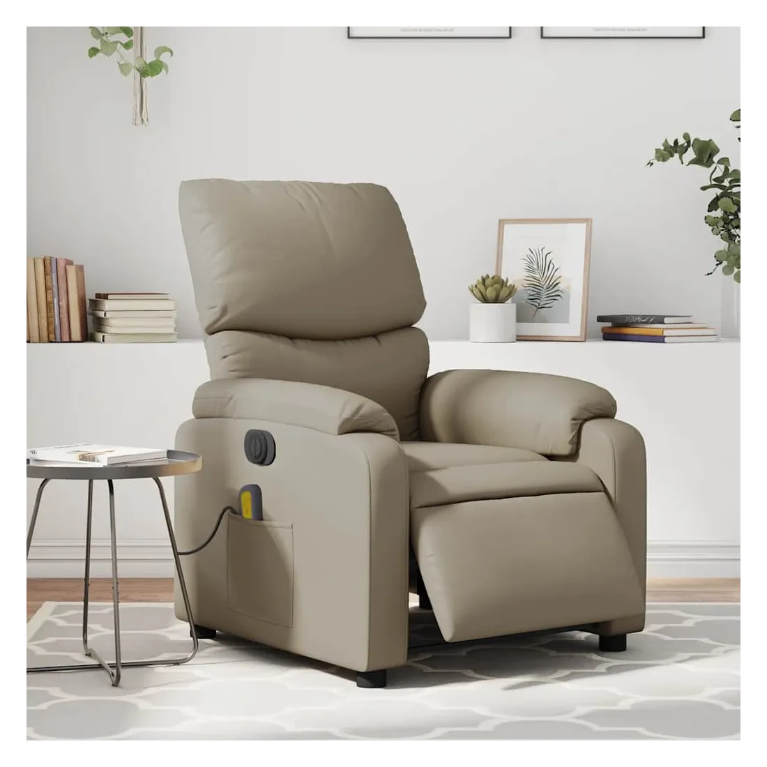 Asseyez-vous et détendez-vous dans ce fauteuil inclinable de massage électrique très confortable ! Fonction d'inclinaison électrique : ce fauteuil inclinable est équipé d'un moteur électrique qui permet de régler automatiquement le repose-pied et le dossier dans n'importe quelle position, selon votre confort, en appuyant simplement sur le bouton situé sur le côté du fauteuil. Cette fonction permet une inclinaison maximale de 135 degrés. En outre, le dossier peut revenir automatiquement à sa position d'origine par une simple pression sur le bouton.Fonction de vibration : les 6 points de massage vous permettent de faire l'expérience d'un massage mieux ciblé. De plus, la télécommande incluse vous permet de choisir différents programmes de massage. La fonction de massage est alimentée par le connecteur USB qui nécessite une source d'alimentation USB certifiée de 5 V (non fournie).Expérience de siège confortable : le siège, le dossier et les larges accoudoirs rembourrés épais recouverts de similicuir procurent une sensation confortable, vous faisant vous sentir enlacé lorsque vous êtes assis. Le similicuir est un matériau très résistant. Il est résistant aux taches, ce qui le rend facile à nettoyer avec un chiffon humide. La surface lisse donne également un aspect luxueux et la beauté du cuir véritable.Poche latérale pratique : ce fauteuil est doté d'une poche latérale pour ranger votre télécommande ou garder vos objets essentiels à portée de main.Cadre solide et stable : le cadre en bois et en métal offre une structure solide et une grande stabilité. Ce fauteuil inclinable est confortable et durable.