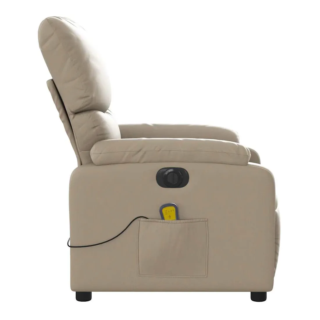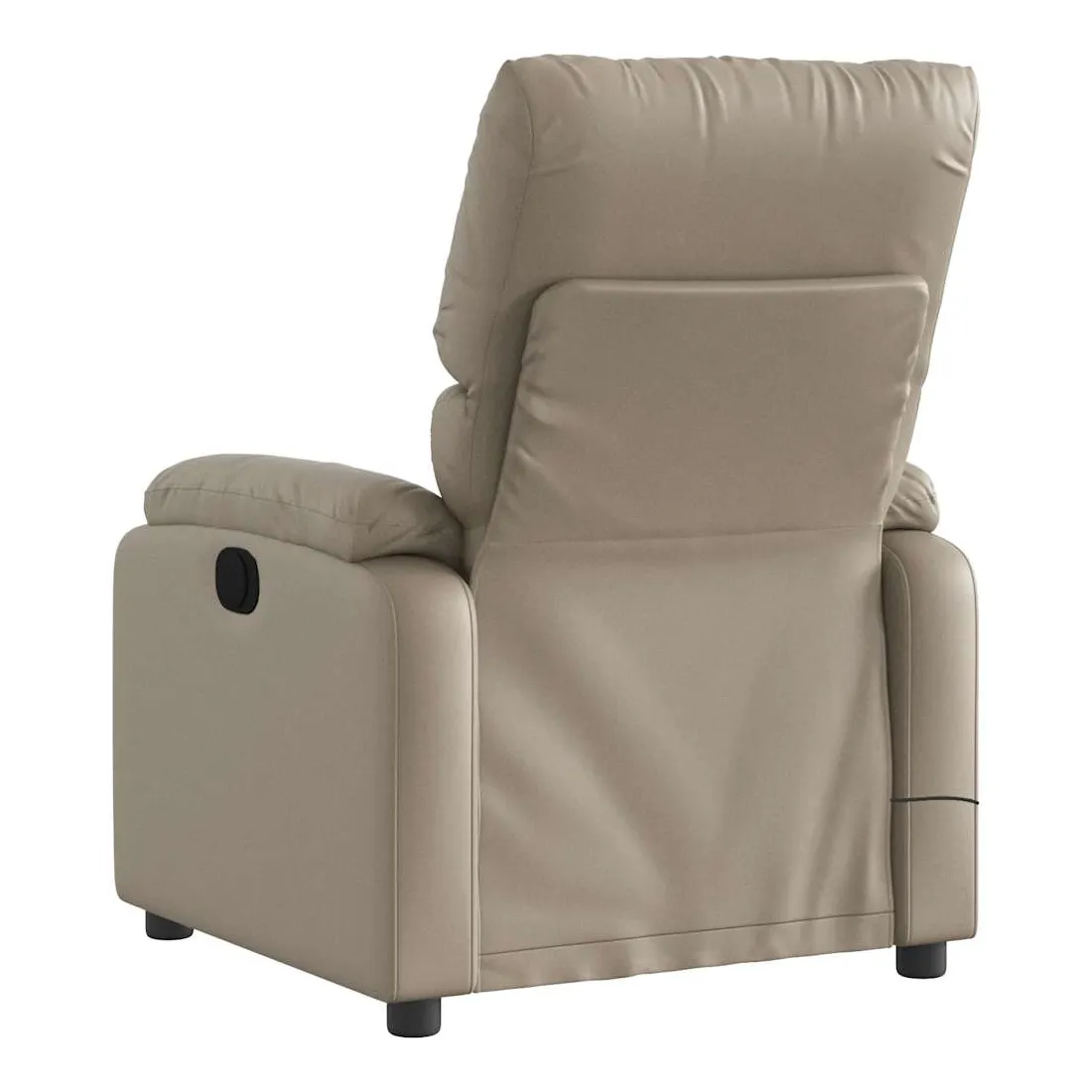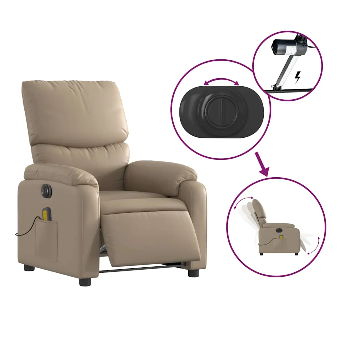 Asseyez-vous et détendez-vous dans ce fauteuil inclinable de massage électrique très confortable ! Fonction d'inclinaison électrique : ce fauteuil inclinable est équipé d'un moteur électrique qui permet de régler automatiquement le repose-pied et le dossier dans n'importe quelle position, selon votre confort, en appuyant simplement sur le bouton situé sur le côté du fauteuil. Cette fonction permet une inclinaison maximale de 135 degrés. En outre, le dossier peut revenir automatiquement à sa position d'origine par une simple pression sur le bouton.Fonction de vibration : les 6 points de massage vous permettent de faire l'expérience d'un massage mieux ciblé. De plus, la télécommande incluse vous permet de choisir différents programmes de massage. La fonction de massage est alimentée par le connecteur USB qui nécessite une source d'alimentation USB certifiée de 5 V (non fournie).Expérience de siège confortable : le siège, le dossier et les larges accoudoirs rembourrés épais recouverts de similicuir procurent une sensation confortable, vous faisant vous sentir enlacé lorsque vous êtes assis. Le similicuir est un matériau très résistant. Il est résistant aux taches, ce qui le rend facile à nettoyer avec un chiffon humide. La surface lisse donne également un aspect luxueux et la beauté du cuir véritable.Poche latérale pratique : ce fauteuil est doté d'une poche latérale pour ranger votre télécommande ou garder vos objets essentiels à portée de main.Cadre solide et stable : le cadre en bois et en métal offre une structure solide et une grande stabilité. Ce fauteuil inclinable est confortable et durable.