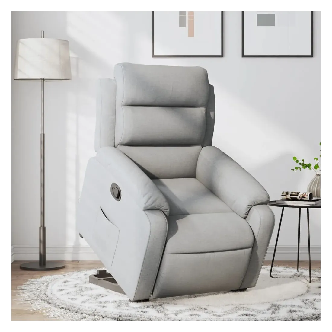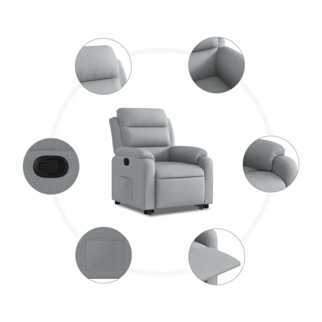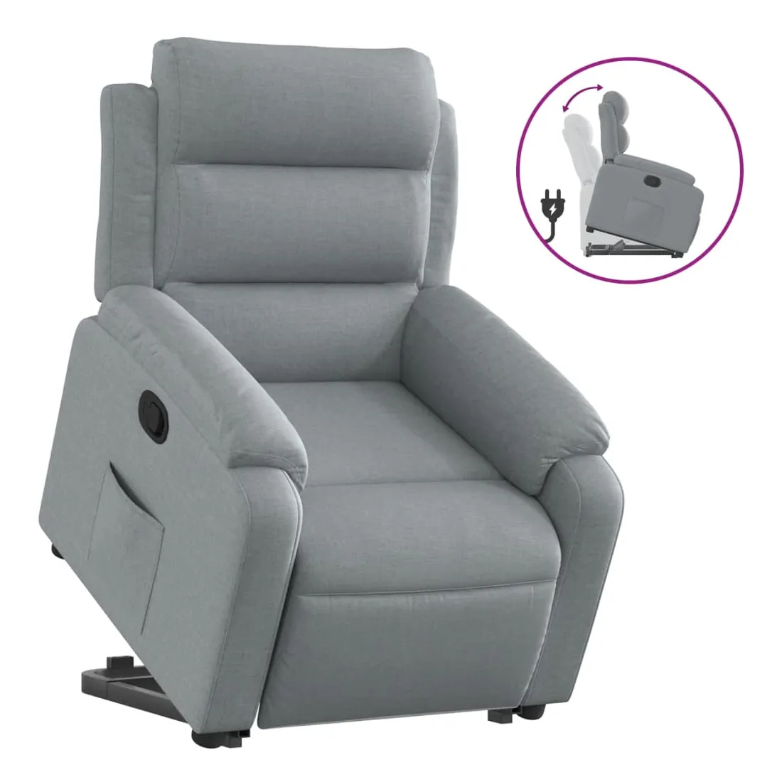 Asseyez-vous et détendez-vous dans ce fauteuil inclinable très confortable ! Fonction de levage électrique : ce fauteuil inclinable pour personnes âgées est équipé d'un moteur électrique pour la fonction de levage. Grâce à la fonction qui pousse toute la chaise vers le haut, vous pouvez facilement vous tenir debout sans stresser votre dos et vos genoux en appuyant simplement sur le bouton.Fonction d'inclinaison manuelle : ce fauteuil inclinable est doté d'une poignée du côté droit. Vous pouvez régler manuellement le repose-pieds et le dossier dans n'importe quelle position selon votre confort en tirant simplement sur la poignée. Cette fonction permet une inclinaison maximale de 135 degrés. De plus, le dossier peut revenir rapidement à sa position d'origine en tirant simplement sur la poignée.Expérience d'assise confortable : le siège, le dossier et les larges accoudoirs bien rembourrés recouverts de tissu procurent une sensation confortable et chaleureuse, vous permettant de vous sentir enveloppé lorsque vous êtes assis. Le tissu présente un aspect simple et épuré et est respirant et durable.Poche latérale pratique : ce fauteuil est doté d'une poche latérale pour vous permettre de garder vos objets essentiels à portée de main.Cadre solide et stable : le cadre en bois et en métal offre une structure solide et une grande stabilité. Ce fauteuil inclinable est confortable et durable.