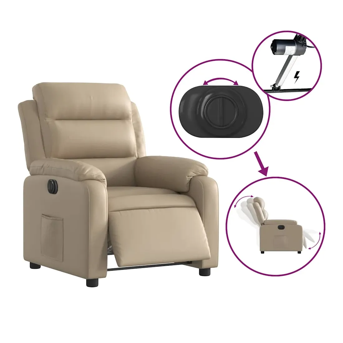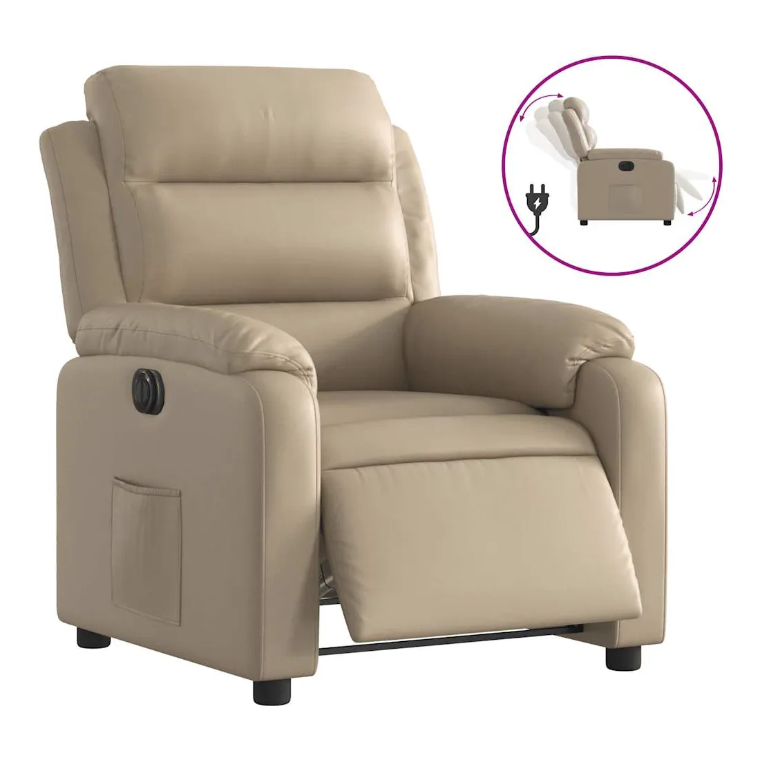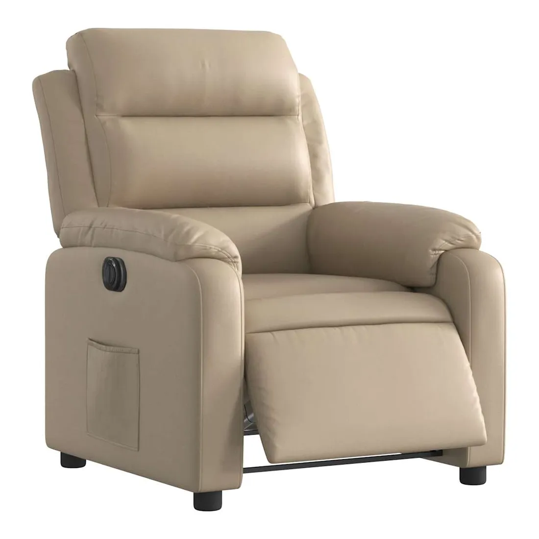 Asseyez-vous et détendez-vous dans ce fauteuil inclinable électrique très confortable ! Fonction d'inclinaison électrique : ce fauteuil inclinable est équipé d'un moteur électrique qui permet de régler automatiquement le repose-pied et le dossier dans n'importe quelle position, selon votre confort, en appuyant simplement sur le bouton situé sur le côté du fauteuil. Cette fonction permet une inclinaison maximale de 135 degrés. En outre, le dossier peut revenir automatiquement à sa position d'origine par une simple pression sur le bouton.Expérience de siège confortable : le siège, le dossier et les larges accoudoirs rembourrés épais recouverts de similicuir procurent une sensation confortable et chaleureuse, vous faisant vous sentir enlacé lorsque vous êtes assis. Le simili cuir est un matériau très résistant. Il est résistant aux taches, ce qui le rend facile à nettoyer avec un chiffon humide. La surface lisse donne également un aspect luxueux et la beauté du cuir véritable.Poche latérale pratique : ce fauteuil est doté d'une poche latérale pour vous permettre de garder vos objets essentiels à portée de main.Cadre solide et stable : le cadre en bois et en métal offre une structure solide et une grande stabilité. Ce fauteuil inclinable est confortable et durable.