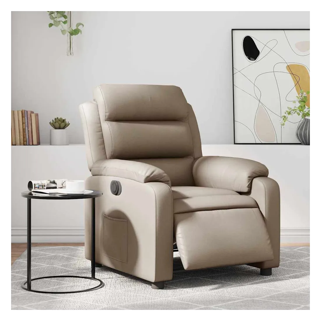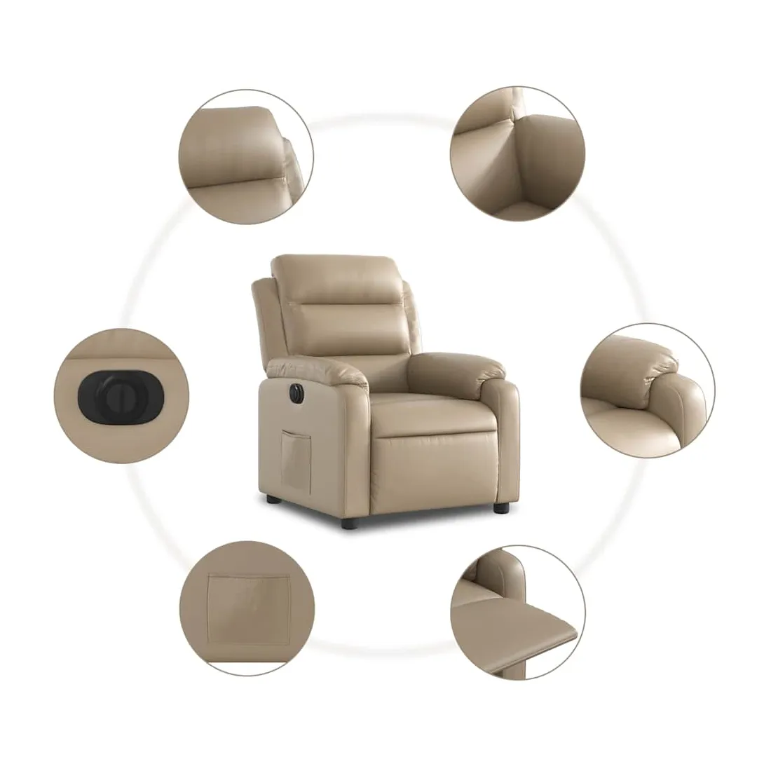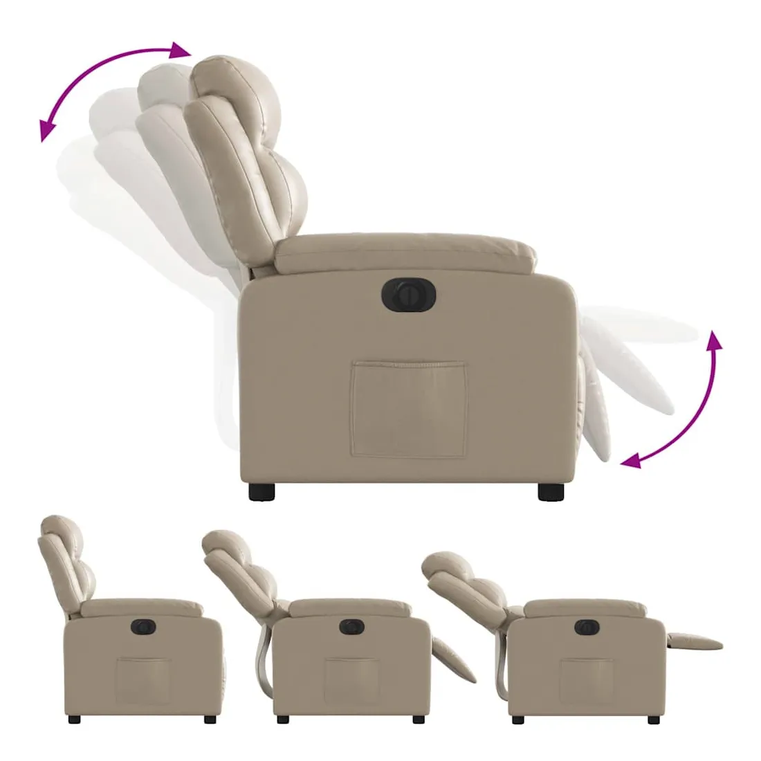 Asseyez-vous et détendez-vous dans ce fauteuil inclinable électrique très confortable ! Fonction d'inclinaison électrique : ce fauteuil inclinable est équipé d'un moteur électrique qui permet de régler automatiquement le repose-pied et le dossier dans n'importe quelle position, selon votre confort, en appuyant simplement sur le bouton situé sur le côté du fauteuil. Cette fonction permet une inclinaison maximale de 135 degrés. En outre, le dossier peut revenir automatiquement à sa position d'origine par une simple pression sur le bouton.Expérience de siège confortable : le siège, le dossier et les larges accoudoirs rembourrés épais recouverts de similicuir procurent une sensation confortable et chaleureuse, vous faisant vous sentir enlacé lorsque vous êtes assis. Le simili cuir est un matériau très résistant. Il est résistant aux taches, ce qui le rend facile à nettoyer avec un chiffon humide. La surface lisse donne également un aspect luxueux et la beauté du cuir véritable.Poche latérale pratique : ce fauteuil est doté d'une poche latérale pour vous permettre de garder vos objets essentiels à portée de main.Cadre solide et stable : le cadre en bois et en métal offre une structure solide et une grande stabilité. Ce fauteuil inclinable est confortable et durable.