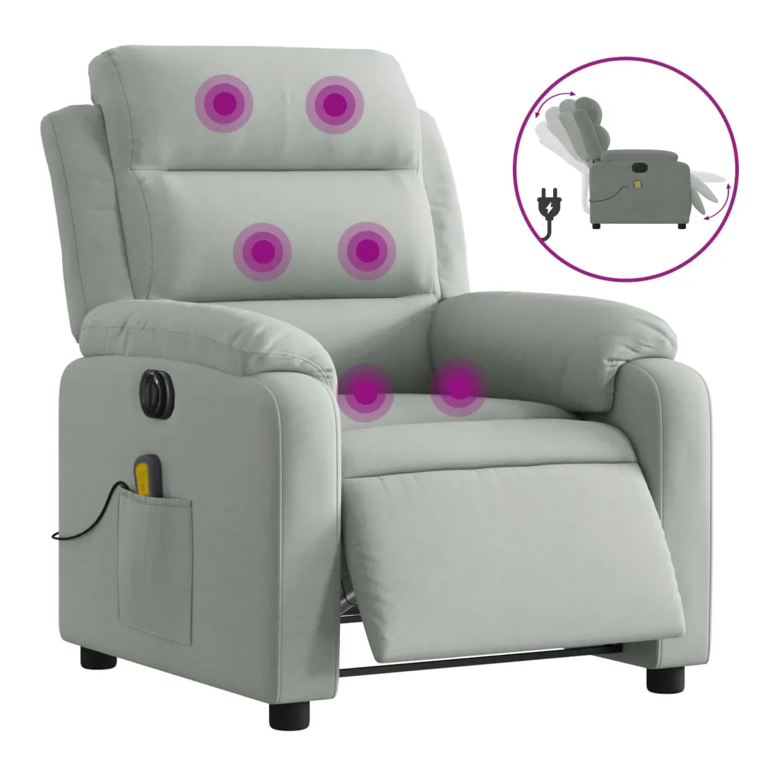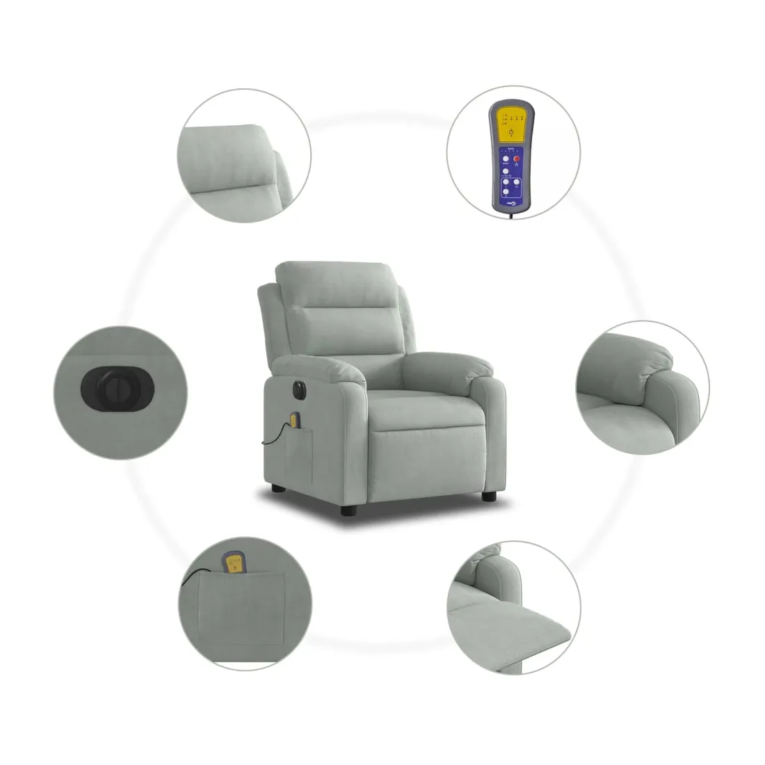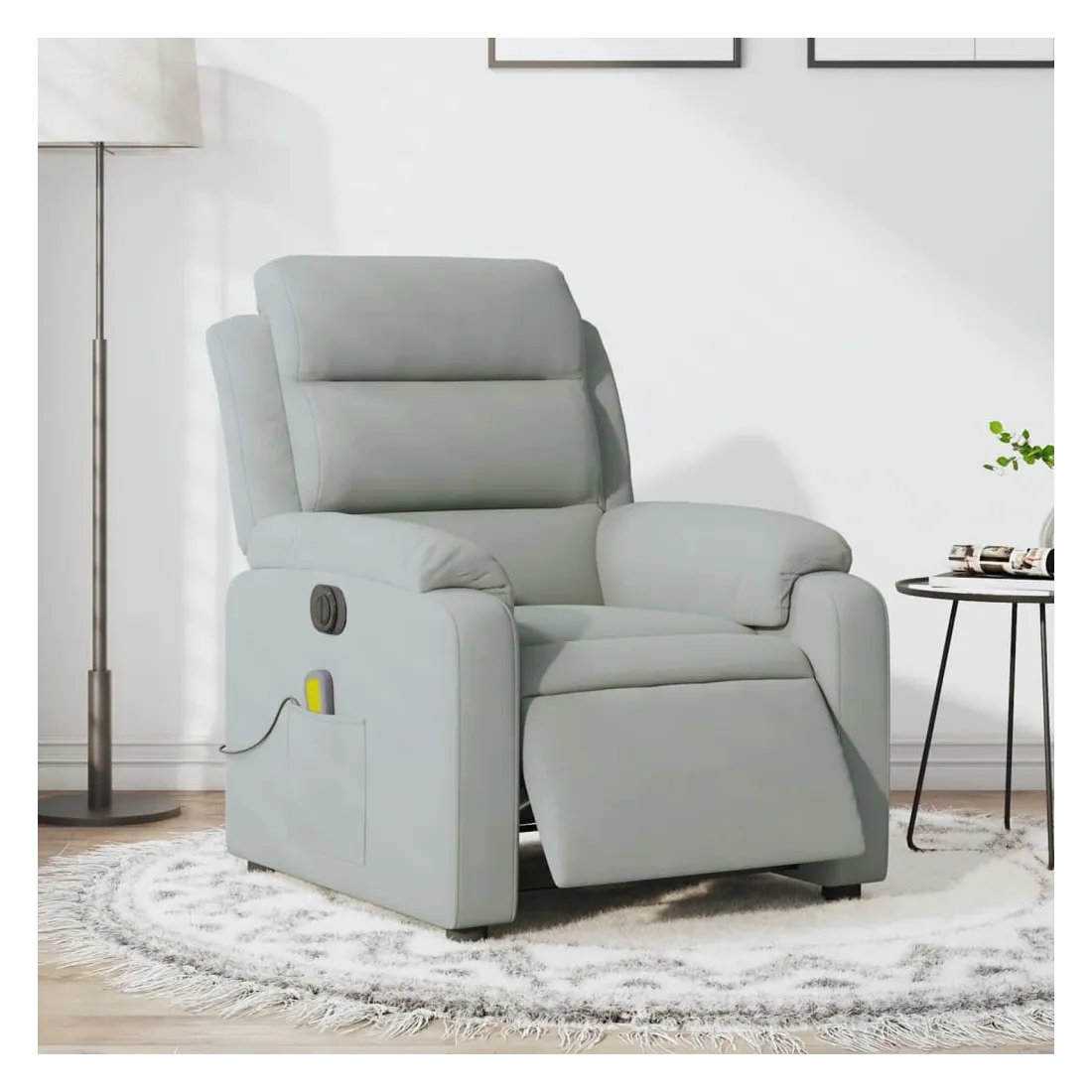 Asseyez-vous et détendez-vous dans ce fauteuil inclinable de massage électrique très confortable ! Fonction d'inclinaison électrique : ce fauteuil inclinable est équipé d'un moteur électrique qui permet de régler automatiquement le repose-pied et le dossier dans n'importe quelle position, selon votre confort, en appuyant simplement sur le bouton situé sur le côté du fauteuil. Cette fonction permet une inclinaison maximale de 135 degrés. En outre, le dossier peut revenir automatiquement à sa position d'origine par une simple pression sur le bouton.Fonction de vibration : les 6 points de massage vous permettent de faire l'expérience d'un massage mieux ciblé. De plus, la télécommande incluse vous permet de choisir différents programmes de massage. La fonction de massage est alimentée par le connecteur USB qui nécessite une source d'alimentation USB certifiée de 5 V (non fournie).Expérience d'assise confortable : le siège, le dossier et les larges accoudoirs rembourrés épais recouverts de velours procurent une sensation confortable et chaleureuse, vous faisant vous sentir enlacé lorsque vous êtes assis. Le velours est un tissu doux et confortable qui est agréable sur la peau.Poche latérale pratique : ce fauteuil est doté d'une poche latérale pour ranger votre télécommande ou garder vos objets essentiels à portée de main.Cadre solide et stable : le cadre en bois et en métal offre une structure solide et une grande stabilité. Ce fauteuil inclinable est confortable et durable.