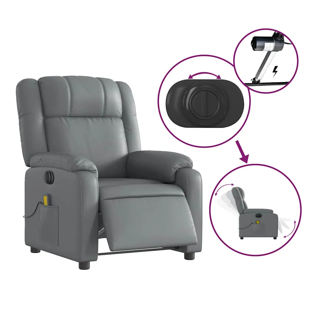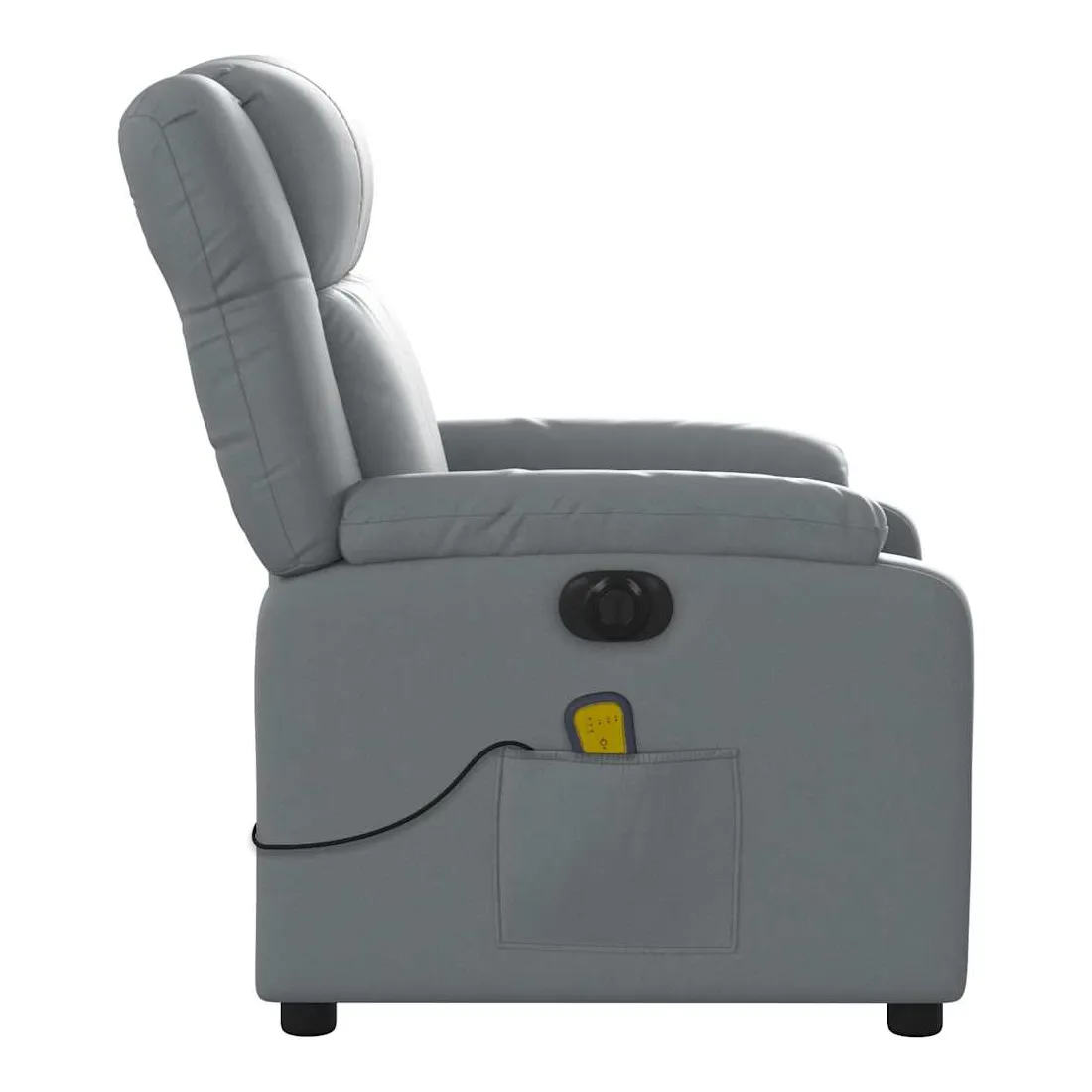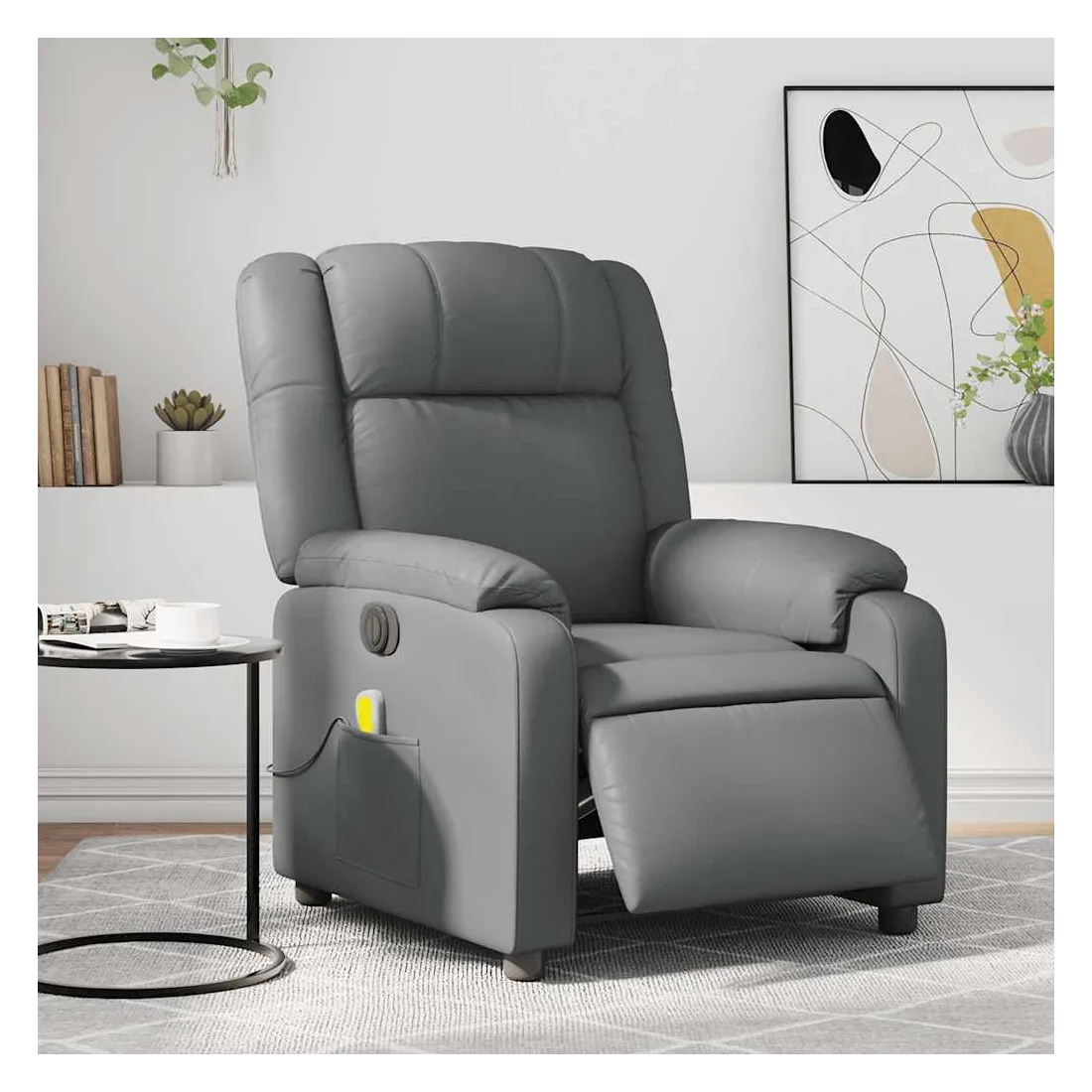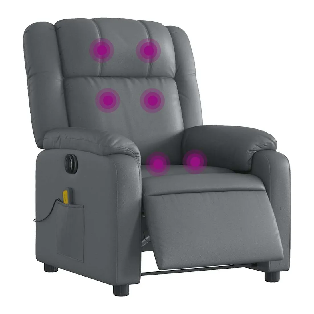 Asseyez-vous et détendez-vous dans ce fauteuil inclinable de massage électrique très confortable ! Fonction d'inclinaison électrique : ce fauteuil inclinable est équipé d'un moteur électrique qui permet de régler automatiquement le repose-pied et le dossier dans n'importe quelle position, selon votre confort, en appuyant simplement sur le bouton situé sur le côté du fauteuil. Cette fonction permet une inclinaison maximale de 135 degrés. En outre, le dossier peut revenir automatiquement à sa position d'origine par une simple pression sur le bouton.Fonction de vibration : les 6 points de massage vous permettent de faire l'expérience d'un massage mieux ciblé. De plus, la télécommande incluse vous permet de choisir différents programmes de massage. La fonction de massage est alimentée par le connecteur USB qui nécessite une source d'alimentation USB certifiée de 5 V (non fournie).Expérience de siège confortable : le siège, le dossier et les larges accoudoirs rembourrés épais recouverts de similicuir procurent une sensation confortable et chaleureuse, vous faisant vous sentir enlacé lorsque vous êtes assis. Le simili cuir est un matériau très résistant. Il est résistant aux taches, ce qui le rend facile à nettoyer avec un chiffon humide. La surface lisse donne également un aspect luxueux et la beauté du cuir véritable.Poche latérale pratique : ce fauteuil est doté d'une poche latérale pour ranger votre télécommande ou garder vos objets essentiels à portée de main.Cadre solide et stable : le cadre en bois et en métal offre une structure solide et une grande stabilité. Ce fauteuil inclinable est confortable et durable.