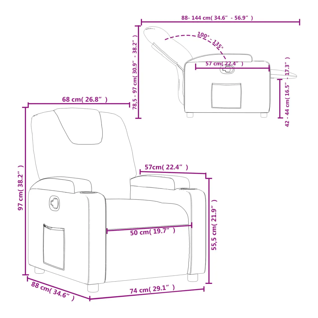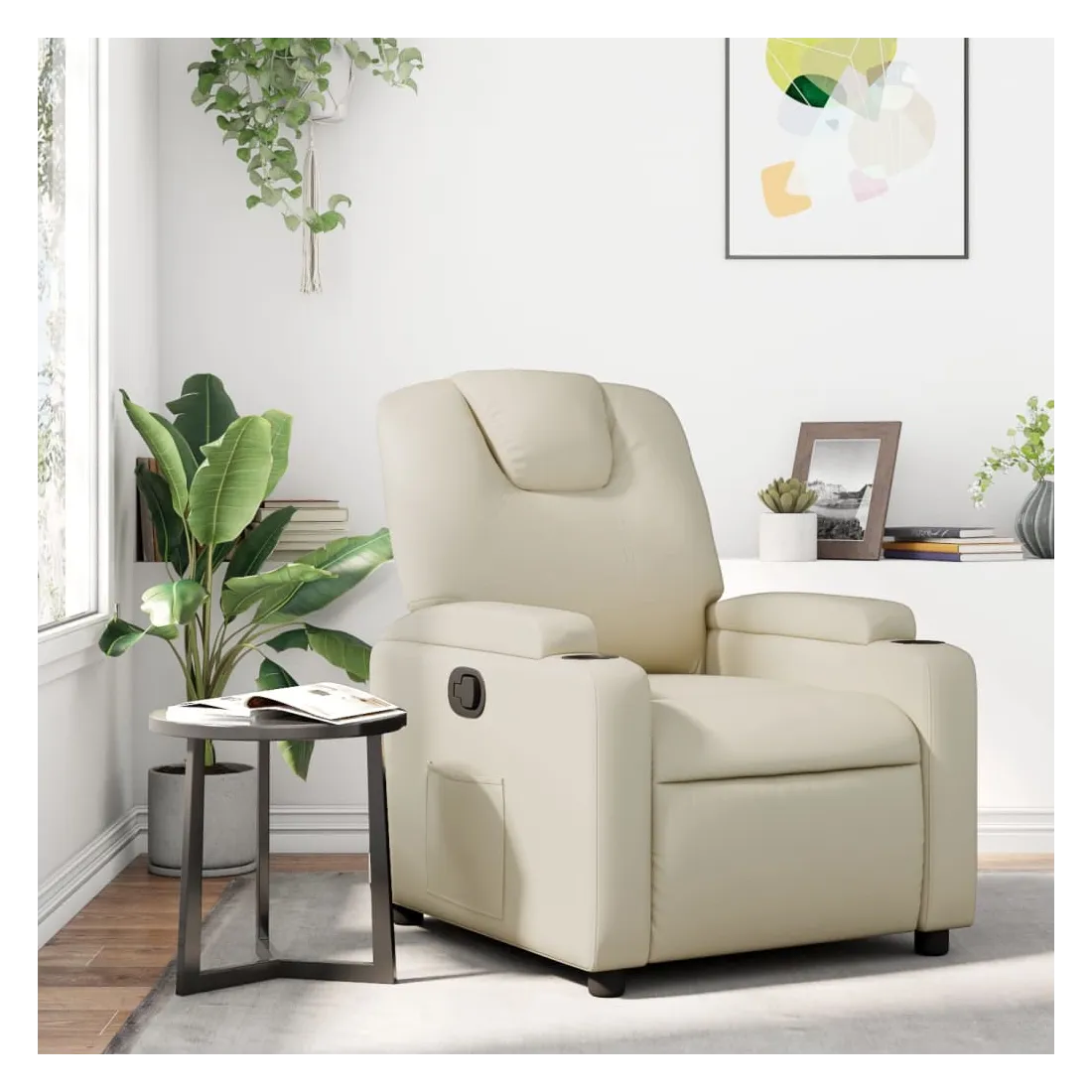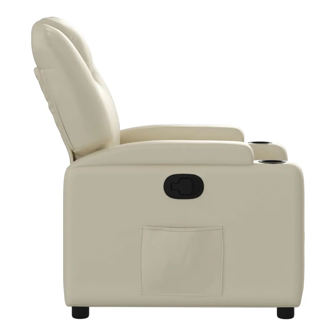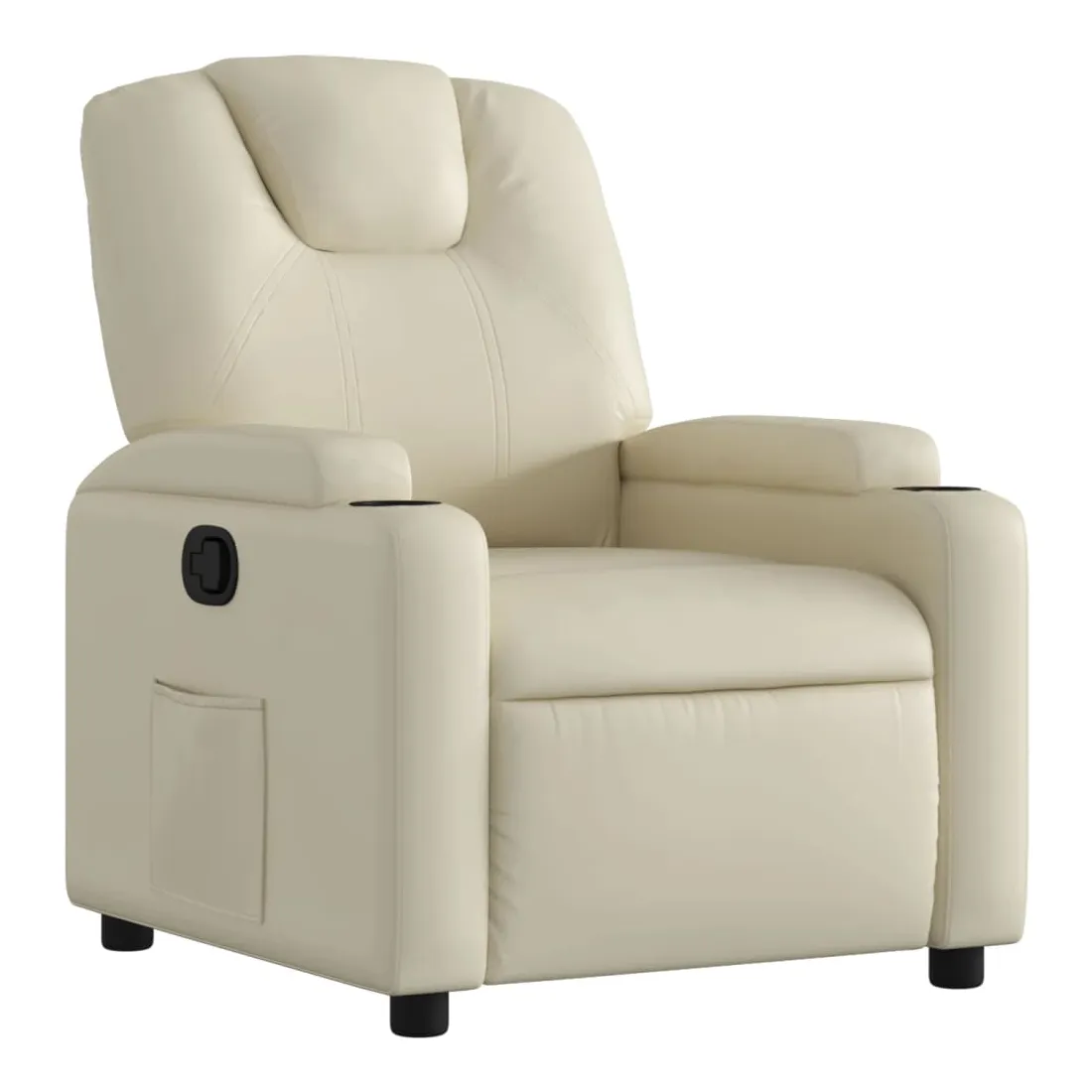 Asseyez-vous et laissez-vous emporter par ce fauteuil inclinable très confortable ! Fonction d'inclinaison manuelle : Ce fauteuil inclinable est doté d'un bouton sur le côté droit. Vous pouvez régler manuellement le repose-pieds et le dossier à n'importe quelle position selon votre confort en tirant simplement sur la poignée. Cette fonction permet une inclinaison maximale de 135 degrés. De plus, le dossier peut revenir rapidement à sa position initiale en tirant facilement sur la poignée.Expérience d'assise confortable : L'assise, le dossier et les larges accoudoirs épais et rembourrés, recouverts de similicuir, offrent une sensation de confort et vous enveloppent confortablement. Le similicuir est un matériau très durable. Il est résistant aux taches, ce qui le rend facile à nettoyer avec un chiffon humide. Sa surface lisse lui confère un aspect luxueux et la beauté du cuir véritable.Porte-gobelets pratiques et poche latérale : Ce fauteuil est doté de deux porte-gobelets pratiques pour vos boissons et d'une poche latérale pour garder vos essentiels à portée de main.Cadre solide et stable : Le cadre en bois et en métal offre une structure solide et stable. Ce fauteuil inclinable est confortable et durable.