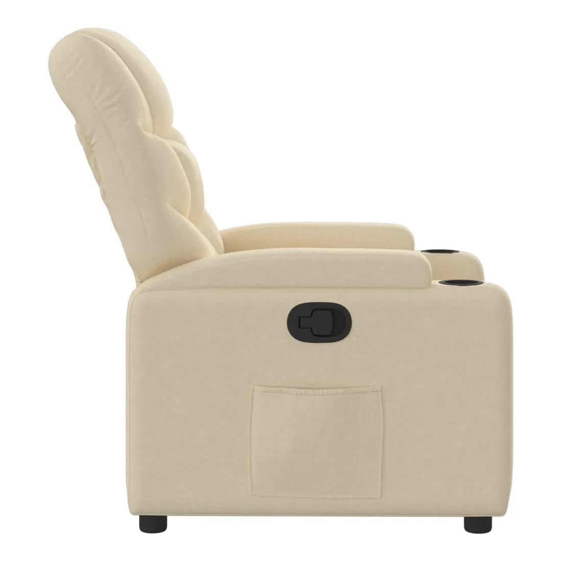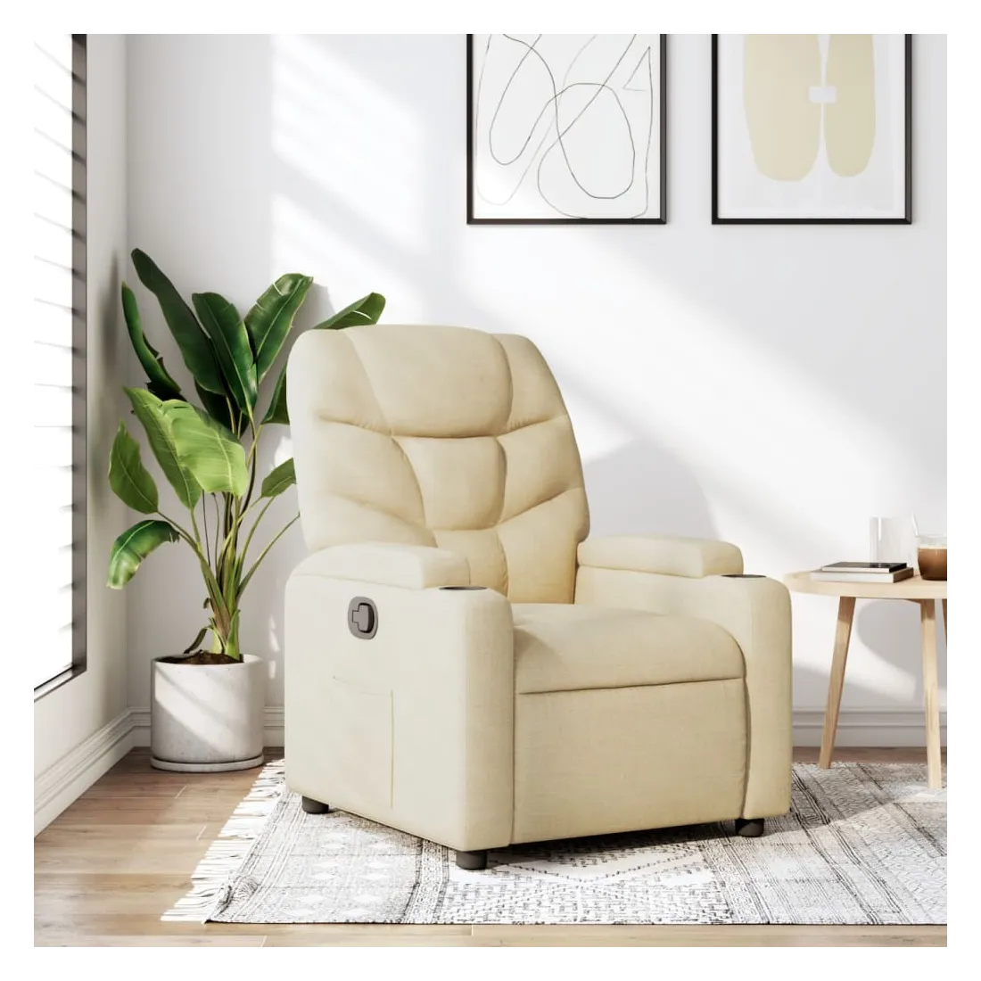 Asseyez-vous et laissez-vous emporter par ce fauteuil inclinable très confortable ! Fonction d'inclinaison manuelle : Ce fauteuil inclinable est doté d'une poignée sur le côté droit. Vous pouvez régler manuellement le repose-pieds et le dossier dans n'importe quelle position selon votre confort en tirant simplement sur la poignée. Cette fonction permet une inclinaison maximale de 135 degrés. De plus, le dossier peut revenir rapidement à sa position initiale en tirant facilement sur la poignée.Expérience d'assise confortable : L'assise, le dossier et les larges accoudoirs rembourrés et recouverts de tissu offrent une sensation de confort et de chaleur, vous donnant l'impression d'être enlacé en position assise. Le tissu présente un aspect simple et épuré, est respirant et durable.Porte-gobelets pratiques et poche latérale : Ce fauteuil est doté de deux porte-gobelets pratiques pour vos boissons et d'une poche latérale pour garder vos objets essentiels à portée de main.Cadre solide et stable : Le cadre en bois et en métal offre une structure solide et stable. Ce fauteuil inclinable est confortable et durable.