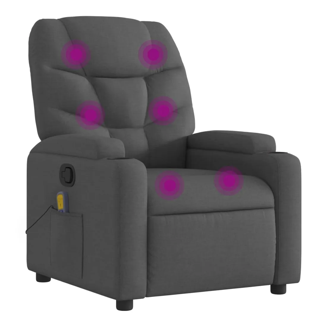 Asseyez-vous et détendez-vous dans ce fauteuil inclinable de massage très confortable ! Fonction d'inclinaison manuelle : ce fauteuil inclinable est doté d'une poignée du côté droit. Vous pouvez régler manuellement le repose-pieds et le dossier dans n'importe quelle position selon votre confort en tirant simplement sur la poignée. Cette fonction permet une inclinaison maximale de 135 degrés. De plus, le dossier peut revenir rapidement à sa position d'origine en tirant simplement sur la poignée.Fonction de vibration : les 6 points de massage vous permettent de faire l'expérience d'un massage mieux ciblé. De plus, la télécommande incluse vous permet de choisir différents programmes de massage. La fonction de massage est alimentée par le connecteur USB, mais la source d'alimentation USB 5V certifiée n'est pas incluse.Expérience d'assise confortable : le siège, le dossier et les larges accoudoirs bien rembourrés recouverts de tissu procurent une sensation confortable et chaleureuse, vous permettant de vous sentir enveloppé lorsque vous êtes assis. Le tissu présente un aspect simple et épuré et est respirant et durable.Porte-gobelets et poche latérale pratiques : ce fauteuil dispose de deux porte-gobelets pratiques pour vos boissons et d'une poche latérale pour votre télécommande ou pour garder vos objets essentiels à portée de main.Cadre solide et stable : le cadre en bois et en métal offre une structure solide et une grande stabilité. Ce fauteuil inclinable est confortable et durable.