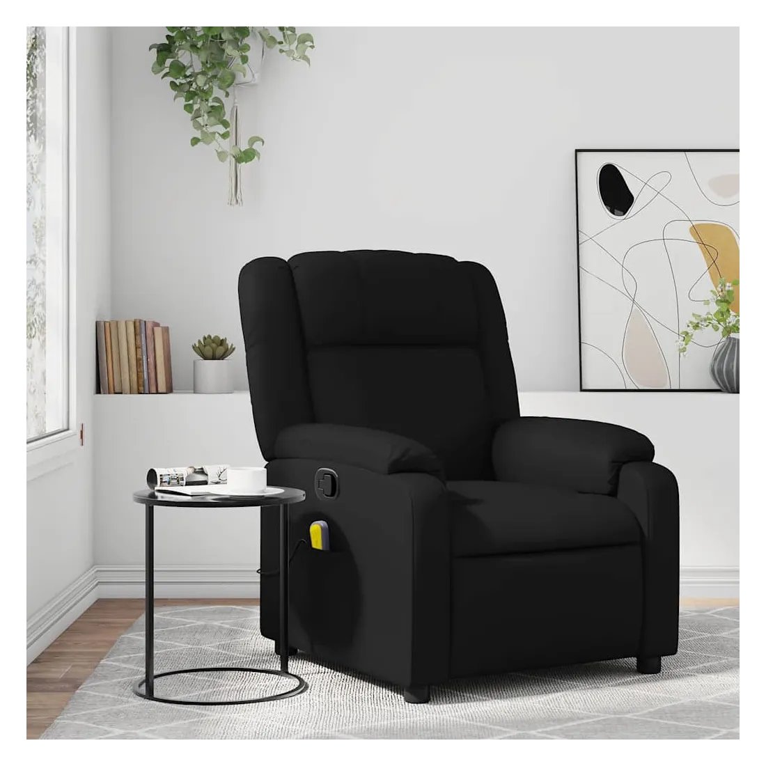 Asseyez-vous et détendez-vous dans ce fauteuil inclinable de massage très confortable ! Fonction d'inclinaison manuelle : ce fauteuil inclinable est doté d'une poignée du côté droit. Vous pouvez régler manuellement le repose-pieds et le dossier dans n'importe quelle position selon votre confort en tirant simplement sur la poignée. Cette fonction permet une inclinaison maximale de 135 degrés. De plus, le dossier peut revenir rapidement à sa position d'origine en tirant simplement sur la poignée.Fonction de vibration : les 6 points de massage vous permettent de faire l'expérience d'un massage mieux ciblé. De plus, la télécommande incluse vous permet de choisir différents programmes de massage. La fonction de massage est alimentée par le connecteur USB, mais la source d'alimentation USB 5V certifiée n'est pas incluse.Expérience de siège confortable : le siège, le dossier et les larges accoudoirs rembourrés épais recouverts de similicuir procurent une sensation confortable, vous faisant vous sentir enlacé lorsque vous êtes assis. Le similicuir est un matériau très résistant. Il est résistant aux taches, ce qui le rend facile à nettoyer avec un chiffon humide. La surface lisse donne également un aspect luxueux et la beauté du cuir véritable.Poche latérale pratique : ce fauteuil est doté d'une poche latérale pour ranger votre télécommande ou garder vos objets essentiels à portée de main.Cadre solide et stable : le cadre en bois et en métal offre une structure solide et une grande stabilité. Ce fauteuil inclinable est confortable et durable.