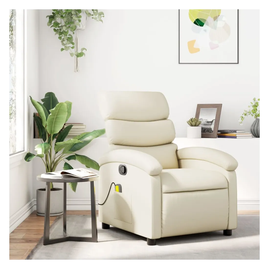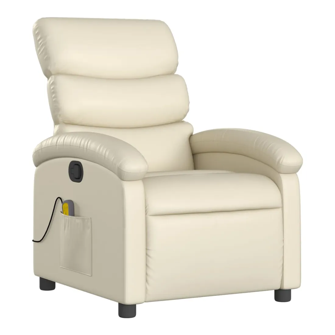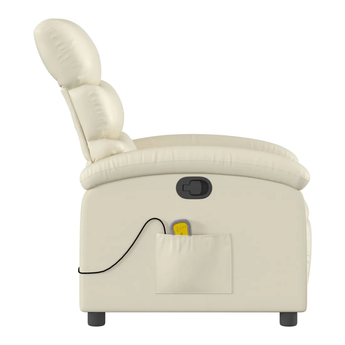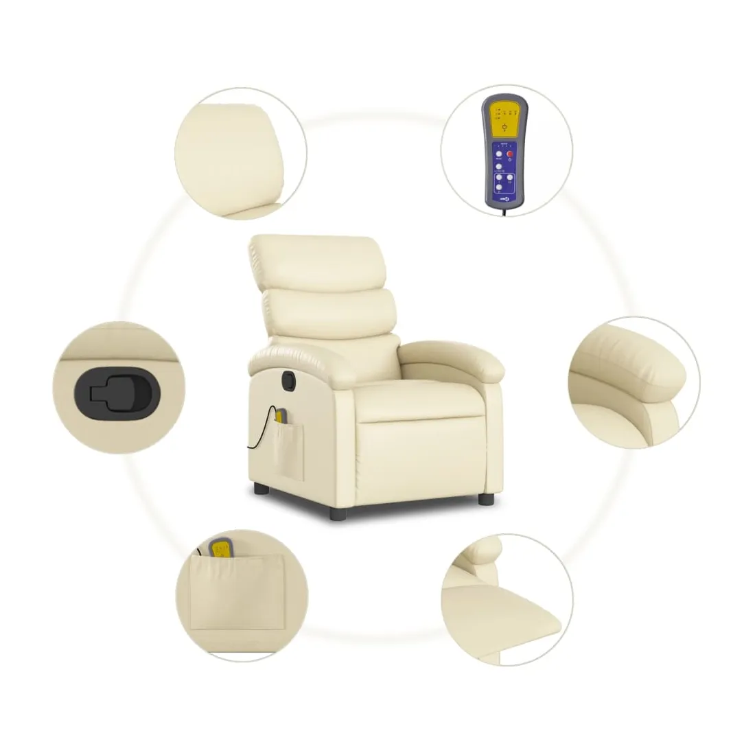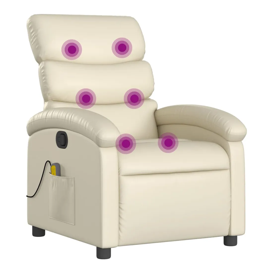 Asseyez-vous et détendez-vous dans ce fauteuil inclinable de massage très confortable ! Fonction d'inclinaison manuelle : ce fauteuil inclinable est doté d'une poignée du côté droit. Vous pouvez régler manuellement le repose-pieds et le dossier dans n'importe quelle position selon votre confort en tirant simplement sur la poignée. Cette fonction permet une inclinaison maximale de 135 degrés. De plus, le dossier peut revenir rapidement à sa position d'origine en tirant simplement sur la poignée.Fonction de vibration : les 6 points de massage vous permettent de faire l'expérience d'un massage mieux ciblé. De plus, la télécommande incluse vous permet de choisir différents programmes de massage. La fonction de massage est alimentée par le connecteur USB, mais la source d'alimentation USB 5V certifiée n'est pas incluse.Expérience de siège confortable : le siège, le dossier et les larges accoudoirs rembourrés épais recouverts de similicuir procurent une sensation confortable, vous faisant vous sentir enlacé lorsque vous êtes assis. Le similicuir est un matériau très résistant. Il est résistant aux taches, ce qui le rend facile à nettoyer avec un chiffon humide. La surface lisse donne également un aspect luxueux et la beauté du cuir véritable.Poche latérale pratique : ce fauteuil est doté d'une poche latérale pour ranger votre télécommande ou garder vos objets essentiels à portée de main.Cadre solide et stable : le cadre en bois et en métal offre une structure solide et une grande stabilité. Ce fauteuil inclinable est confortable et durable.