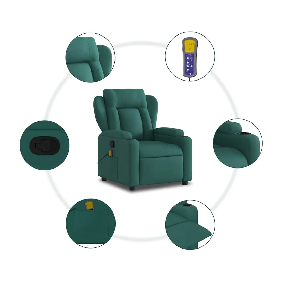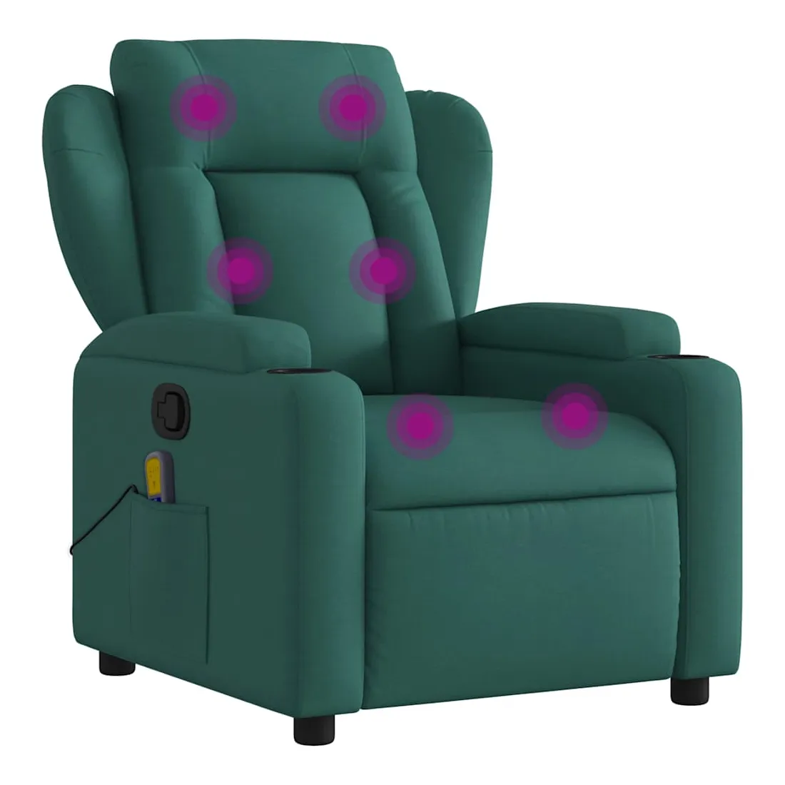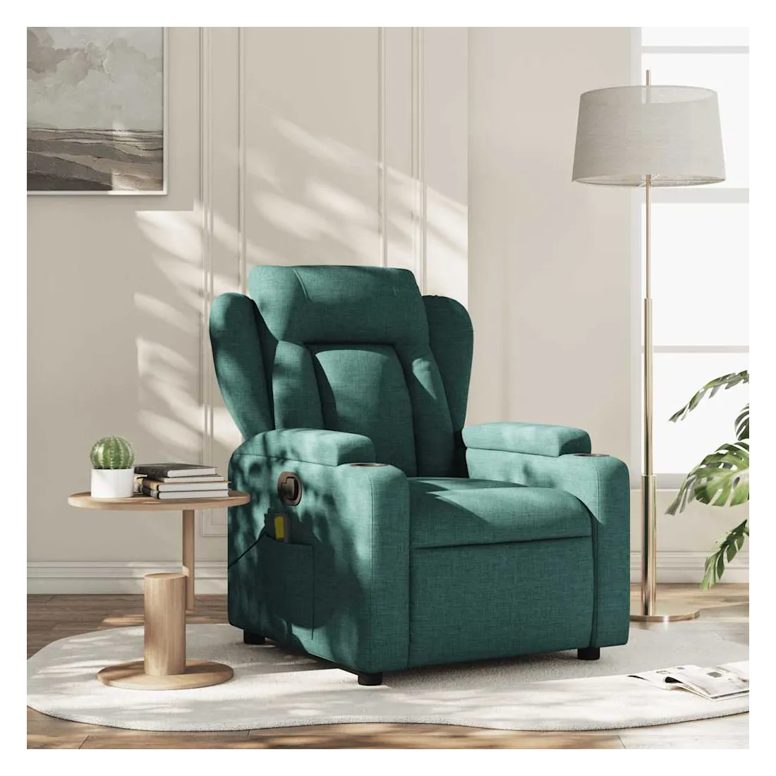 Asseyez-vous et détendez-vous dans ce fauteuil inclinable de massage très confortable ! Fonction d'inclinaison manuelle : ce fauteuil inclinable est doté d'une poignée du côté droit. Vous pouvez régler manuellement le repose-pieds et le dossier dans n'importe quelle position selon votre confort en tirant simplement sur la poignée. Cette fonction permet une inclinaison maximale de 135 degrés. De plus, le dossier peut revenir rapidement à sa position d'origine en tirant simplement sur la poignée.Fonction de vibration : les 6 points de massage vous permettent de faire l'expérience d'un massage mieux ciblé. De plus, la télécommande incluse vous permet de choisir différents programmes de massage. La fonction de massage est alimentée par le connecteur USB, mais la source d'alimentation USB 5V certifiée n'est pas incluse.Expérience d'assise confortable : le siège, le dossier et les larges accoudoirs bien rembourrés recouverts de tissu procurent une sensation confortable et chaleureuse, vous permettant de vous sentir enveloppé lorsque vous êtes assis. Le tissu présente un aspect simple et épuré et est respirant et durable.Porte-gobelets et poche latérale pratiques : ce fauteuil dispose de deux porte-gobelets pratiques pour vos boissons et d'une poche latérale pour votre télécommande ou pour garder vos objets essentiels à portée de main.Cadre solide et stable : le cadre en bois et en métal offre une structure solide et une grande stabilité. Ce fauteuil inclinable est confortable et durable.