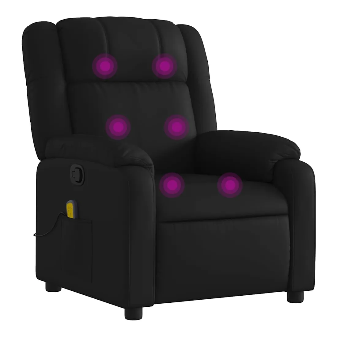 Asseyez-vous et détendez-vous dans ce fauteuil inclinable de massage très confortable ! Fonction d'inclinaison manuelle : ce fauteuil inclinable est doté d'une poignée du côté droit. Vous pouvez régler manuellement le repose-pieds et le dossier dans n'importe quelle position selon votre confort en tirant simplement sur la poignée. Cette fonction permet une inclinaison maximale de 135 degrés. De plus, le dossier peut revenir rapidement à sa position d'origine en tirant simplement sur la poignée.Fonction de vibration : les 6 points de massage vous permettent de faire l'expérience d'un massage mieux ciblé. De plus, la télécommande incluse vous permet de choisir différents programmes de massage. La fonction de massage est alimentée par le connecteur USB, mais la source d'alimentation USB 5V certifiée n'est pas incluse.Expérience de siège confortable : le siège, le dossier et les larges accoudoirs rembourrés épais recouverts de similicuir procurent une sensation confortable, vous faisant vous sentir enlacé lorsque vous êtes assis. Le similicuir est un matériau très résistant. Il est résistant aux taches, ce qui le rend facile à nettoyer avec un chiffon humide. La surface lisse donne également un aspect luxueux et la beauté du cuir véritable.Poche latérale pratique : ce fauteuil est doté d'une poche latérale pour ranger votre télécommande ou garder vos objets essentiels à portée de main.Cadre solide et stable : le cadre en bois et en métal offre une structure solide et une grande stabilité. Ce fauteuil inclinable est confortable et durable.