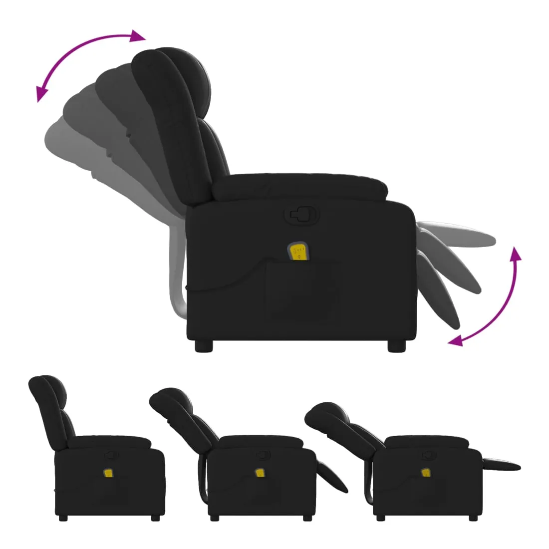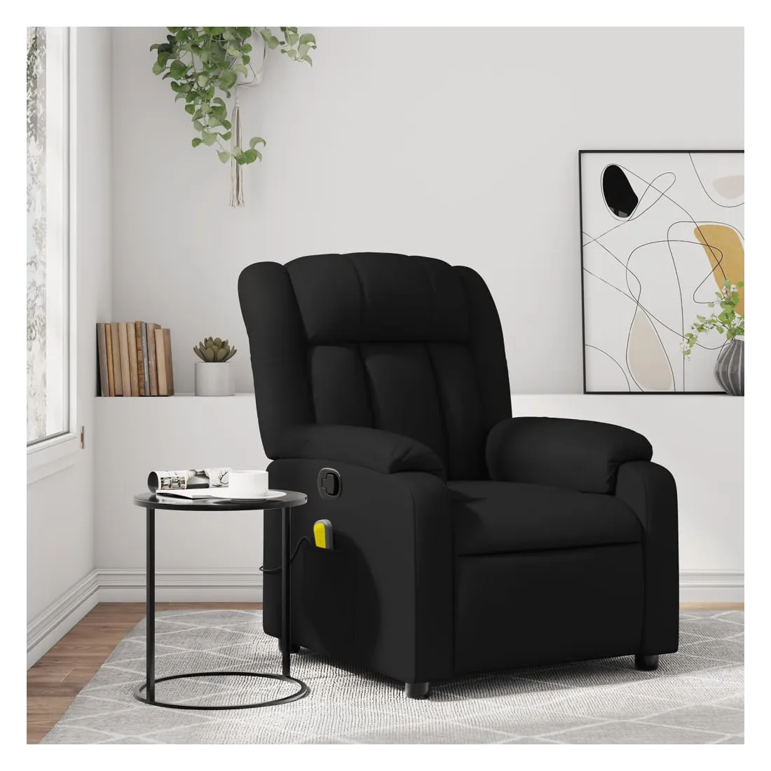 Asseyez-vous et détendez-vous dans ce fauteuil inclinable de massage très confortable ! Fonction d'inclinaison manuelle : ce fauteuil inclinable est doté d'une poignée du côté droit. Vous pouvez régler manuellement le repose-pieds et le dossier dans n'importe quelle position selon votre confort en tirant simplement sur la poignée. Cette fonction permet une inclinaison maximale de 135 degrés. De plus, le dossier peut revenir rapidement à sa position d'origine en tirant simplement sur la poignée.Fonction de vibration : les 6 points de massage vous permettent de faire l'expérience d'un massage mieux ciblé. De plus, la télécommande incluse vous permet de choisir différents programmes de massage. La fonction de massage est alimentée par le connecteur USB, mais la source d'alimentation USB 5V certifiée n'est pas incluse.Expérience de siège confortable : le siège, le dossier et les larges accoudoirs rembourrés épais recouverts de similicuir procurent une sensation confortable, vous faisant vous sentir enlacé lorsque vous êtes assis. Le similicuir est un matériau très résistant. Il est résistant aux taches, ce qui le rend facile à nettoyer avec un chiffon humide. La surface lisse donne également un aspect luxueux et la beauté du cuir véritable.Poche latérale pratique : ce fauteuil est doté d'une poche latérale pour ranger votre télécommande ou garder vos objets essentiels à portée de main.Cadre solide et stable : le cadre en bois et en métal offre une structure solide et une grande stabilité. Ce fauteuil inclinable est confortable et durable.