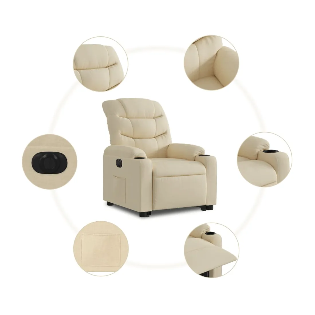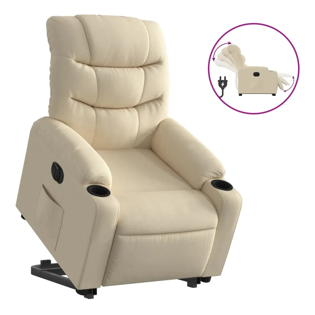 Asseyez-vous et détendez-vous dans ce fauteuil inclinable électrique très confortable ! Fonction de levage électrique : ce fauteuil inclinable pour personnes âgées est équipé d'un moteur électrique pour la fonction de levage. Grâce à la fonction qui pousse toute la chaise vers le haut, vous pouvez facilement vous tenir debout sans stresser votre dos et vos genoux en appuyant simplement sur le bouton.Fonction d'inclinaison électrique : ce fauteuil inclinable est également équipé d'un moteur électrique qui permet de régler automatiquement le repose-pied et le dossier dans n'importe quelle position, selon votre confort, en appuyant simplement sur le bouton situé sur le côté du fauteuil. Cette fonction permet une inclinaison maximale de 135 degrés. En outre, le dossier peut revenir automatiquement à sa position d'origine par une simple pression sur le bouton.Expérience d'assise confortable : le siège, le dossier et les larges accoudoirs bien rembourrés recouverts de tissu procurent une sensation confortable et chaleureuse, vous permettant de vous sentir enveloppé lorsque vous êtes assis. Le tissu présente un aspect simple et épuré et est respirant et durable.Poche latérale pratique : ce fauteuil est doté d'une poche latérale pour vous permettre de garder vos objets essentiels à portée de main.Cadre solide et stable : le cadre en bois et en métal offre une structure solide et une grande stabilité. Ce fauteuil inclinable est confortable et durable.