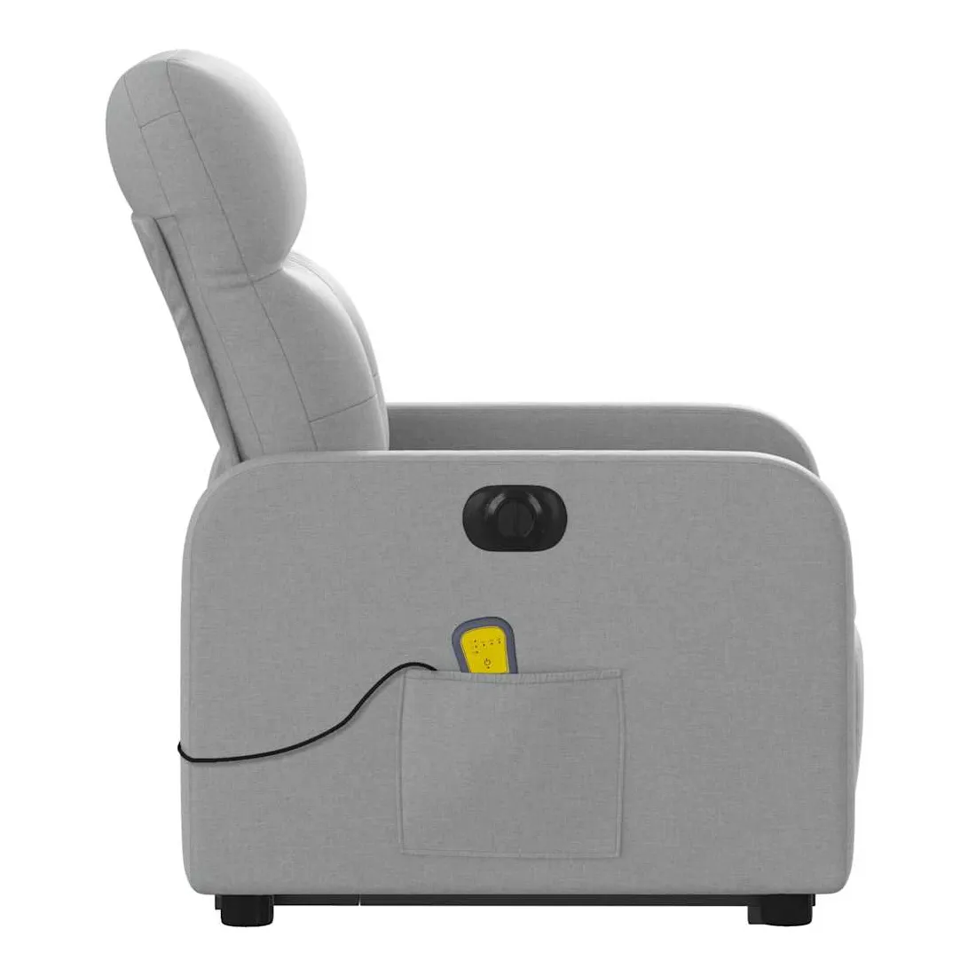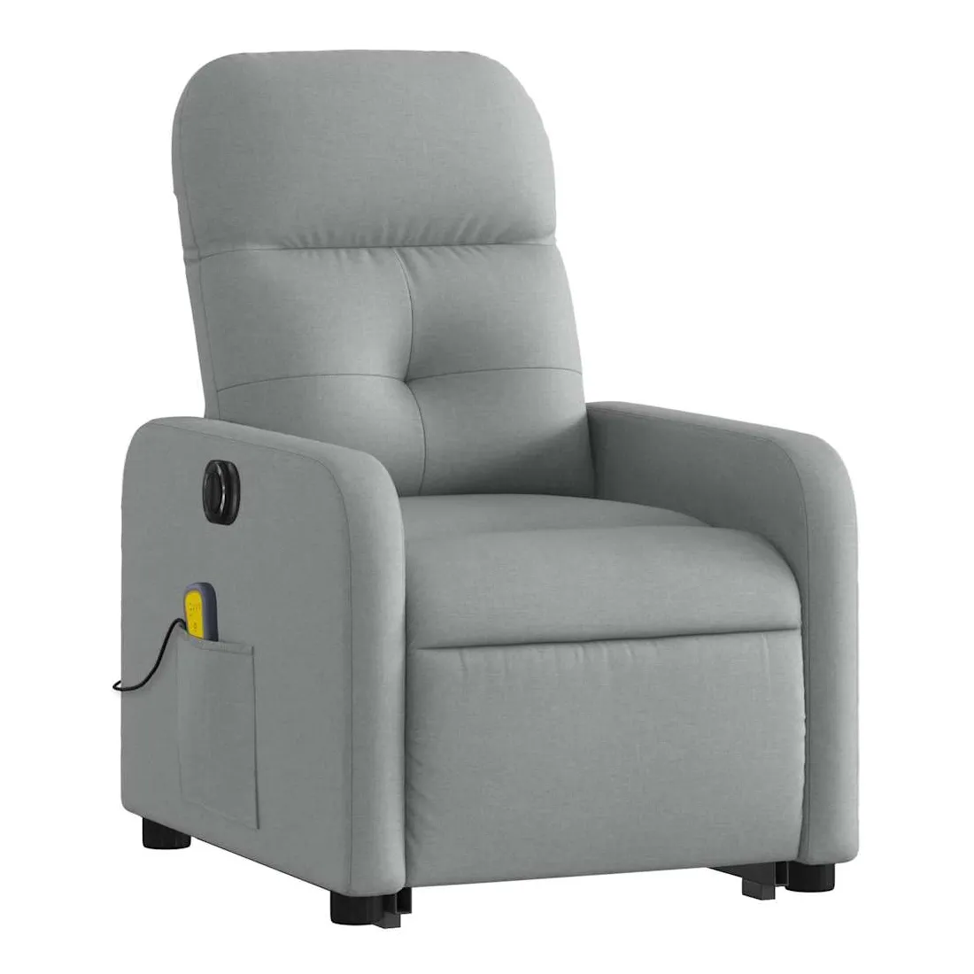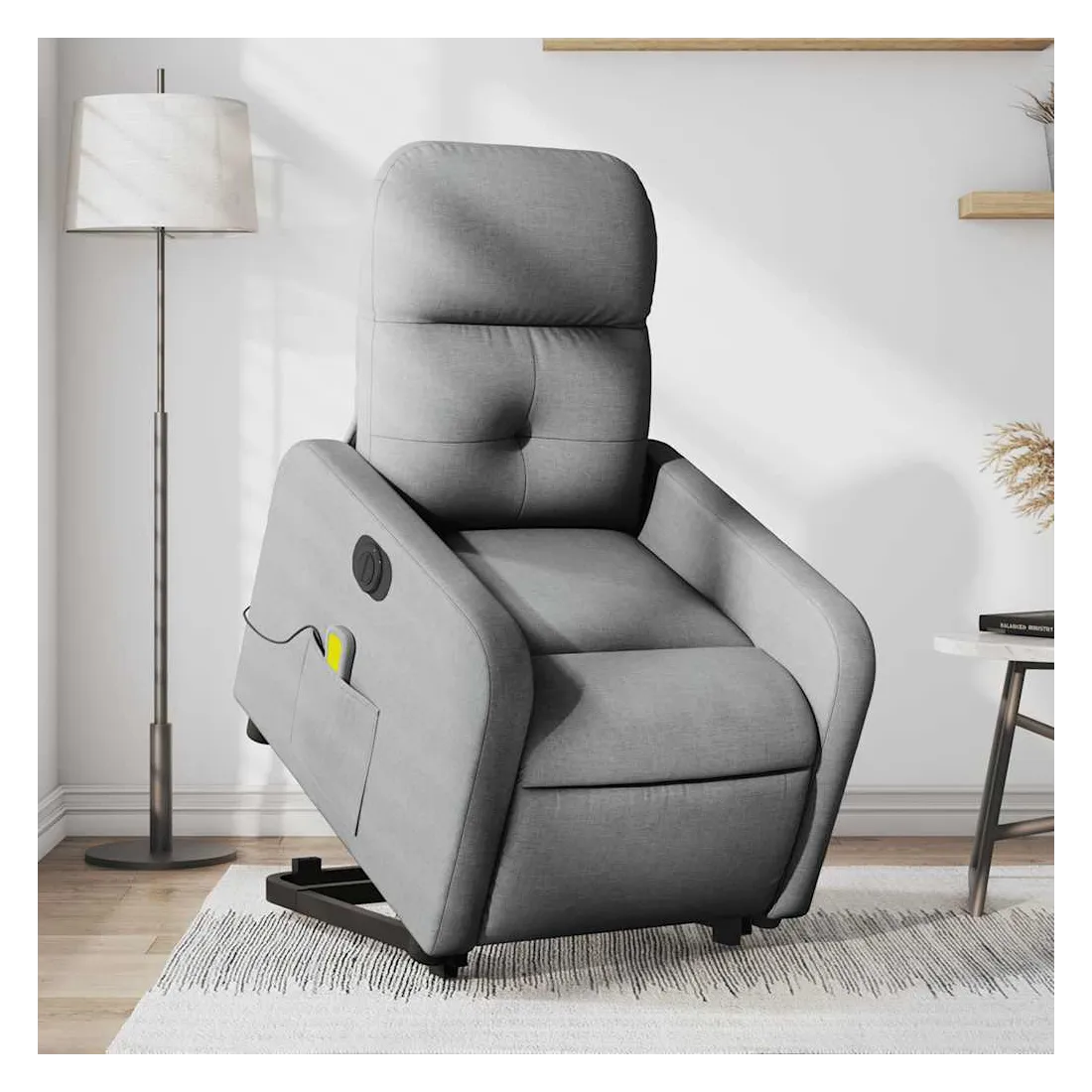 Asseyez-vous et détendez-vous dans ce fauteuil inclinable de massage électrique très confortable ! Fonction de levage électrique : ce fauteuil inclinable pour personnes âgées est équipé d'un moteur électrique pour la fonction de levage. Grâce à la fonction qui pousse toute la chaise vers le haut, vous pouvez facilement vous tenir debout sans stresser votre dos et vos genoux en appuyant simplement sur le bouton.Fonction d'inclinaison électrique : ce fauteuil inclinable est également équipé d'un moteur électrique qui permet de régler automatiquement le repose-pied et le dossier dans n'importe quelle position, selon votre confort, en appuyant simplement sur le bouton situé sur le côté du fauteuil. Cette fonction permet une inclinaison maximale de 135 degrés. En outre, le dossier peut revenir automatiquement à sa position d'origine par une simple pression sur le bouton.Fonction de vibration : les 6 points de massage vous permettent de faire l'expérience d'un massage mieux ciblé. De plus, la télécommande incluse vous permet de choisir différents programmes de massage. La fonction de massage est alimentée par le connecteur USB qui nécessite une source d'alimentation USB certifiée de 5 V (non fournie).Expérience d'assise confortable : le siège, le dossier et les larges accoudoirs bien rembourrés recouverts de tissu procurent une sensation confortable et chaleureuse, vous permettant de vous sentir enveloppé lorsque vous êtes assis. Le tissu présente un aspect simple et épuré et est respirant et durable.Poche latérale pratique : ce fauteuil est doté d'une poche latérale pour ranger votre télécommande ou garder vos objets essentiels à portée de main.