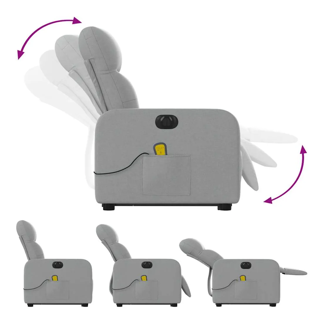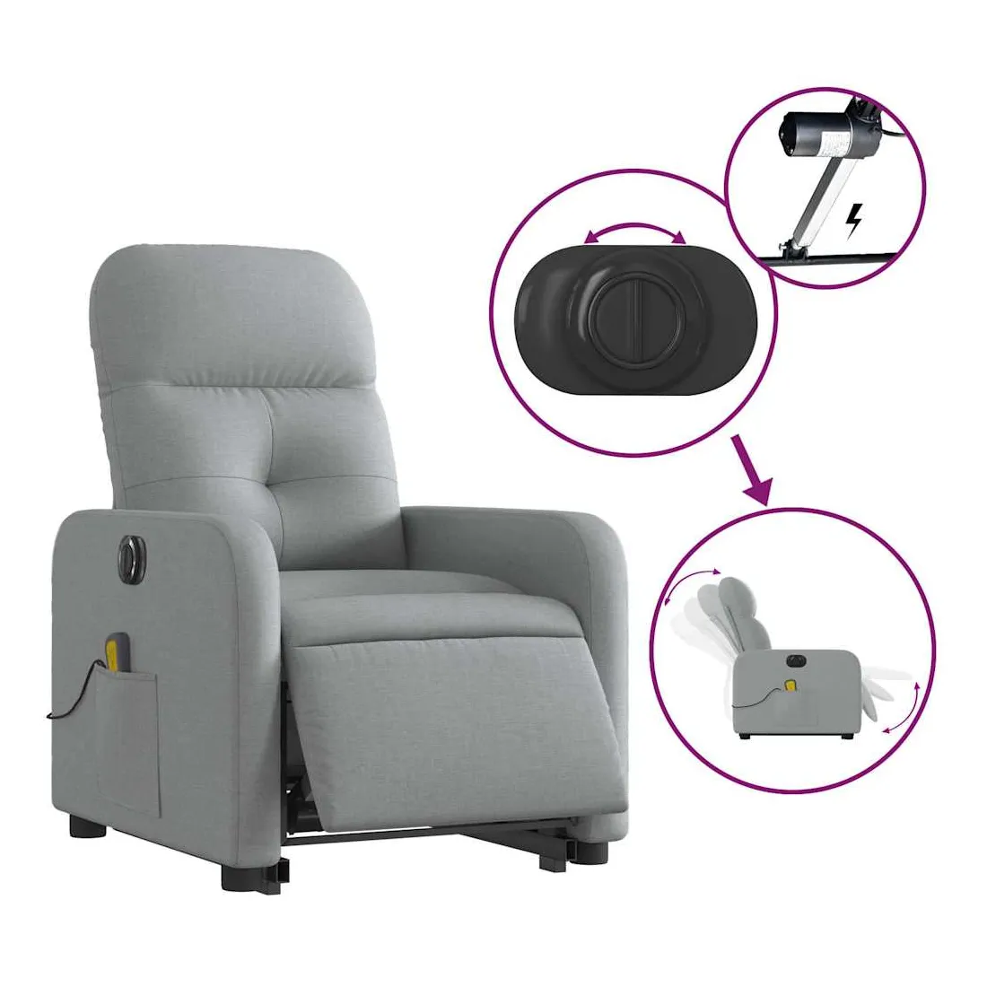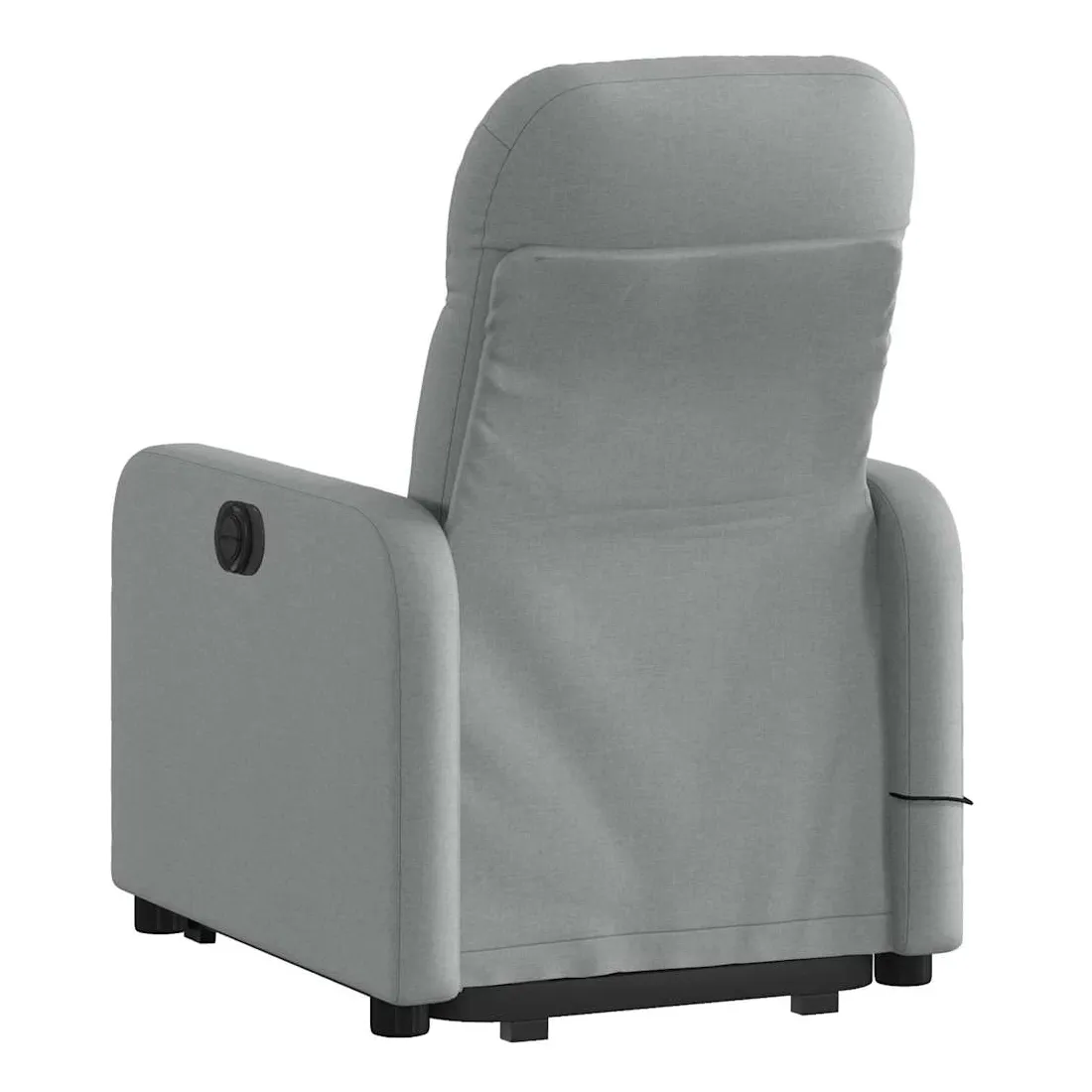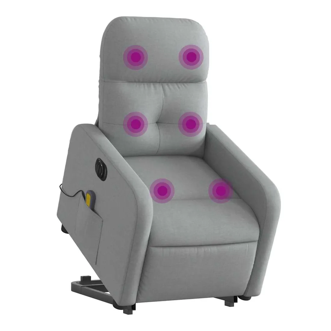 Asseyez-vous et détendez-vous dans ce fauteuil inclinable de massage électrique très confortable ! Fonction de levage électrique : ce fauteuil inclinable pour personnes âgées est équipé d'un moteur électrique pour la fonction de levage. Grâce à la fonction qui pousse toute la chaise vers le haut, vous pouvez facilement vous tenir debout sans stresser votre dos et vos genoux en appuyant simplement sur le bouton.Fonction d'inclinaison électrique : ce fauteuil inclinable est également équipé d'un moteur électrique qui permet de régler automatiquement le repose-pied et le dossier dans n'importe quelle position, selon votre confort, en appuyant simplement sur le bouton situé sur le côté du fauteuil. Cette fonction permet une inclinaison maximale de 135 degrés. En outre, le dossier peut revenir automatiquement à sa position d'origine par une simple pression sur le bouton.Fonction de vibration : les 6 points de massage vous permettent de faire l'expérience d'un massage mieux ciblé. De plus, la télécommande incluse vous permet de choisir différents programmes de massage. La fonction de massage est alimentée par le connecteur USB qui nécessite une source d'alimentation USB certifiée de 5 V (non fournie).Expérience d'assise confortable : le siège, le dossier et les larges accoudoirs bien rembourrés recouverts de tissu procurent une sensation confortable et chaleureuse, vous permettant de vous sentir enveloppé lorsque vous êtes assis. Le tissu présente un aspect simple et épuré et est respirant et durable.Poche latérale pratique : ce fauteuil est doté d'une poche latérale pour ranger votre télécommande ou garder vos objets essentiels à portée de main.