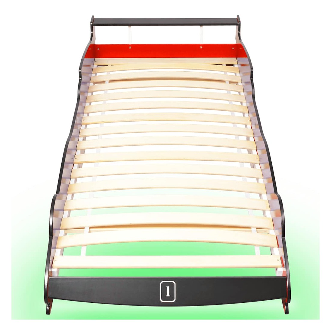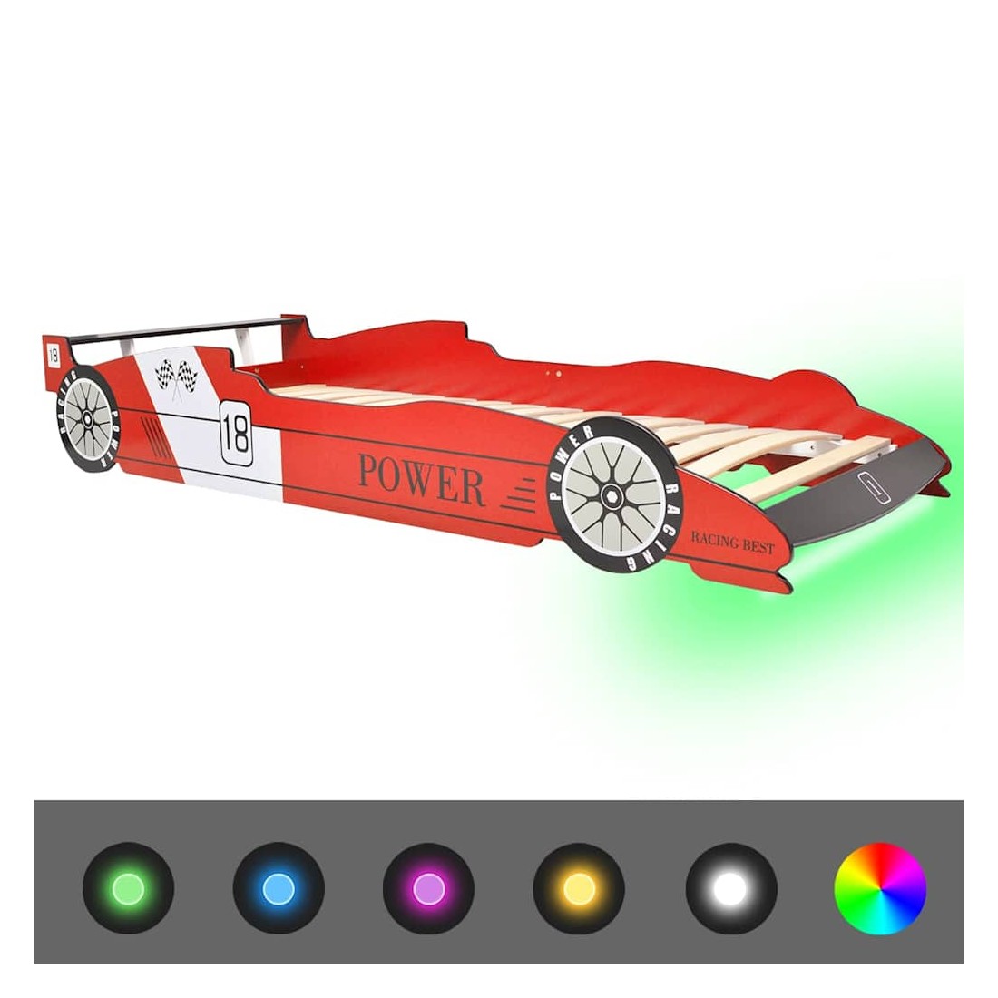 Ce lit pour enfants avec une conception de voiture de course attrayante et une construction solide sera un véritable élément attrayant dans la chambre à coucher de votre enfant. Confortable, fonctionnel et esthétique, ce lit est conçu pour assurer le plus grand confort et une sécurité maximale pour les enfants. Il est équipé d'une bande LED à changement de couleur qui va créer un effet de lumière magnifique. Fabriqué à partir de matériaux de haute qualité, ce lit est doté d'une construction solide et robuste. Il est conçu avec des rails des deux côtés pour empêcher votre enfant de tomber du lit. Les lattes robustes offrent le support nécessaire et peuvent résister à l'usure quotidienne. Avec la télécommande incluse, vous pouvez facilement régler la luminosité et les motifs de changement de couleur de la bande lumineuse LED pour créer un spectacle de lumière captivant pour votre tout-petit. L'assemblage est facile. Le lit convient à un matelas mesurant 90 x 200 cm. Remarque 1 : La livraison inclut uniquement le cadre de lit ; un matelas n'est pas inclus.Remarque 2 : Nous recommandons que le jeu de bandes LED soit utilisé sous la supervision d'un adulte.