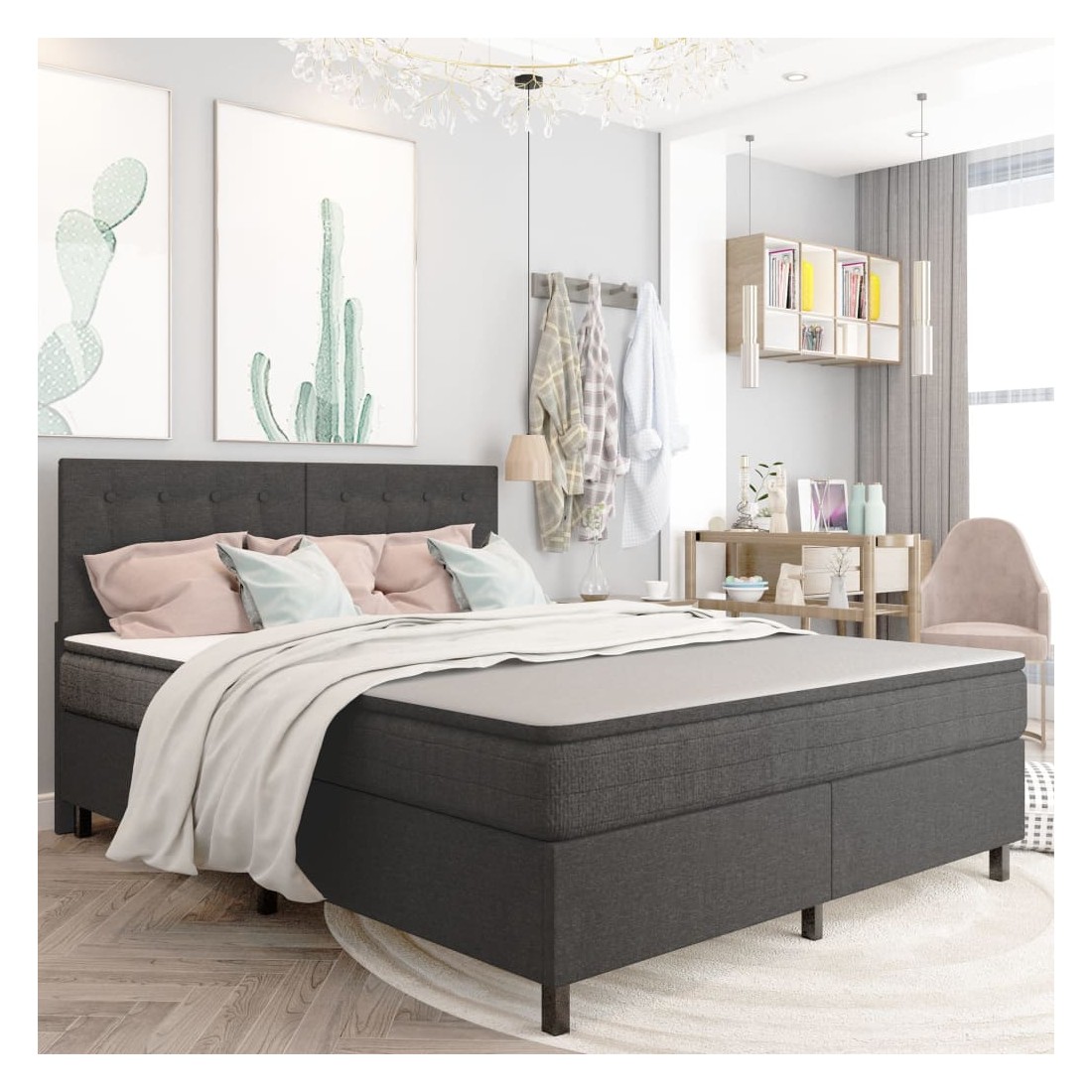 Ce sommier tapissier ajoute une touche de charme élégant à la décoration de votre chambre à coucher avec un design sobre. Le cadre de lit, en MDF et en métal, est extrêmement robuste et durable. Rembourré d'un tissu durable et résistant à l'usure, le lit dégage un look accueillant et il est facile à nettoyer. Doté d'une épaisseur supplémentaire d'env. 20 cm, le matelas à dessus de couette avec sommiers amortisseurs vous assure une bonne nuit de sommeil. Il est fait de mousse spécialement conçue avec des couches pour soulager les points de pression. La conception du ressort interne comporte des ressorts supplémentaires qui offrent un soutien optimal. C'est également une excellente solution pour les personnes lourdes et les personnes souffrant de transpiration excessive. Le matelas retrouve sa forme après pression. De plus, le surmatelas peut être enlevé facilement et lavée en ouvrant la fermeture éclair. Ce produit est facile à assembler. Remarque : pour des raisons d'hygiène, le matelas et le surmatelas ne peuvent être retournée si l'emballage est retiré ou ouvert.