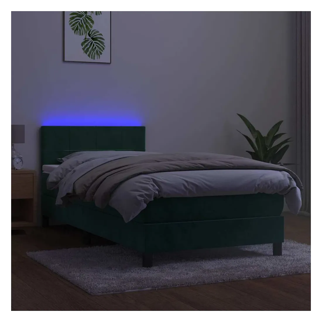 Utilisez ce sommier tapissier avec matelas et LED pour profiter d'un sommeil réparateur ! C'est le point central de votre chambre à coucher. Velours doux : le velours est un tissu doux et luxueux qui se reconnaît à son tas dense de fibres uniformément coupées qui ont une touche lisse. Le tissu en velours présente un toucher doux distinctif, ce qui le rend confortable au toucher.Tête de lit pratique : la tête de lit est réglable en hauteur selon vos préférences. La tête de lit vous offre un excellent soutien du dos lorsque vous êtes assis dans votre lit pour lire ou regarder la télévision.Bande LED colorée : apportez de l'éclairage dans l'obscurité avec des lumières LED colorées !Matelas à ressorts ensachés : le ressort ensaché individuel intégré est connu pour sa très haute qualité tout en assurant un haut niveau de durabilité et d'adaptabilité. Il peut absorber efficacement le bruit et les chocs causés par les sauts et les rotations.Protège-matelas doux pour la peau : le protège-matelas est recouvert d'un tissu résistant et doux pour la peau, ce qui le rend souple et confortable. Remarque :Pour des raisons d'hygiène, le matelas ne peut pas être retourné si l'emballage est retiré ou ouvert.Chaque produit est livré avec un manuel de montage dans la boîte pour un montage facile.Seule la partie avec un symbole de ciseaux peut être coupée et seule la partie avec l'USB continuera à fonctionner comme avant.Ce produit est doté d'un connecteur USB, mais la source d'alimentation certifiée de USB 5V n'est pas incluse.