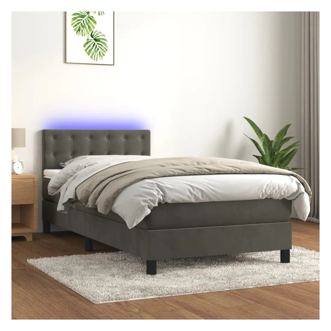 Utilisez ce sommier tapissier avec matelas et LED pour profiter d'un sommeil réparateur ! C'est le point central de votre chambre à coucher. Velours doux : le velours est un tissu doux et luxueux qui se reconnaît à son tas dense de fibres uniformément coupées qui ont une touche lisse. Le tissu en velours présente un toucher doux distinctif, ce qui le rend confortable au toucher.Tête de lit pratique : la tête de lit est réglable en hauteur selon vos préférences. La tête de lit vous offre un excellent soutien du dos lorsque vous êtes assis dans votre lit pour lire ou regarder la télévision.Bande LED colorée : apportez de l'éclairage dans l'obscurité avec des lumières LED colorées !Matelas à ressorts ensachés : le ressort ensaché individuel intégré est connu pour sa très haute qualité tout en assurant un haut niveau de durabilité et d'adaptabilité. Il peut absorber efficacement le bruit et les chocs causés par les sauts et les rotations.Protège-matelas doux pour la peau : le protège-matelas est recouvert d'un tissu résistant et doux pour la peau, ce qui le rend souple et confortable. Remarque :Pour des raisons d'hygiène, le matelas ne peut pas être retourné si l'emballage est retiré ou ouvert.Chaque produit est livré avec un manuel de montage dans la boîte pour un montage facile.Seule la partie avec un symbole de ciseaux peut être coupée et seule la partie avec l'USB continuera à fonctionner comme avant.Ce produit est doté d'un connecteur USB, mais la source d'alimentation certifiée de USB 5V n'est pas incluse.