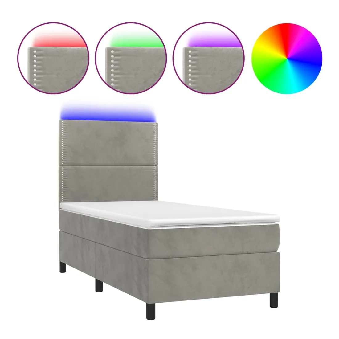 Utilisez ce sommier tapissier avec matelas et LED pour profiter d'un sommeil réparateur ! C'est le point central de votre chambre à coucher. Velours doux : le velours est un tissu doux et luxueux qui se reconnaît à son tas dense de fibres uniformément coupées qui ont une touche lisse. Le tissu en velours présente un toucher doux distinctif, ce qui le rend confortable au toucher.Tête de lit pratique : la tête de lit est réglable en hauteur selon vos préférences. La tête de lit vous offre un excellent soutien du dos lorsque vous êtes assis dans votre lit pour lire ou regarder la télévision.Bande LED colorée : apportez de l'éclairage dans l'obscurité avec des lumières LED colorées !Matelas à ressorts ensachés : le ressort ensaché individuel intégré est connu pour sa très haute qualité tout en assurant un haut niveau de durabilité et d'adaptabilité. Il peut absorber efficacement le bruit et les chocs causés par les sauts et les rotations.Protège-matelas doux pour la peau : le protège-matelas est recouvert d'un tissu résistant et doux pour la peau, ce qui le rend souple et confortable. Remarque :Pour des raisons d'hygiène, le matelas ne peut pas être retourné si l'emballage est retiré ou ouvert.Seule la partie avec un symbole de ciseaux peut être coupée et seule la partie avec l'USB continuera à fonctionner comme avant.Chaque produit est livré avec un manuel de montage dans la boîte pour un montage facile.Ce produit est doté d'un connecteur USB, mais la source d'alimentation certifiée de USB 5V n'est pas incluse.