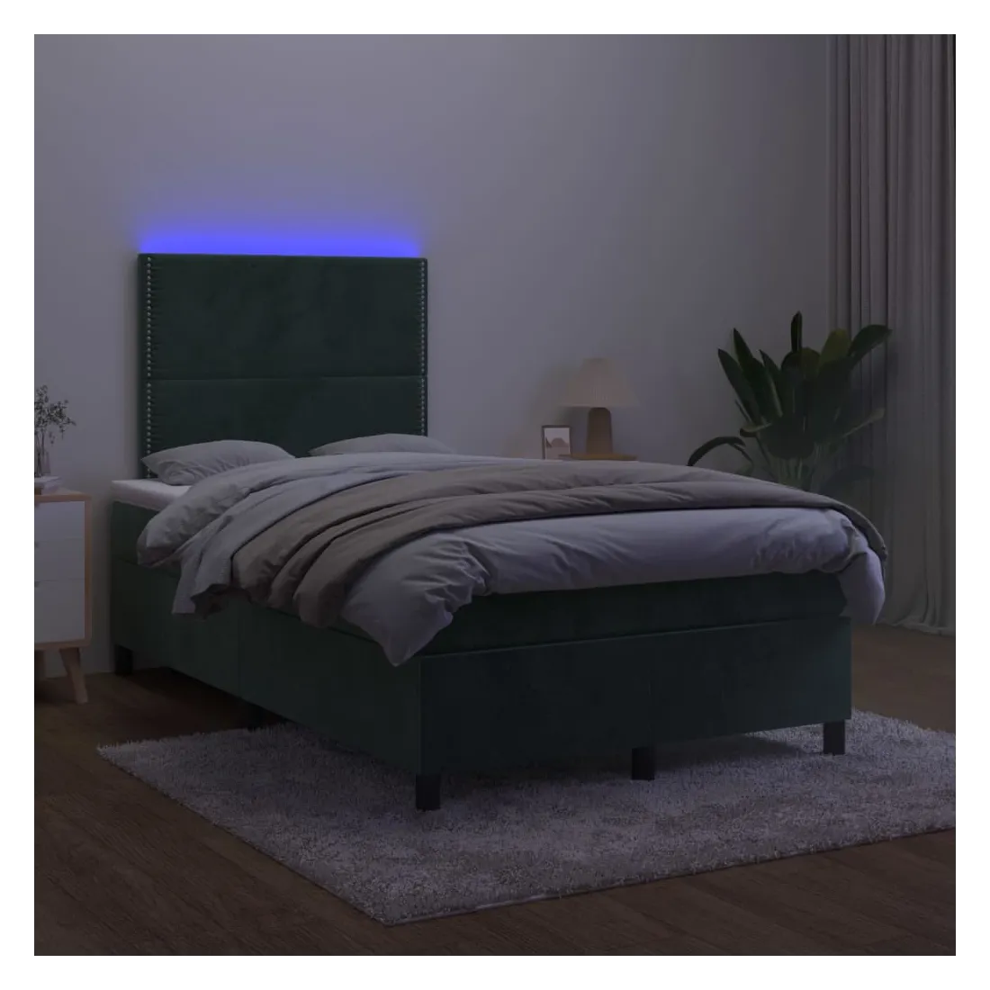 Utilisez ce sommier tapissier avec matelas et LED pour profiter d'un sommeil réparateur ! C'est le point central de votre chambre à coucher. Velours doux : le velours est un tissu doux et luxueux qui se reconnaît à son tas dense de fibres uniformément coupées qui ont une touche lisse. Le tissu en velours présente un toucher doux distinctif, ce qui le rend confortable au toucher.Tête de lit pratique : la tête de lit est réglable en hauteur selon vos préférences. La tête de lit vous offre un excellent soutien du dos lorsque vous êtes assis dans votre lit pour lire ou regarder la télévision.Bande LED colorée : apportez de l'éclairage dans l'obscurité avec des lumières LED colorées !Matelas à ressorts ensachés : le ressort ensaché individuel intégré est connu pour sa très haute qualité tout en assurant un haut niveau de durabilité et d'adaptabilité. Il peut absorber efficacement le bruit et les chocs causés par les sauts et les rotations.Protège-matelas doux pour la peau : le protège-matelas est recouvert d'un tissu résistant et doux pour la peau, ce qui le rend souple et confortable. Remarque :Pour des raisons d'hygiène, le matelas ne peut pas être retourné si l'emballage est retiré ou ouvert.Seule la partie avec un symbole de ciseaux peut être coupée et seule la partie avec l'USB continuera à fonctionner comme avant.Chaque produit est livré avec un manuel de montage dans la boîte pour un montage facile.Ce produit est doté d'un connecteur USB, mais la source d'alimentation certifiée de USB 5V n'est pas incluse.