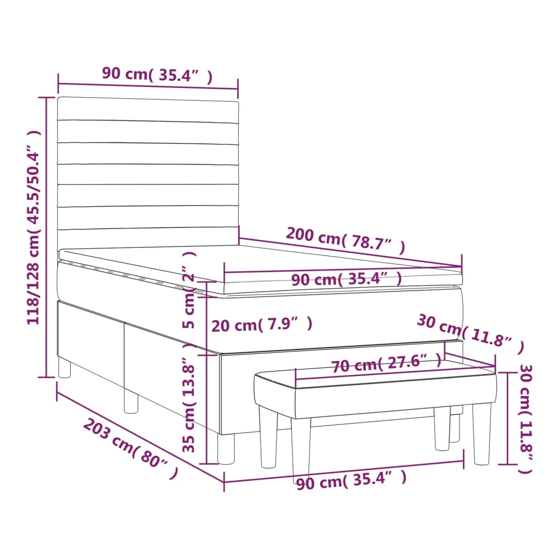 - Dimensions: 203 x 90 x 118/128 cm (L x l x H)