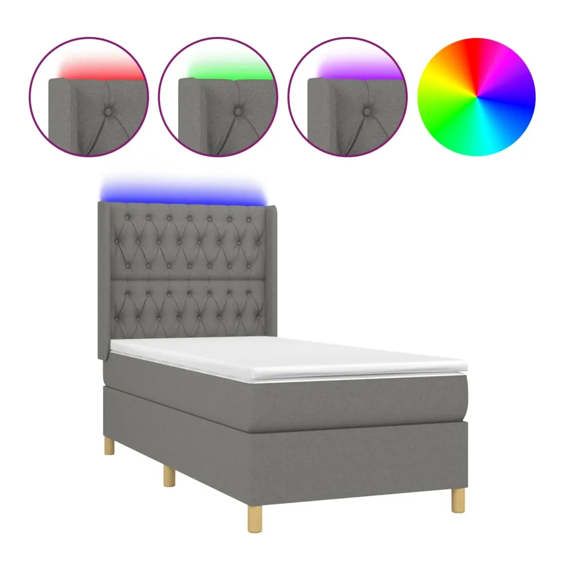 Utilisez ce sommier tapissier avec matelas et LED pour profiter d'un sommeil réparateur ! C'est le point central de votre chambre à coucher. Tissu durable : le tissu présente un aspect simple et épuré, et il est respirant et durable.Tête de lit pratique : la tête de lit est réglable en hauteur selon vos préférences. La tête de lit vous offre un excellent soutien du dos lorsque vous êtes assis dans votre lit pour lire ou regarder la télévision.Bande LED colorée : apportez de l'éclairage dans l'obscurité avec des lumières LED colorées !Matelas à ressorts ensachés : le ressort ensaché individuel intégré est connu pour sa très haute qualité tout en assurant un haut niveau de durabilité et d'adaptabilité. Il peut absorber efficacement le bruit et les chocs causés par les sauts et les rotations.Protège-matelas doux pour la peau : le protège-matelas est recouvert d'un tissu résistant et doux pour la peau, ce qui le rend souple et confortable. Remarque :Pour des raisons d'hygiène, le matelas ne peut pas être retourné si l'emballage est retiré ou ouvert.Seule la partie avec un symbole de ciseaux peut être coupée et seule la partie avec l'USB continuera à fonctionner comme avant.Chaque produit est livré avec un manuel de montage dans la boîte pour un montage facile.Ce produit est doté d'un connecteur USB, mais la source d'alimentation certifiée de USB 5V n'est pas incluse.