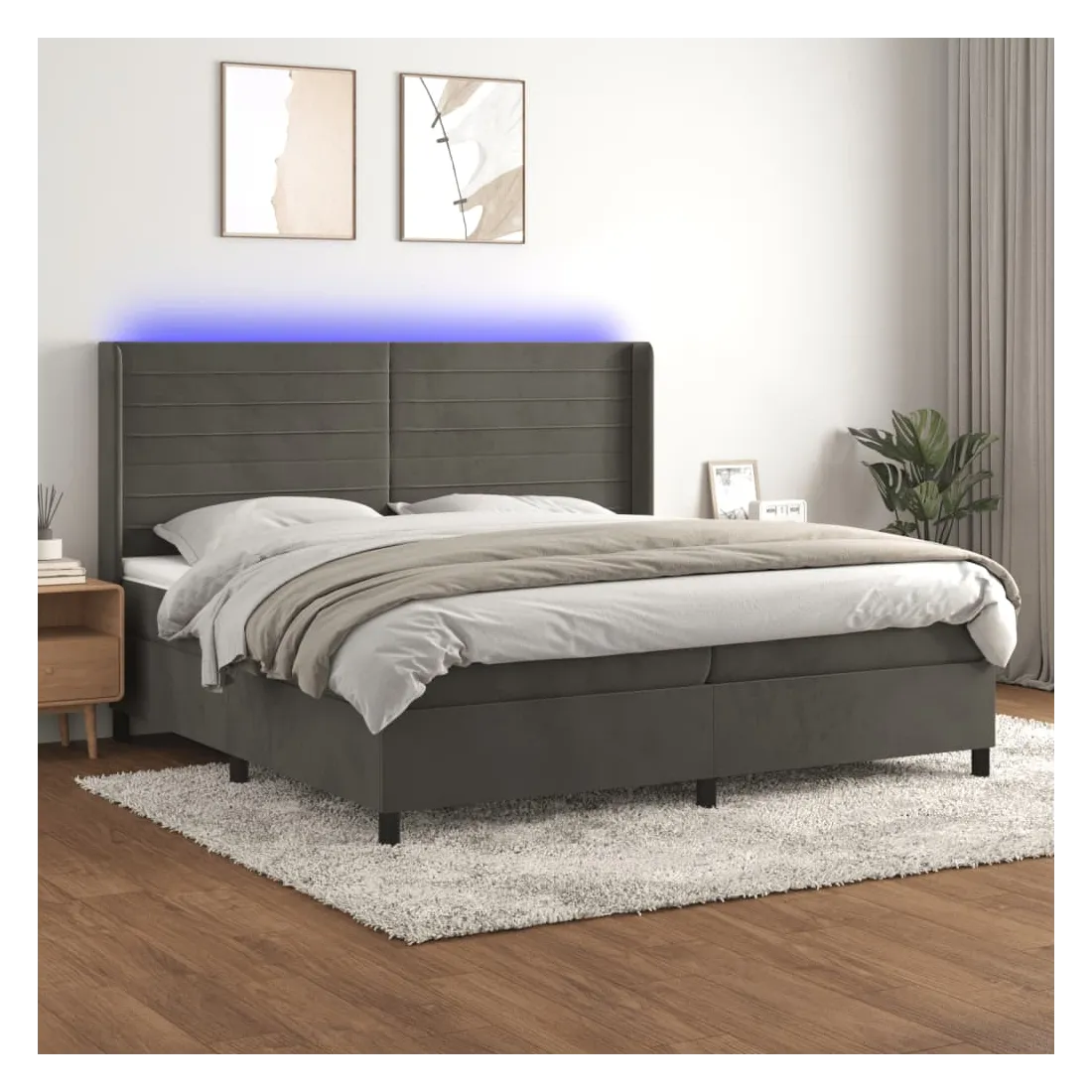 Utilisez ce sommier tapissier avec matelas et LED pour profiter d'un sommeil réparateur ! C'est le point central de votre chambre à coucher. Velours doux : le velours est un tissu doux et luxueux qui se reconnaît à son tas dense de fibres uniformément coupées qui ont une touche lisse. Le tissu en velours présente un toucher doux distinctif, ce qui le rend confortable au toucher.Tête de lit pratique : la tête de lit est réglable en hauteur selon vos préférences. La tête de lit vous offre un excellent soutien du dos lorsque vous êtes assis dans votre lit pour lire ou regarder la télévision.Bande LED colorée : apportez de l'éclairage dans l'obscurité avec des lumières LED colorées !Matelas à ressorts ensachés : le ressort ensaché individuel intégré est connu pour sa très haute qualité tout en assurant un haut niveau de durabilité et d'adaptabilité. Il peut absorber efficacement le bruit et les chocs causés par les sauts et les rotations.Protège-matelas doux pour la peau : le protège-matelas est recouvert d'un tissu résistant et doux pour la peau, ce qui le rend souple et confortable. Remarque :Pour des raisons d'hygiène, le matelas ne peut pas être retourné si l'emballage est retiré ou ouvert.Seule la partie avec un symbole de ciseaux peut être coupée et seule la partie avec l'USB continuera à fonctionner comme avant.Chaque produit est livré avec un manuel de montage dans la boîte pour un montage facile.Ce produit est doté d'un connecteur USB, mais la source d'alimentation certifiée de USB 5V n'est pas incluse.