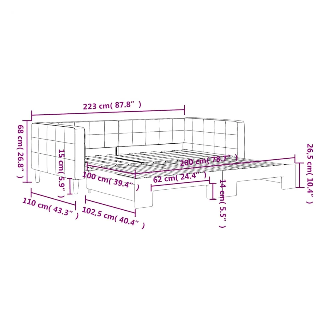 - Dimensions (non déployé) : 223 x 110 x 68 cm (L x l x H)
