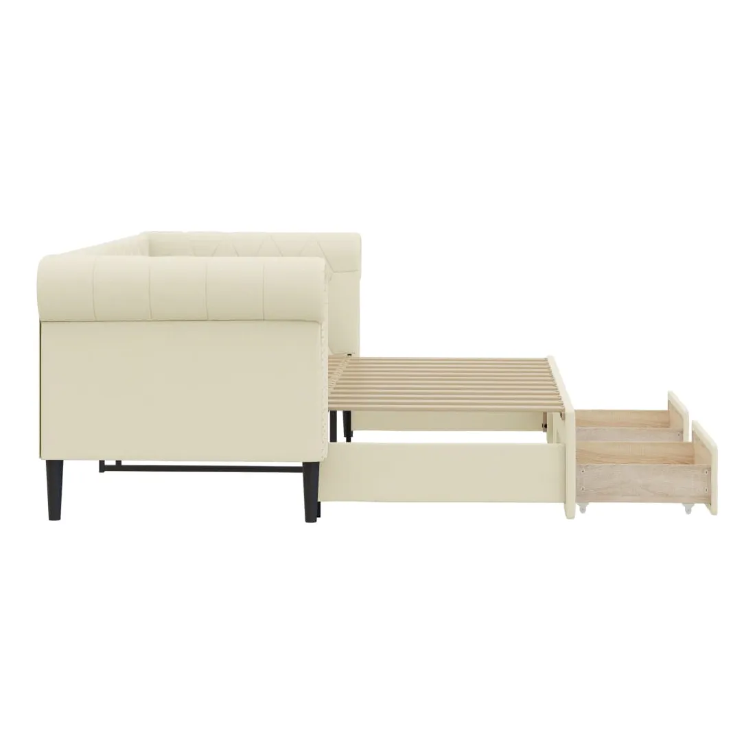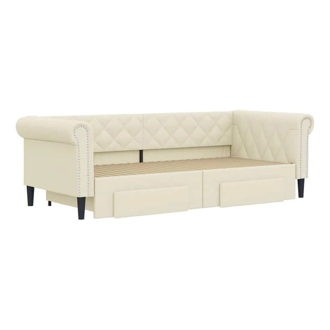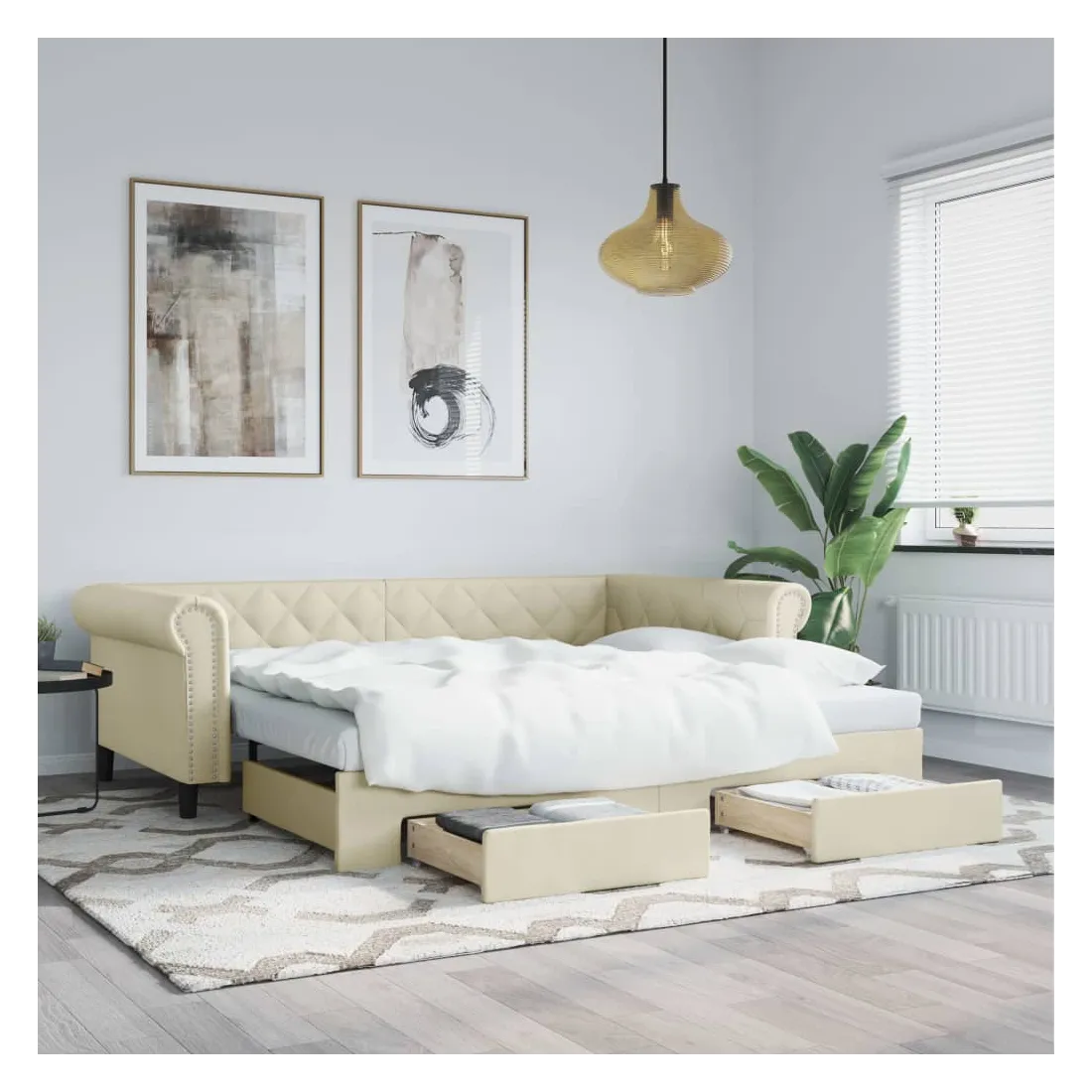 Ce lit de repos 2 en 1 avec lit gigogne, servant à la fois de canapé et de lit, constitue un supplément pratique et accrocheur à votre salon ou chambre à coucher. Lit de repos polyvalent : le canapé-lit fonctionne comme un canapé pendant la journée et se transforme facilement en lit double la nuit en retirant le lit gigogne, offrant une solution pratique pour accueillir des invités et maximiser l'espace.Grand espace de rangement : ce lit d'appoint dispose de deux tiroirs à roulettes qui offrent suffisamment d'espace pour ranger vos vêtements, chaussettes, jouets, coussins, etc.Similicuir durable et construction solide : ce canapé-lit a une structure robuste en bois et en métal et est recouvert d'un similicuir durable et facile à nettoyer.Design moderne : le canapé-lit a un design moderne qui présente des lignes épurées, un aspect minimaliste, ainsi que de la lumière naturelle, et ajoutera un style moderne à votre intérieur ! Bon à savoir :Les matelas ne sont pas inclus avec ce lit. Nous proposons une sélection variée de matelas. Vous pouvez consulter notre boutique pour trouver les matelas assortis.