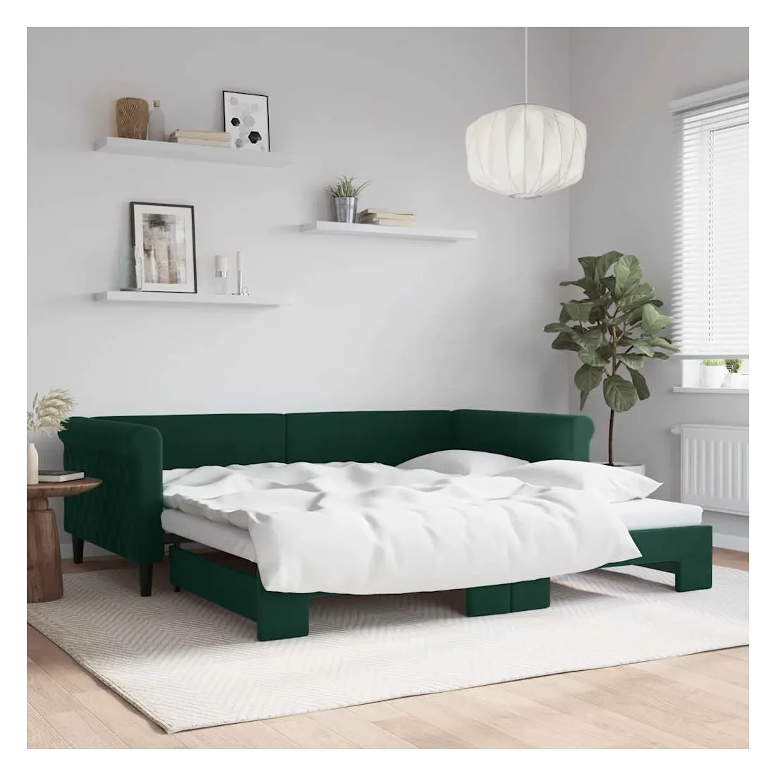 Ce lit de repos 2 en 1 avec lit gigogne, servant à la fois de canapé et de lit, constitue un supplément pratique et accrocheur à votre salon ou chambre à coucher. Lit de repos polyvalent : le canapé-lit fonctionne comme un canapé pendant la journée et se transforme facilement en lit double la nuit en retirant le lit gigogne, offrant une solution pratique pour accueillir des invités et maximiser l'espace.Velours doux et construction solide : ce canapé-lit a un cadre robuste en bois et en métal et est recouvert de velours doux et confortable.Design moderne : le canapé-lit a un design moderne qui présente des lignes épurées, un aspect minimaliste, ainsi que de la lumière naturelle, et ajoutera un style moderne à votre intérieur ! Bon à savoir :Les matelas ne sont pas inclus avec ce lit. Nous proposons une sélection variée de matelas. Vous pouvez consulter notre boutique pour trouver les matelas assortis.