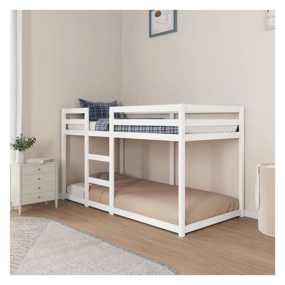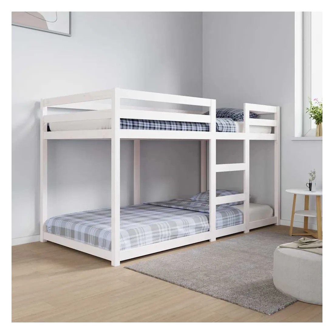 Ce lit superposé en bois est élégant et fonctionnel, ce qui en fait un supplément parfait à toute pièce dont l'espace est limité. Bois de pin massif : le bois de pin massif est un matériau naturel magnifique. Le bois de pin a un grain droit et les nœuds donnent au matériau son aspect caractéristique et rustique.Design sûr : le lit surélevé est conçu dans un souci de sécurité. Il comprend des garde-corps qui empêchent l'utilisateur de rouler pendant son sommeil.Convient aux espaces limités : le cadre de lit est un excellent choix pour toute pièce dont l'espace est limité, il fournit deux lits individuels avec un design compact. Bon à savoir :La livraison comprend uniquement un cadre de lit. Le matelas n'est pas inclus. Vous pouvez consulter notre boutique pour trouver les matelas assortis.