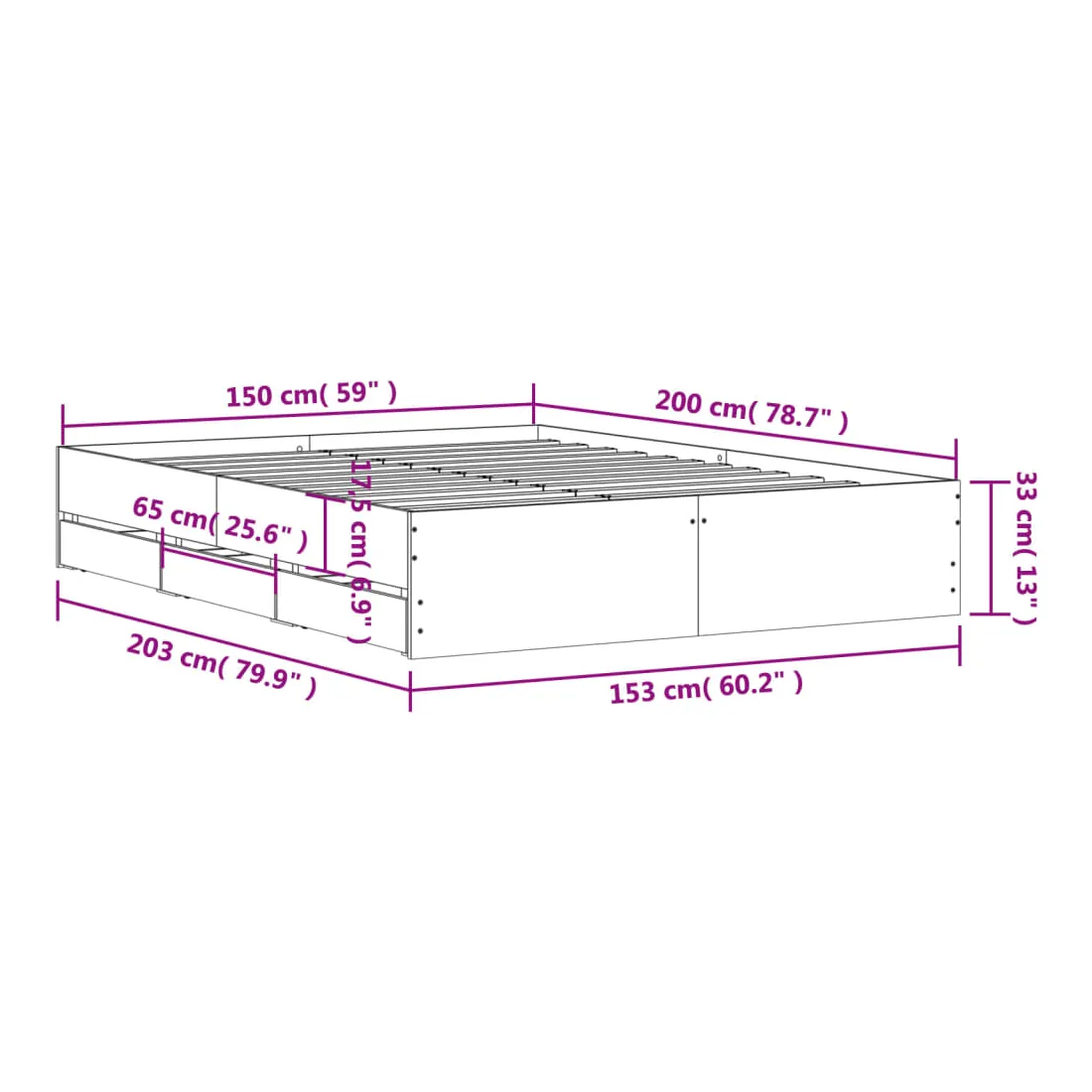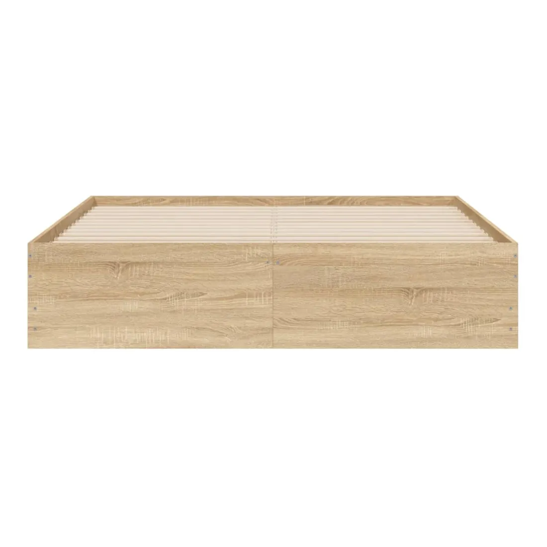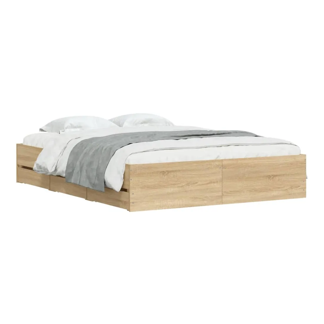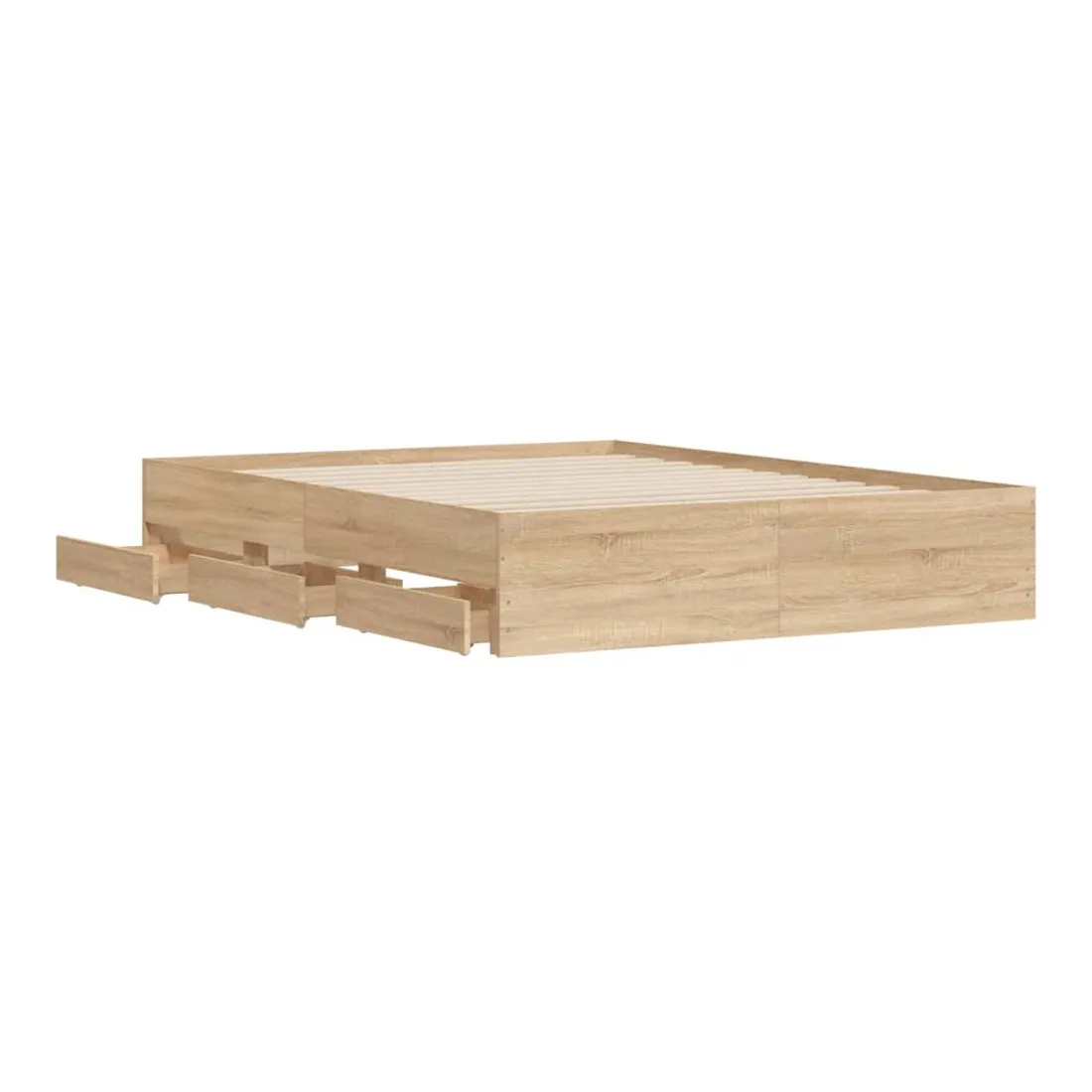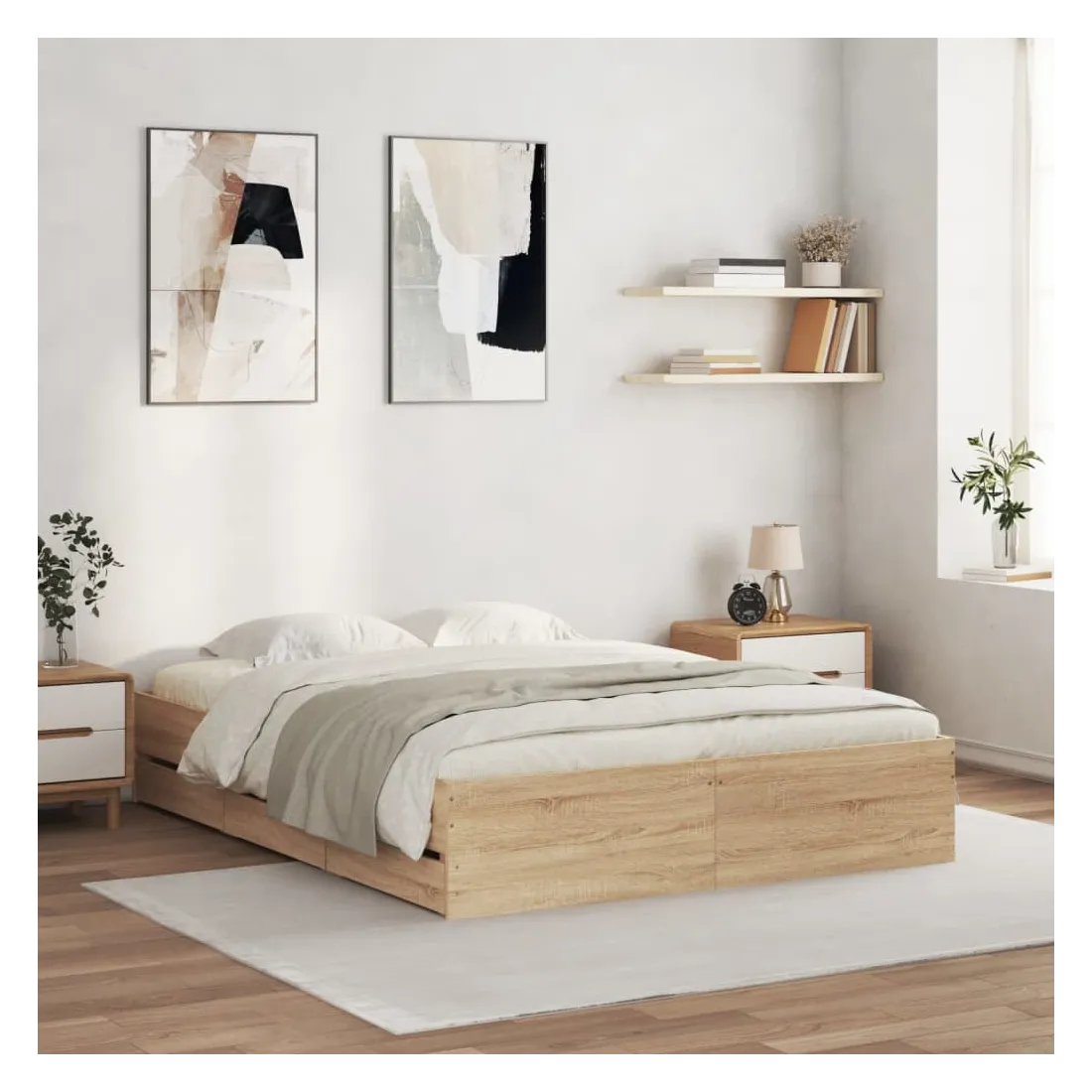 Ajoutez une touche moderne à votre chambre à coucher avec ce cadre de lit avec tiroirs ! Il apportera une touche pratique et décorative à votre espace de vie. Matériau durable : le cadre de lit est fabriquée en bois d'ingénierie. Le bois d'ingénierie est d'une qualité exceptionnelle avec une surface lisse et présente également de la résistance, de la stabilité et de la résistance à l'humidité.Lattes robustes : les lattes de contreplaqué assurent une bonne répartition du poids, garantissant que le matelas reste en place à chaque torsion de votre corps pendant le sommeil.Fonction de rangement : les tiroirs de lit inclus offrent suffisamment d'espace de rangement pour ranger vos articles essentiels, gardant votre pièce propre et bien rangée. Bon à savoir :Un matelas n'est pas inclus avec ce lit. Nous offrons une sélection variée de matelas. Vous pouvez consulter notre boutique pour trouver un matelas assorti.