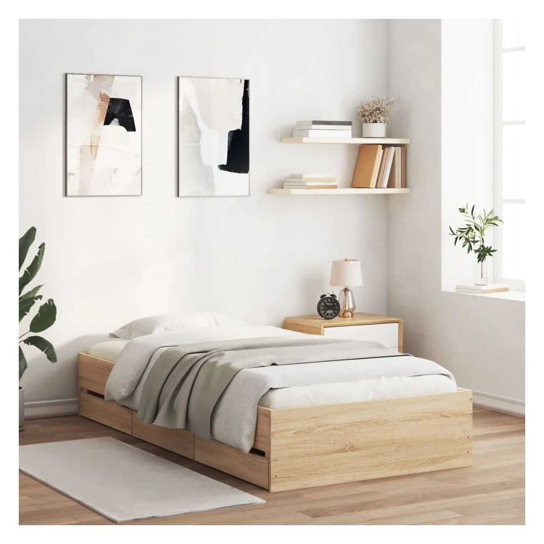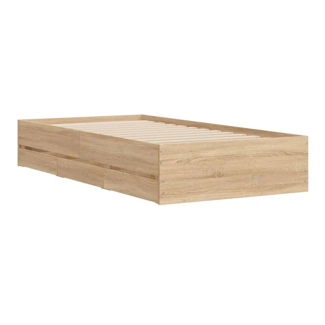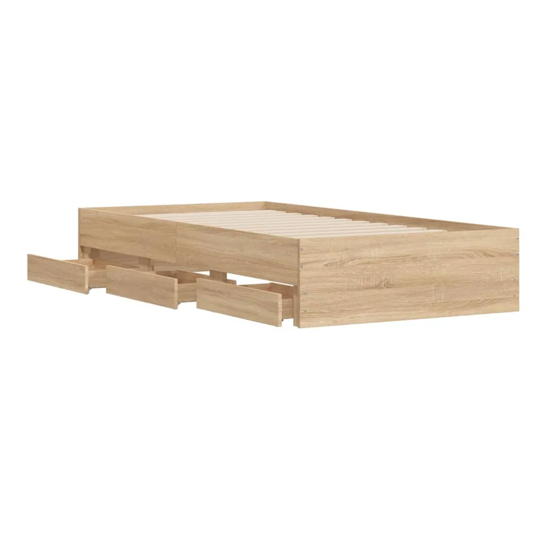 Ajoutez une touche moderne à votre chambre à coucher avec ce cadre de lit avec tiroirs ! Il apportera une touche pratique et décorative à votre espace de vie. Matériau durable : le cadre de lit est fabriquée en bois d'ingénierie. Le bois d'ingénierie est d'une qualité exceptionnelle avec une surface lisse et présente également de la résistance, de la stabilité et de la résistance à l'humidité.Lattes robustes : les lattes de contreplaqué assurent une bonne répartition du poids, garantissant que le matelas reste en place à chaque torsion de votre corps pendant le sommeil.Fonction de rangement : les tiroirs de lit inclus offrent suffisamment d'espace de rangement pour ranger vos articles essentiels, gardant votre pièce propre et bien rangée. Bon à savoir :Un matelas n'est pas inclus avec ce lit. Nous offrons une sélection variée de matelas. Vous pouvez consulter notre boutique pour trouver un matelas assorti.