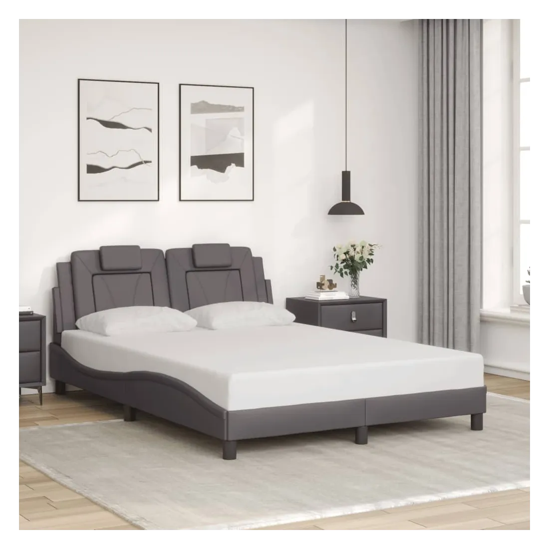 Obtenez une meilleure nuit de sommeil reposante grâce à ce cadre de lit avec tête de lit ! Il est un supplément accueillant à toute chambre à coucher. Similicuir durable : le similicuir de qualité supérieure est un matériau très durable. Il est résistant aux taches, ce qui le rend facile à nettoyer avec un chiffon humide. La surface lisse donne également un aspect luxueux et la beauté du cuir véritable.Lattes de contreplaqué : les lattes de contreplaqué assurent une bonne répartition du poids, garantissant que le matelas reste en place à chaque torsion de votre corps pendant le sommeil.Excellent soutien : l'oreiller de tête de lit est rembourré avec de la mousse pour un confort ultra doux et optimal vous offre un excellent soutien du dos lorsque vous êtes assis dans votre lit pour lire ou regarder la télévision.Design latéral ondulé : l’aspect ondulé du cadre de lit est élégant et sophistiqué, ajoutant une touche moderne et élégante à votre décor, ce qui en fait le point central de votre chambre à coucher. Bon à savoir :Un matelas n'est pas inclus avec ce lit. Nous offrons une sélection variée de matelas. Vous pouvez consulter notre boutique pour trouver un matelas assorti.