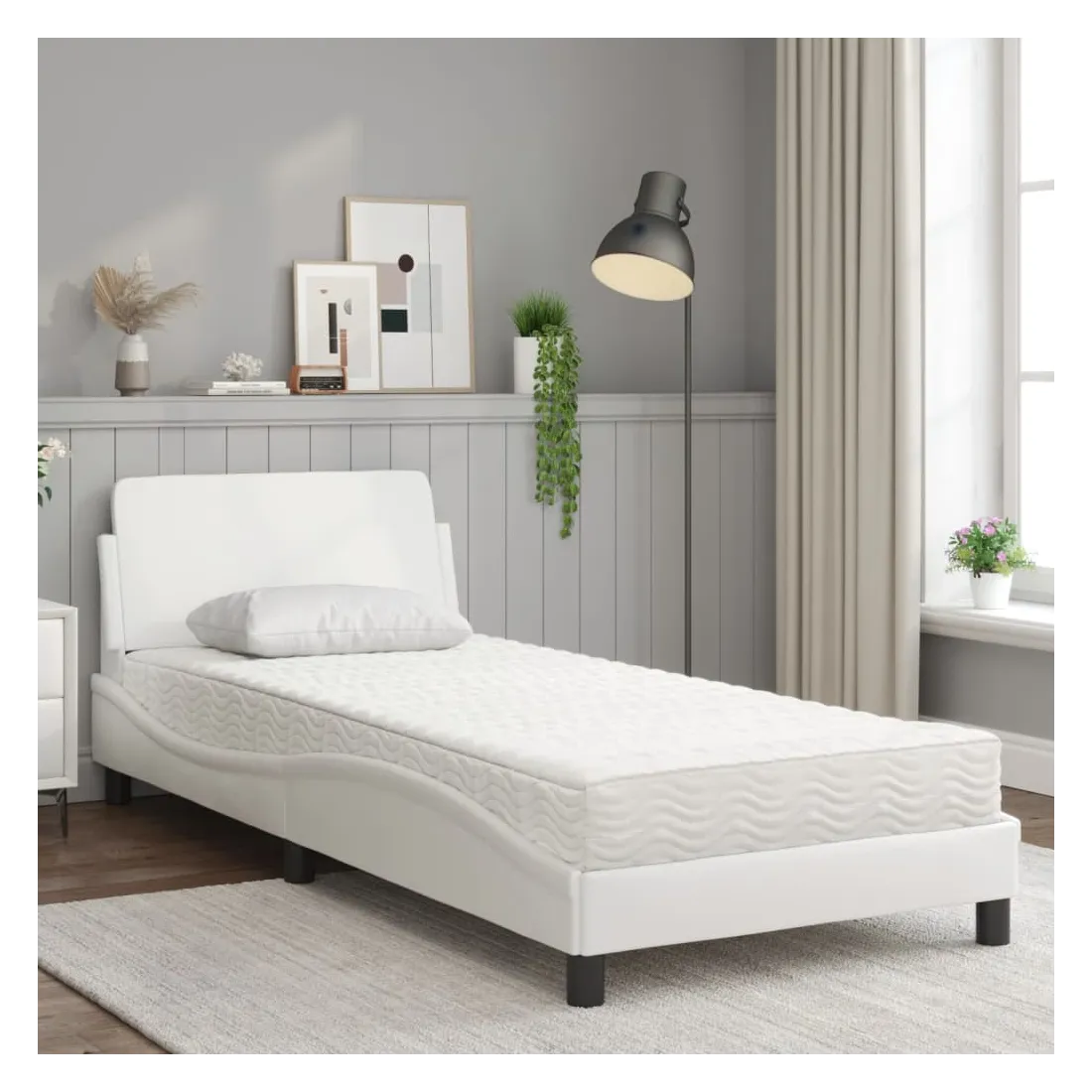 Obtenez une meilleure nuit de sommeil reposante grâce à ce lit avec matelas ! Il est un supplément accueillant à toute chambre à coucher. Similicuir durable : le similicuir de qualité supérieure est un matériau très durable. Il est résistant aux taches, ce qui le rend facile à nettoyer avec un chiffon humide. La surface lisse donne également un aspect luxueux et la beauté du cuir véritable.Lattes de contreplaqué : les lattes de contreplaqué assurent une bonne répartition du poids, garantissant que le matelas reste en place à chaque torsion de votre corps pendant le sommeil.Excellent soutien : la tête de lit vous offre un excellent soutien du dos lorsque vous êtes assis dans votre lit pour lire ou regarder la télévision.Matelas en mousse : ce matelas de lit en tissu à 3 couches est rempli de mousse PU 22D pour un confort optimal. Il contribue à soulager la fatigue et à favoriser la circulation sanguine, vous offrant ainsi une relaxation complète et une bonne qualité de sommeil. En outre, le matelas est disponible en dureté H2 et H3, de sorte que vous pouvez simplement tourner le matelas pour choisir la dureté qui vous convient le mieux.Design latéral ondulé : l’aspect ondulé du cadre de lit est élégant et sophistiqué, ajoutant une touche moderne et élégante à votre décor, ce qui en fait le point central de votre chambre à coucher.