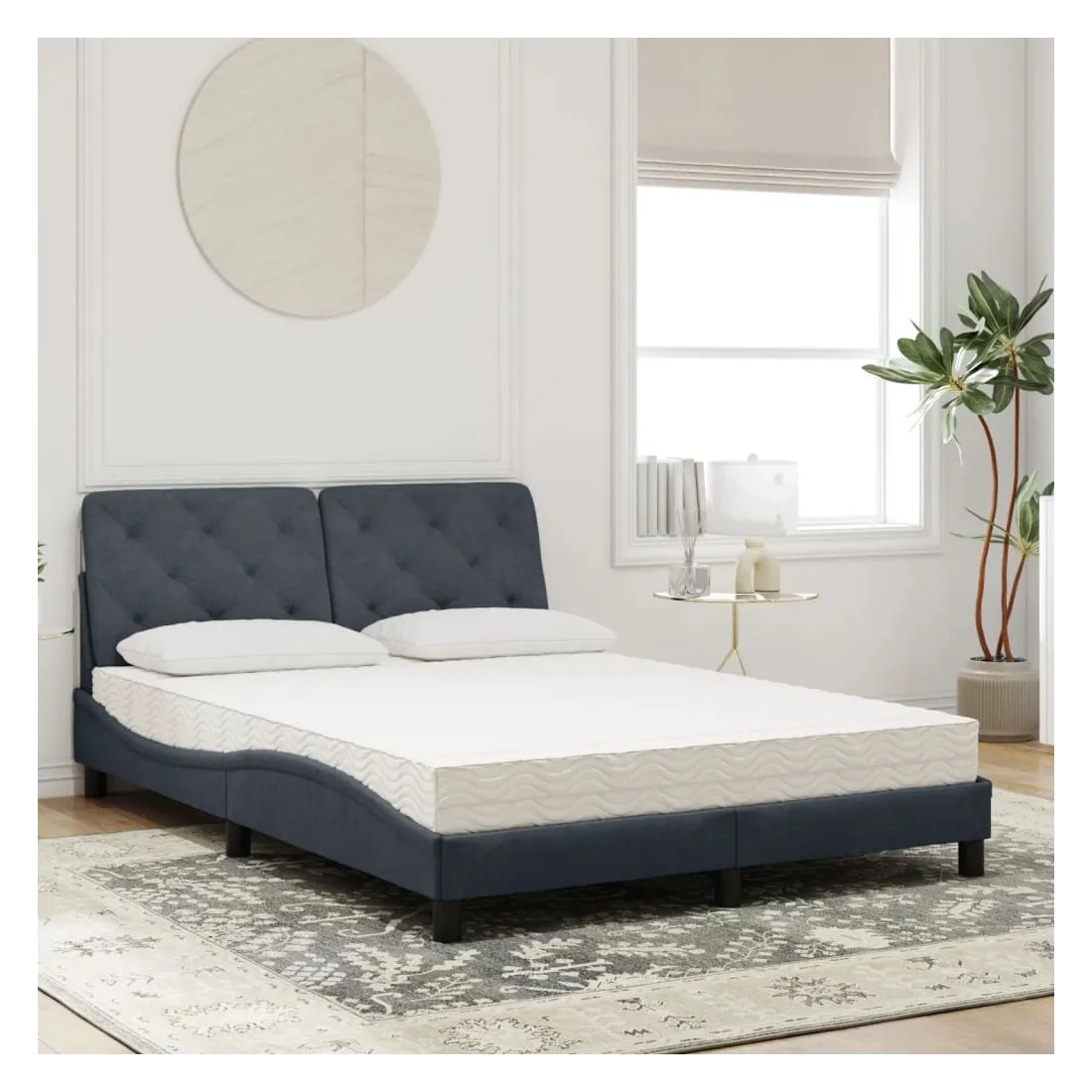 Obtenez une meilleure nuit de sommeil reposante grâce à ce lit avec matelas ! Il est un supplément accueillant à toute chambre à coucher. Velours doux : le velours est un tissu doux et confortable, agréable au toucher.Lattes de contreplaqué : les lattes de contreplaqué assurent une bonne répartition du poids, garantissant que le matelas reste en place à chaque torsion de votre corps pendant le sommeil.Excellent soutien : la tête de lit vous offre un excellent soutien du dos lorsque vous êtes assis dans votre lit pour lire ou regarder la télévision.Matelas en mousse : ce matelas de lit en tissu à 3 couches est rempli de mousse PU 22D pour un confort optimal. Il contribue à soulager la fatigue et à favoriser la circulation sanguine, vous offrant ainsi une relaxation complète et une bonne qualité de sommeil. En outre, le matelas est disponible en dureté H2 et H3, de sorte que vous pouvez simplement tourner le matelas pour choisir la dureté qui vous convient le mieux.Design latéral ondulé : l’aspect ondulé du cadre de lit est élégant et sophistiqué, ajoutant une touche moderne et élégante à votre décor, ce qui en fait le point central de votre chambre à coucher.