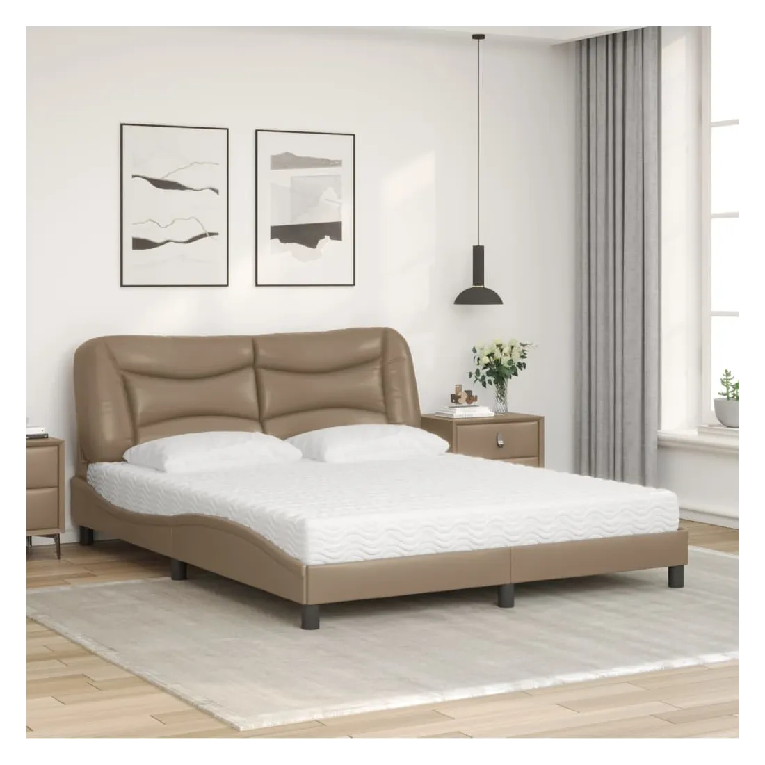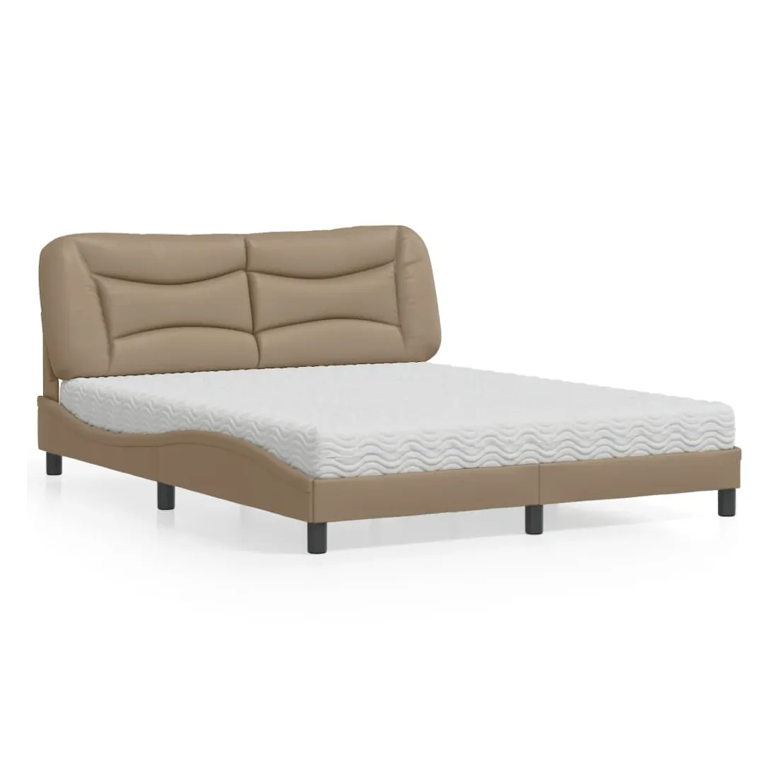 Obtenez une meilleure nuit de sommeil reposante grâce à ce lit avec matelas ! Il est un supplément accueillant à toute chambre à coucher. Similicuir durable : le similicuir de qualité supérieure est un matériau très durable. Il est résistant aux taches, ce qui le rend facile à nettoyer avec un chiffon humide. La surface lisse donne également un aspect luxueux et la beauté du cuir véritable.Lattes de contreplaqué : les lattes de contreplaqué assurent une bonne répartition du poids, garantissant que le matelas reste en place à chaque torsion de votre corps pendant le sommeil.Excellent soutien : la tête de lit vous offre un excellent soutien du dos lorsque vous êtes assis dans votre lit pour lire ou regarder la télévision.Matelas en mousse : ce matelas de lit en tissu à 3 couches est rempli de mousse PU 22D pour un confort optimal. Il contribue à soulager la fatigue et à favoriser la circulation sanguine, vous offrant ainsi une relaxation complète et une bonne qualité de sommeil. En outre, le matelas est disponible en dureté H2 et H3, de sorte que vous pouvez simplement tourner le matelas pour choisir la dureté qui vous convient le mieux.Design latéral ondulé : l’aspect ondulé du cadre de lit est élégant et sophistiqué, ajoutant une touche moderne et élégante à votre décor, ce qui en fait le point central de votre chambre à coucher.